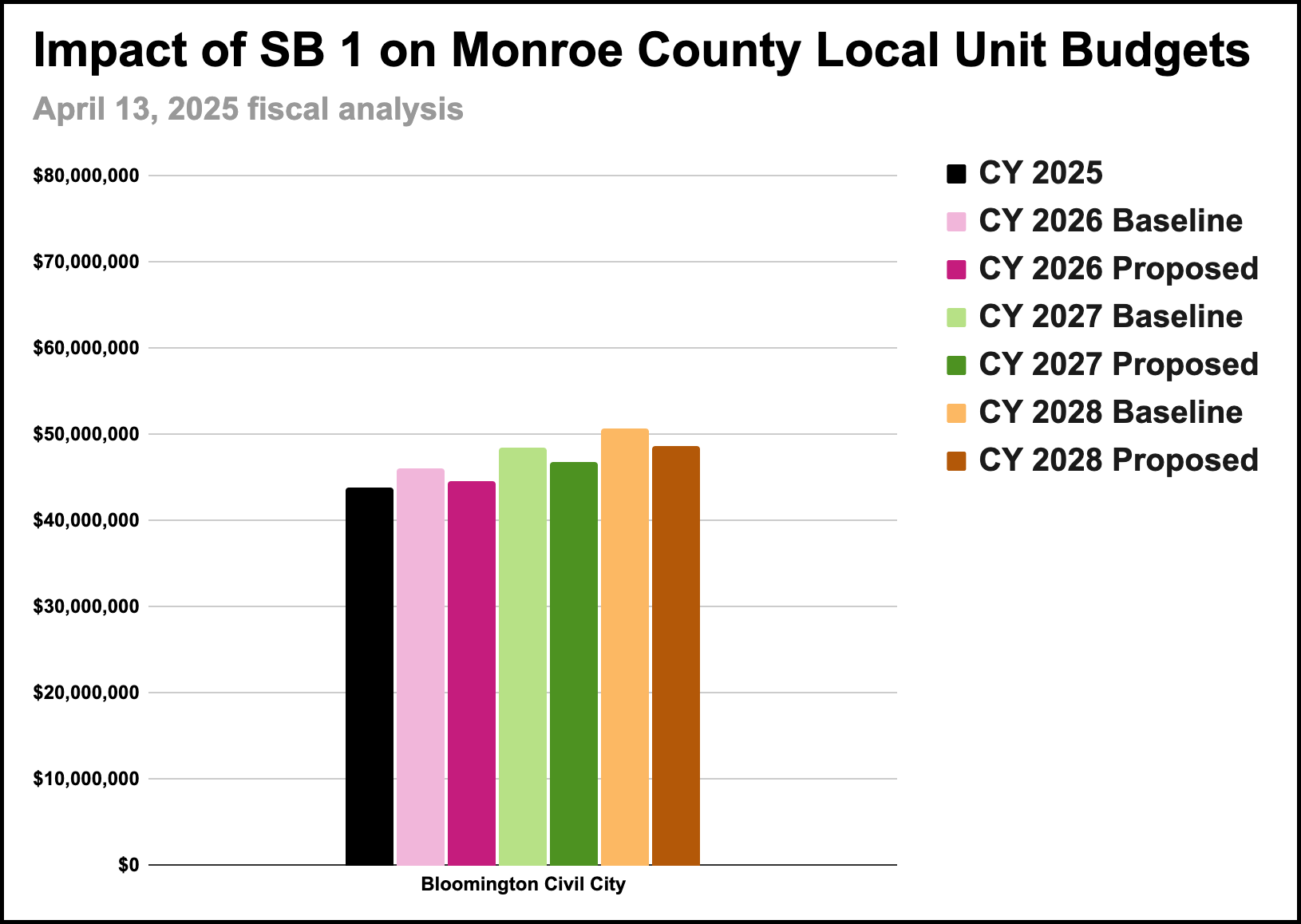 A more detailed analysis of an earlier version with numbers broken down by governmental unit, showed the city of Bloomington down about $1.4 million (3.2%) in 2026, from a baseline of $46,111,291.