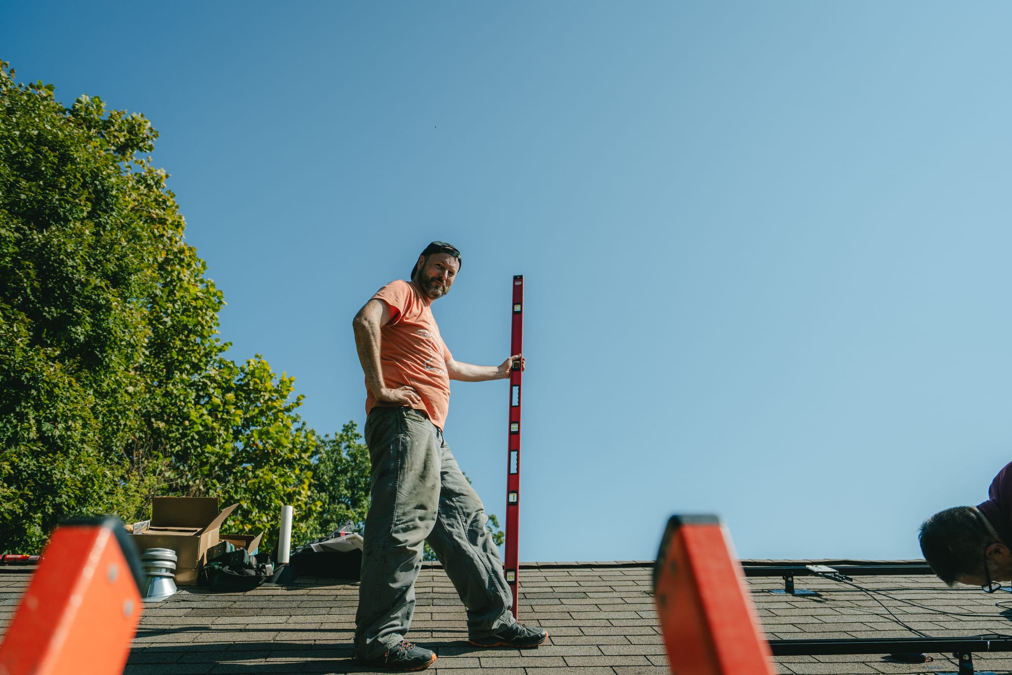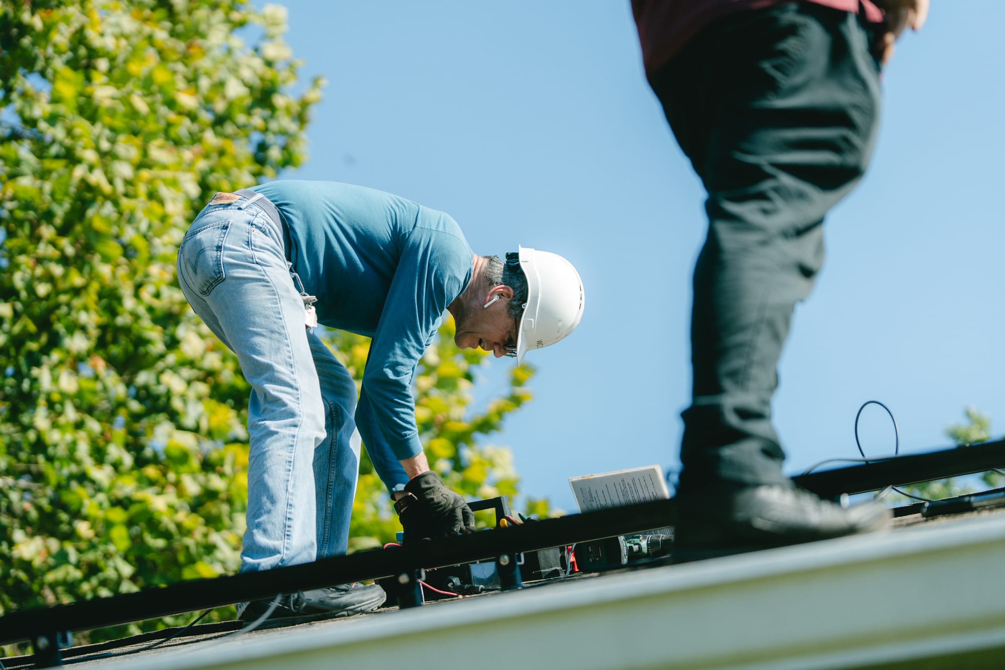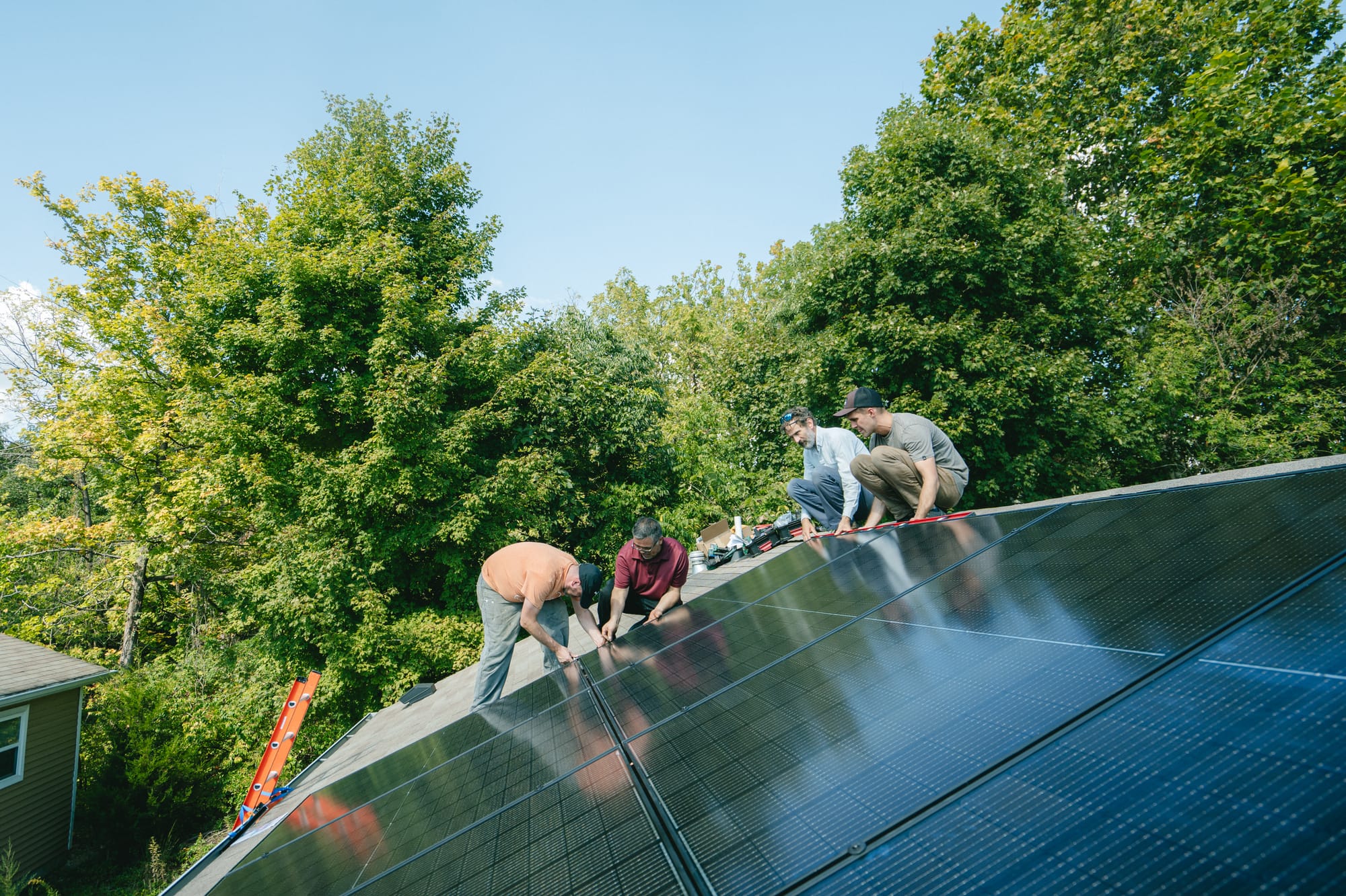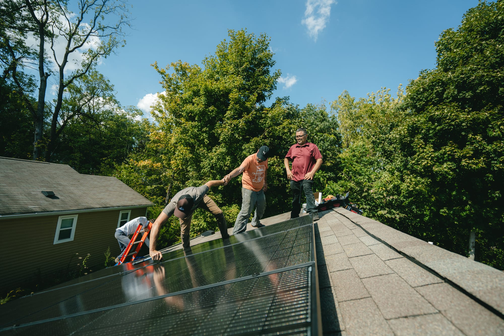 Amy Fender, who is the recipient of Indiana Solar for All's 50th solar panel installation, and Karen Lopez, who is in line to receive the next solar panel system, lift a panel up to Gerardo Osorio Gomez and Josh Cisner on the roof. (Kelton O'Connell, Oct. 4, 2025)