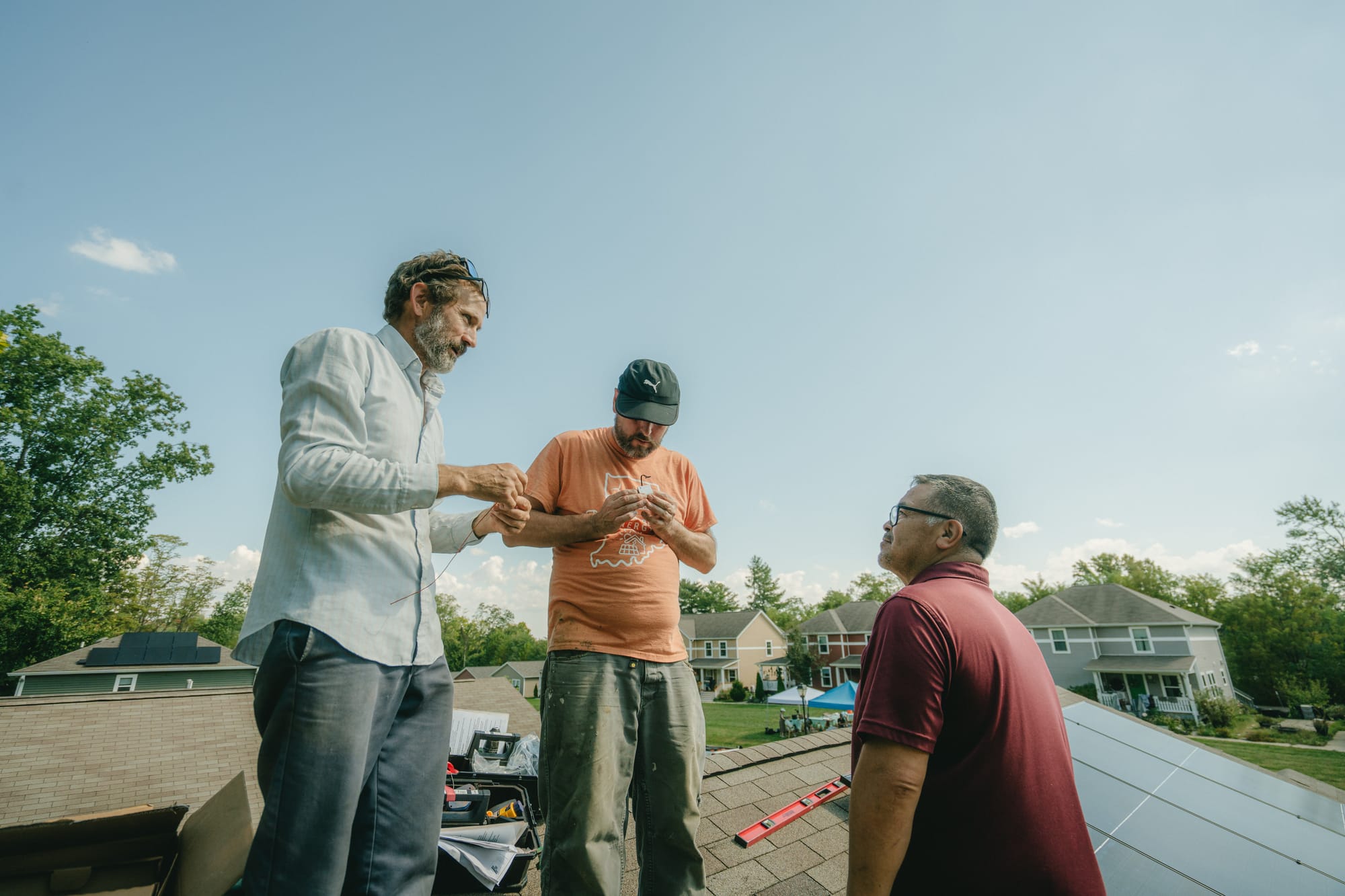 The roof crew works on the home for INSFA’s 50th solar panel installation. (Kelton O'Connell, Oct. 4, 2025)Equipment in front of Amy Fender's house, the site of INSFA’s 50th solar panel installation. (Kelton O'Connell, Oct. 4, 2025)Nick Venstra, a member of the electrical crew, examines a doodad with another crew member on Saturday at INSFA’s 50th installation. (Kelton O'Connell, Oct. 4, 2025)Indiana Solar for All volunteer coordinator Stacey Decker speaks with Amy Fender. (Kelton O'Connell, Oct. 4, 2025)Woodie Bessler, Indiana Solar for All program director, works on the roof during the organization's 50th solar panel installation. (Kelton O'Connell, Oct. 4, 2025)Colin Norris stands ready on the roof during 50th solar panel installation by Indiana Solar for All. “I'm supervising,” he joked after this photo was taken. (Kelton O'Connell, Oct. 4, 2025)Jerry Fender signs the installation's final panel before it goes up. (Kelton O'Connell, Oct. 4, 2025)Daughters of the family set to receive INSFA’s next solar panel system sign the last panel to go up. (Courtesy photo, Oct. 4, 2025)To celebrate the 50th solar panel installation by Indiana Solar for All, the final solar panel was signed by many of the volunteers. (Kelton O'Connell, Oct. 4, 2025)Greg Deemer, Colin Norris, and Gerardo Osorio Gomez on the roof, working on Saturday's Indiana Solar for All solar panel installation. (Kelton O'Connell, Oct. 4, 2025)Colin Norris, Gerardo Osorio Gomez, Greg Deemer, and Josh Cisney on the roof, working on the solar panel installation. (Kelton O'Connell, Oct. 4, 2025)Crew members finish the 50th solar panel installation for Indiana Solar for All. (Kelton O'Connell, Oct. 4, 2025)Josh Cisney secures the final solar panel for the 50th installation by Indiana Solar for All, as Colin Norris anchors him. (Kelton O'Connell, Oct. 4, 2025)Josh Cisney and Greg Deemer inspect the roof after Saturday's solar panel installation. (Kelton O'Connell, Oct. 4, 2025)Bill Todd speaks to Colin Norris and Woodie Bessler during Saturday’s solar panel installation. Todd, a tax equity investor, funded the materials for this installation using federal tax credits. He funded a previous installation this year, and plans to do so for two more before the end of 2025. (Kelton O'Connell, Oct. 4, 2025)Patricia Lopes, a previous Indiana Solar for All recipient, expressed her gratitude for the program during the celebration event. “I don't think I could have made it through winters, especially this past year's, if I did not have solar,” Lopes said at the mic. She was able to afford heating in the winter, she said, thanks to her solar panels. “That's what allowed me to pay the bills, so I'm very grateful to have this installed in my home,” she said. “It means, to me, the ability to actually stay at my home. So thank you.” (Kelton O'Connell, Oct. 4, 2025)Angela Gabriel, a previous Indiana Solar for All recipient, hugs Kathleen Boggess, an INSFA steering group member. (Kelton O'Connell, Oct. 4, 2025)