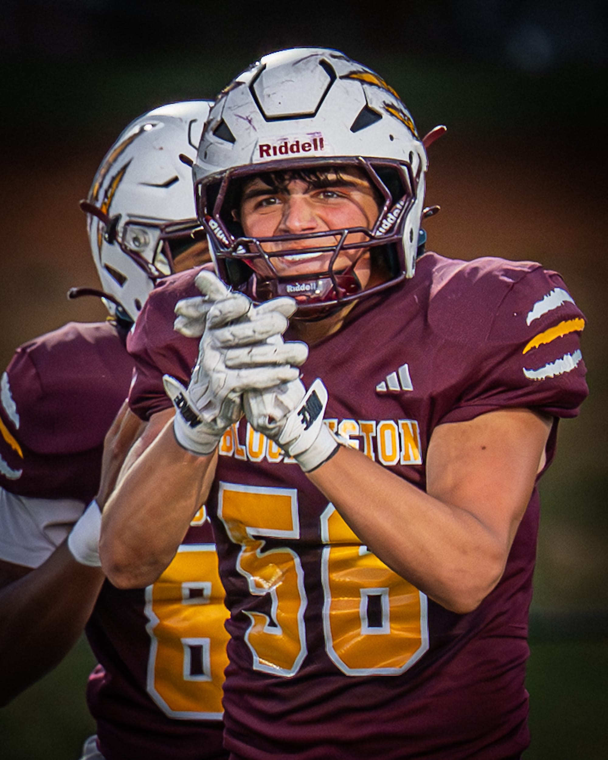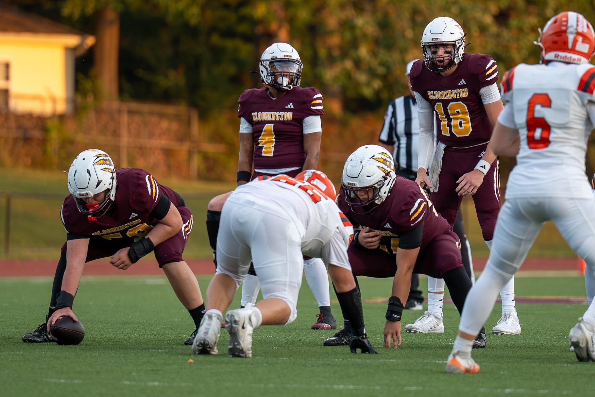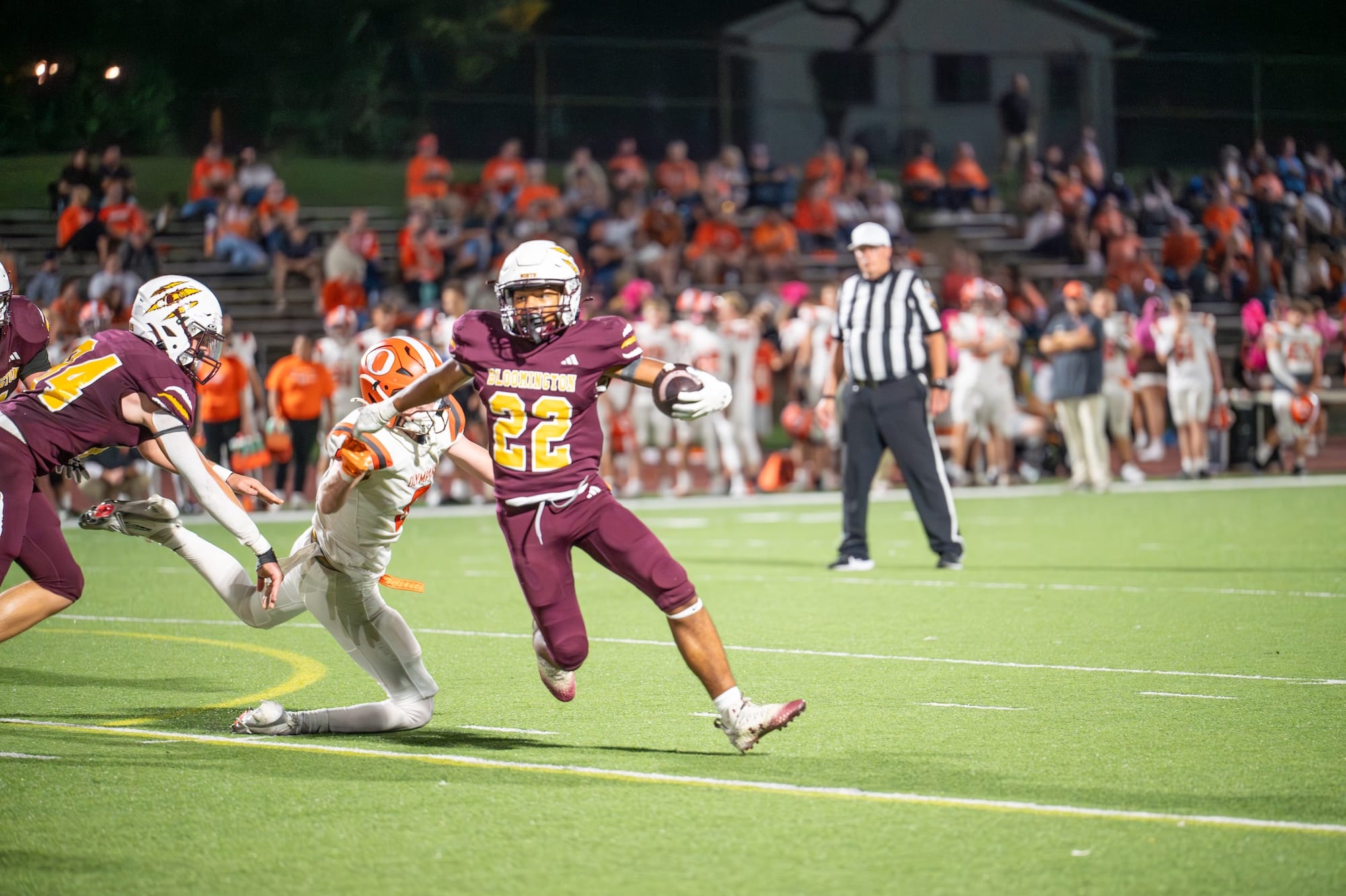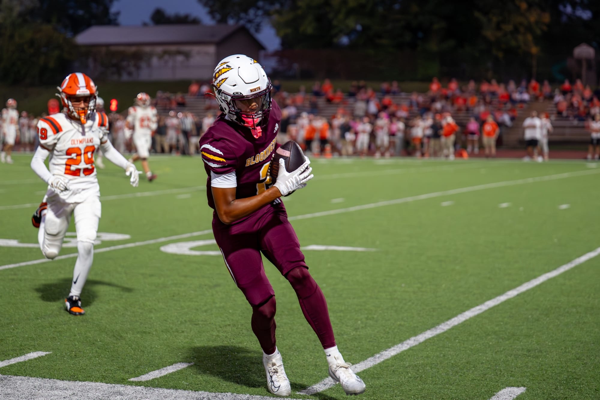 Kellen Bishop (7) scores after a pick-six. (Amy Mason, Oct. 4, 2025)The team rushes to celebrate with Bishop (7) after his interception return for a touchdown. (Amy Mason, Oct. 4, 2025)Nate Walker (2) catches the pass while keeping his big right toe from going out of bounds. (Amy Mason, Oct. 4, 2025)Luke Freel (5) weaves his way through Olympian defenders. (Amy Mason, Oct. 4, 2025)Zach Barrow (9) prevents Columbus East from scoring. (Amy Mason, Oct. 4, 2025)Adis Hamidovic (56) pumps up the crowd after a sack. (Amy Mason, Oct. 4, 2025)Sophomore center Garrett Fishel (50) waits to snap the ball while quarterback John Bargen (18) calls the play. (Amy Mason, Oct. 4, 2025)Lucas Rice (42) roars in celebration. (Amy Mason, Oct. 4, 2025)Tight End Hunter Chitwood (84) is able to gain yardage after a screen by James Mason (54). (Amy Mason, Oct. 4, 2025)Noah Ferree (32) pushes through to score. (Amy Mason, Oct. 4, 2025)Carter Matthews (22) escapes the Olympian tackler. (Amy Mason, Oct. 4, 2025)It was Youth Cheer Clinic Night at the Bloomington High School North football game. (Amy Mason, Oct. 4, 2025)Nate Walker’s little sister, Ava, joins the cheer squad for Youth Cheer Clinic Night. (Amy Mason, Oct. 4, 2025)