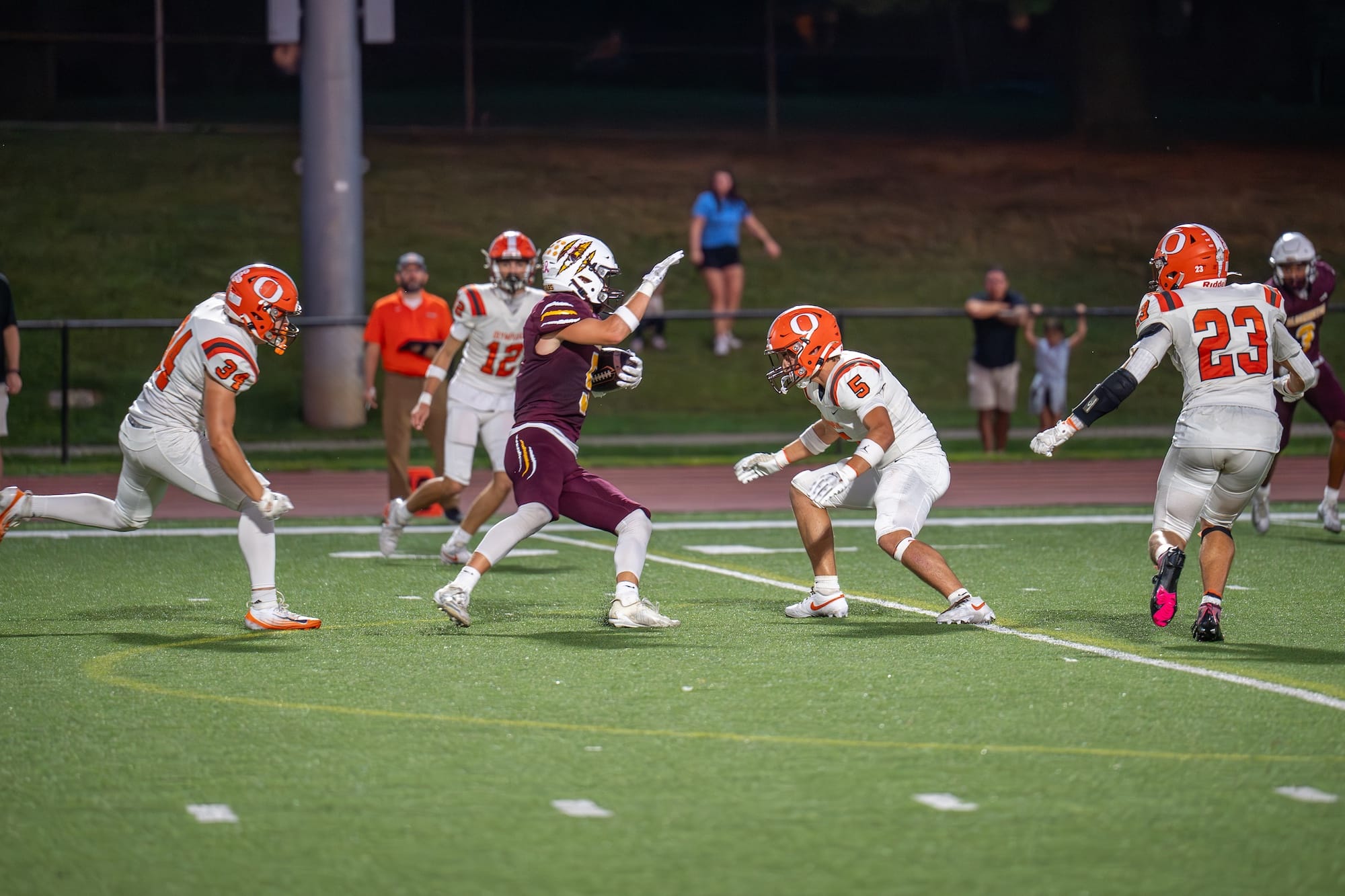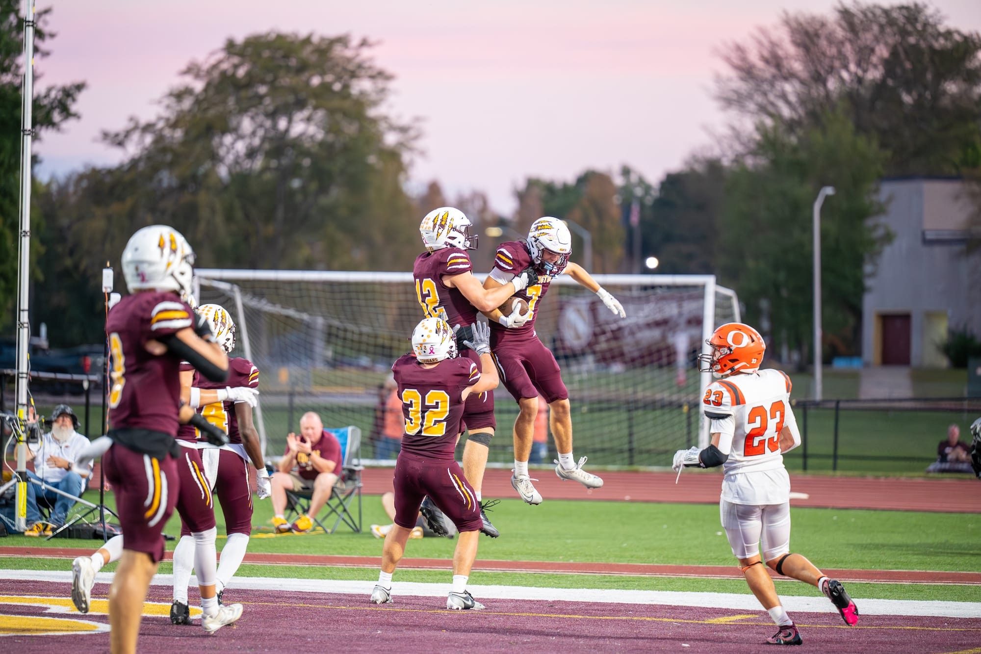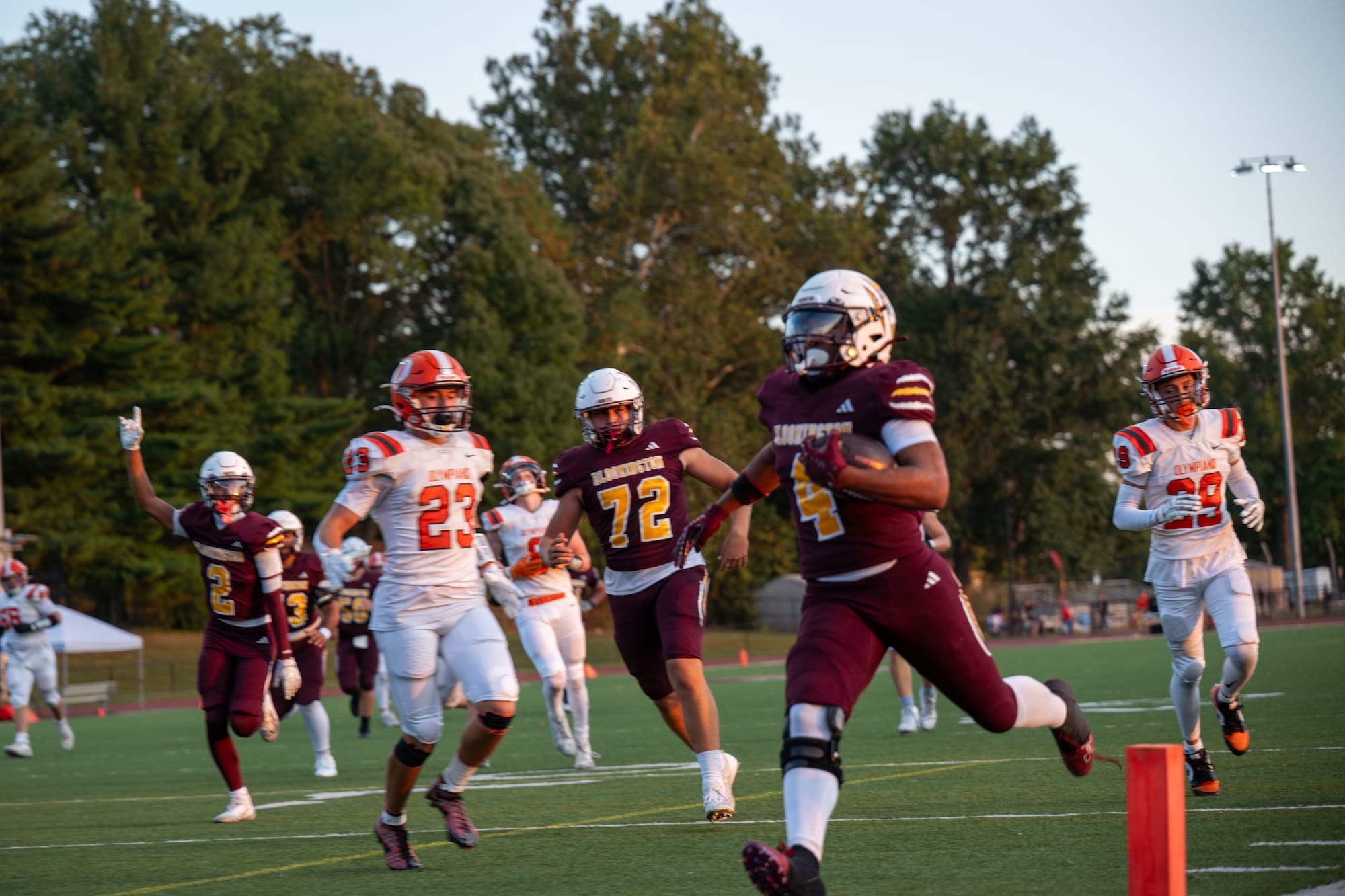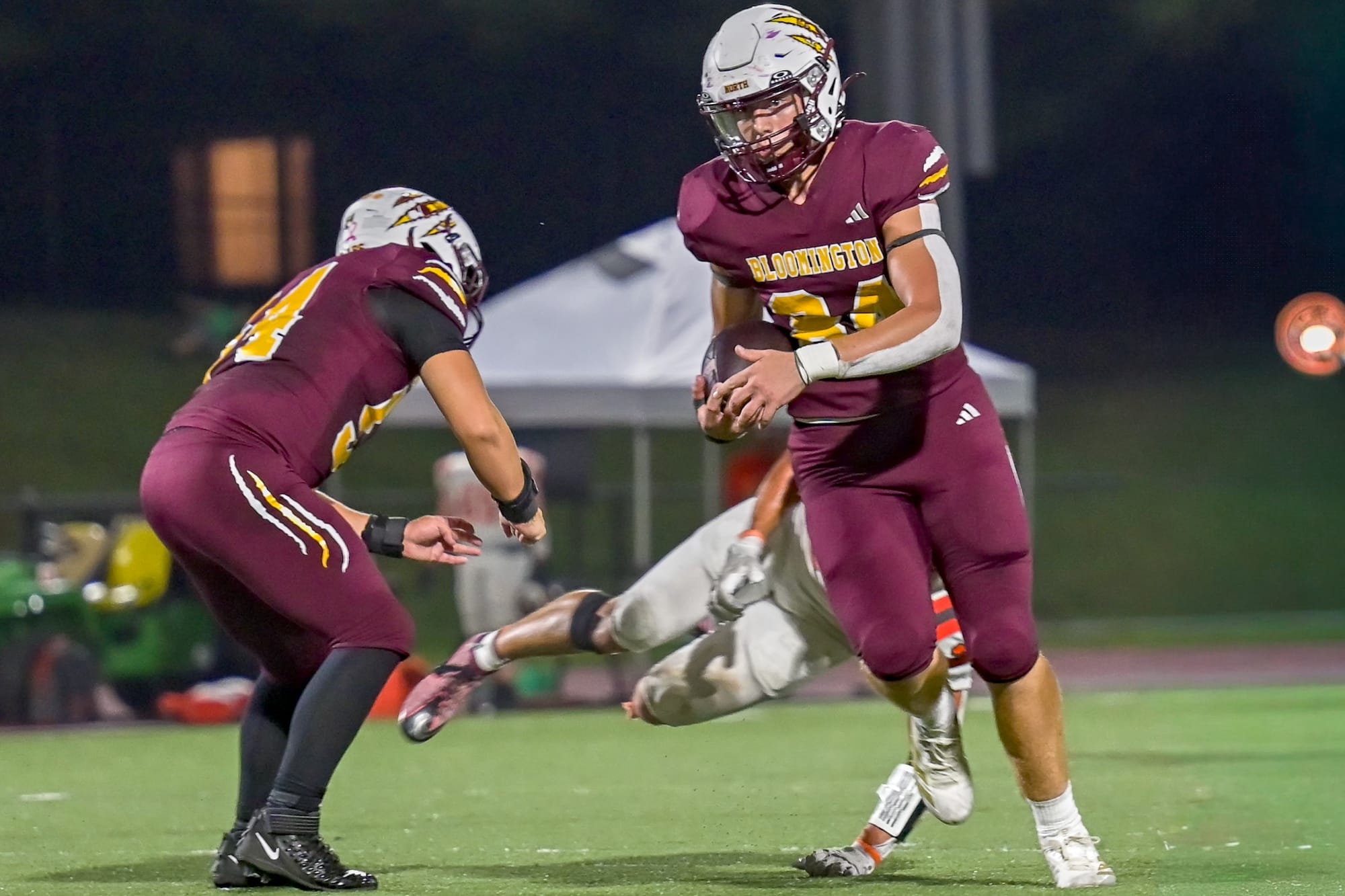 Kellen Bishop (7) scores after a pick-six. (Amy Mason, Oct. 4, 2025)The team rushes to celebrate with Bishop (7) after his interception return for a touchdown. (Amy Mason, Oct. 4, 2025)Nate Walker (2) catches the pass while keeping his big right toe from going out of bounds. (Amy Mason, Oct. 4, 2025)Luke Freel (5) weaves his way through Olympian defenders. (Amy Mason, Oct. 4, 2025)Zach Barrow (9) prevents Columbus East from scoring. (Amy Mason, Oct. 4, 2025)Adis Hamidovic (56) pumps up the crowd after a sack. (Amy Mason, Oct. 4, 2025)Sophomore center Garrett Fishel (50) waits to snap the ball while quarterback John Bargen (18) calls the play. (Amy Mason, Oct. 4, 2025)Lucas Rice (42) roars in celebration. (Amy Mason, Oct. 4, 2025)Tight End Hunter Chitwood (84) is able to gain yardage after a screen by James Mason (54). (Amy Mason, Oct. 4, 2025)Noah Ferree (32) pushes through to score. (Amy Mason, Oct. 4, 2025)Carter Matthews (22) escapes the Olympian tackler. (Amy Mason, Oct. 4, 2025)It was Youth Cheer Clinic Night at the Bloomington High School North football game. (Amy Mason, Oct. 4, 2025)Nate Walker’s little sister, Ava, joins the cheer squad for Youth Cheer Clinic Night. (Amy Mason, Oct. 4, 2025)