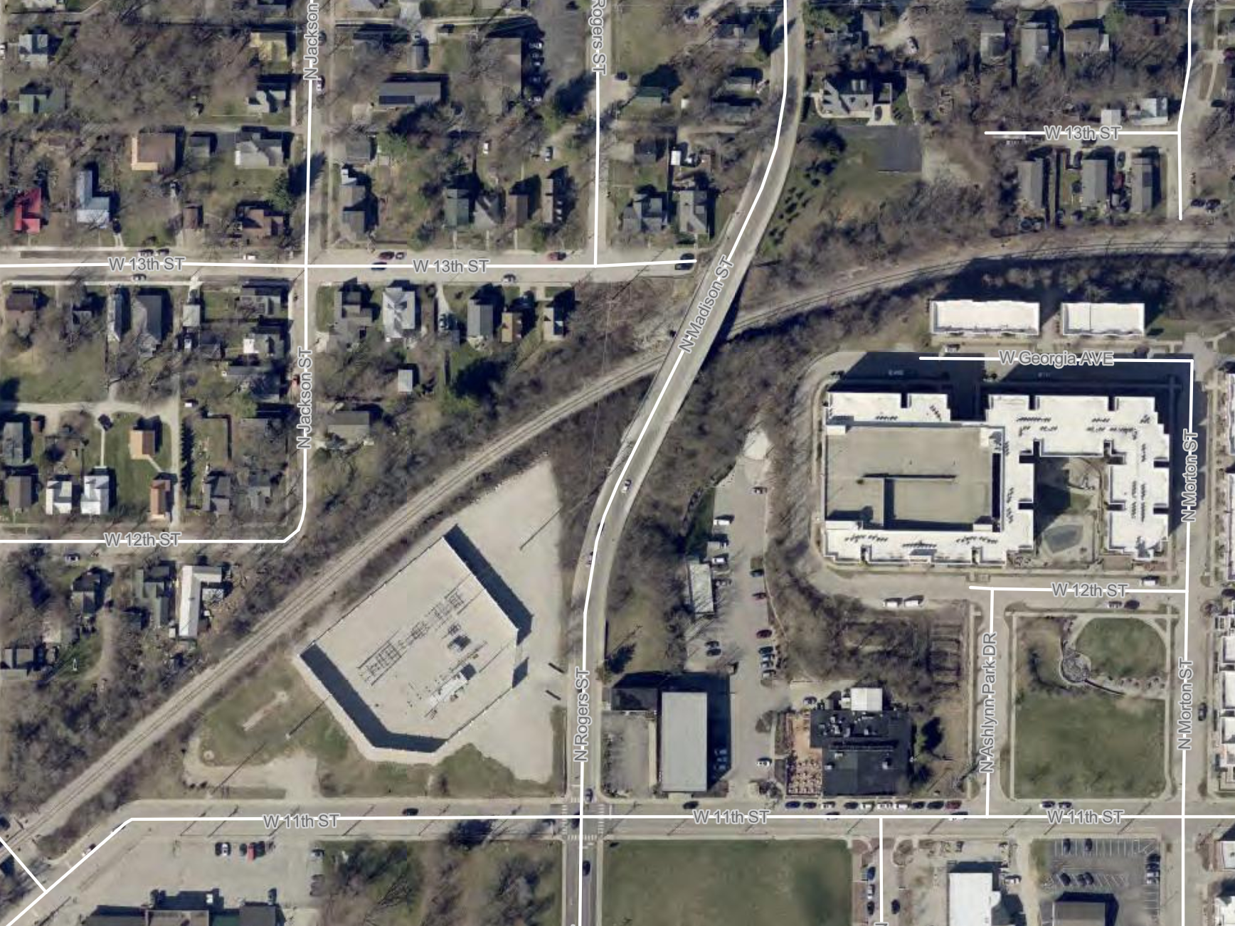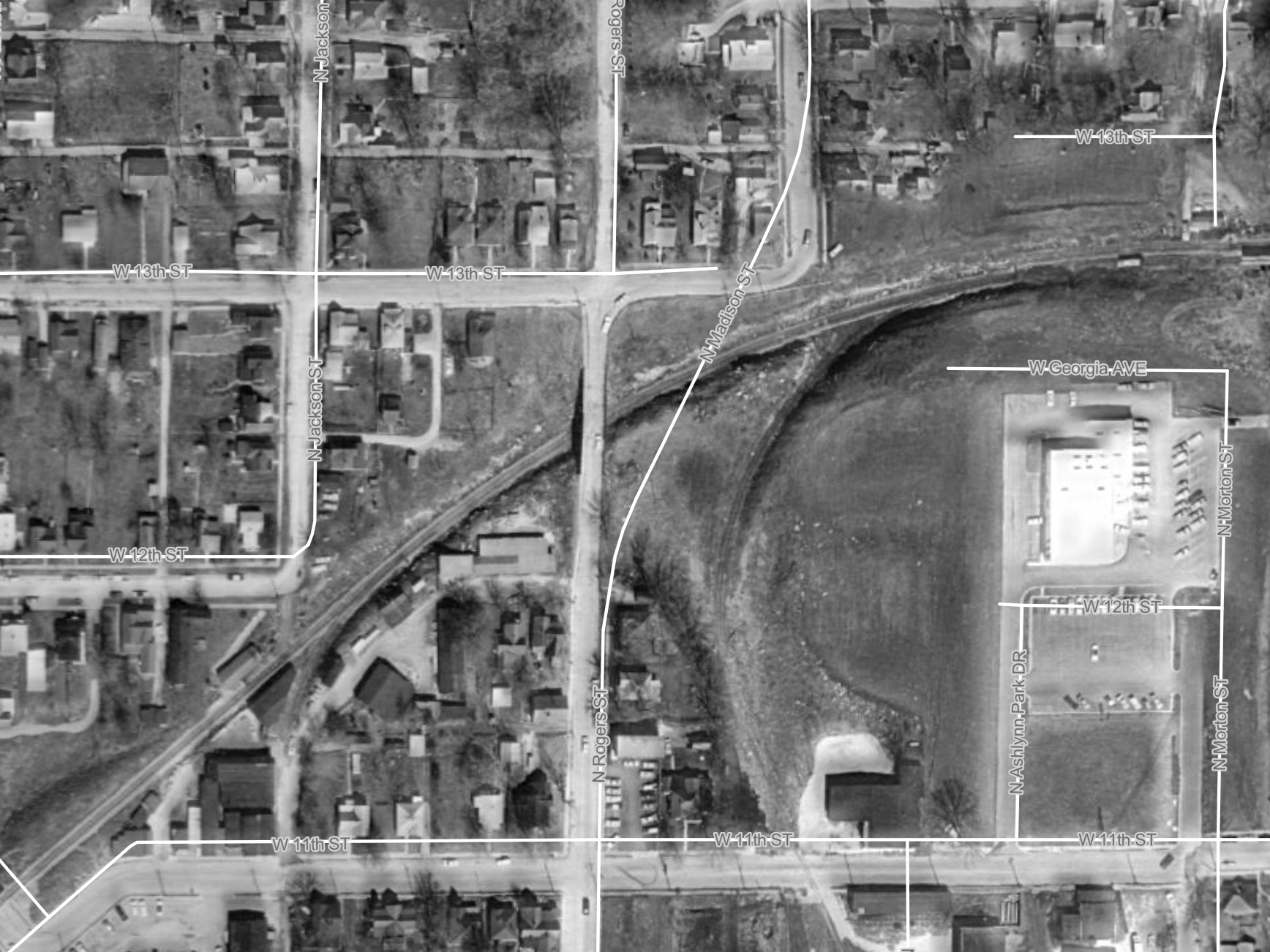 The difference in the current road alignment for Rogers Street at the railroad tracks near 11th street can be seen in the historical aerial imagery available through Monroe County’s GIS website.