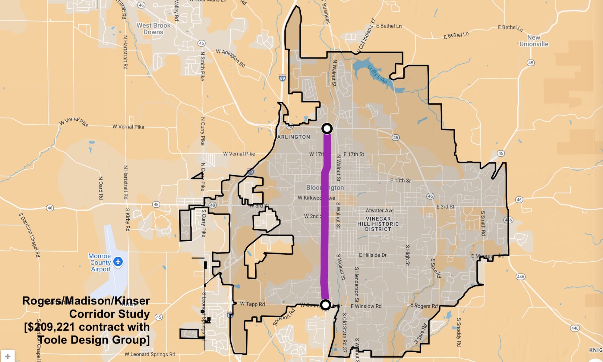 Now set for closer study is the Rogers Street corridor, stretching 4.5-miles from Bloomington’s southern boundary to the SR 45/46 bypass. Approved on Tuesday night by Bloomington’s board of public works was a consulting contract with Toole Design Group worth $209,221.