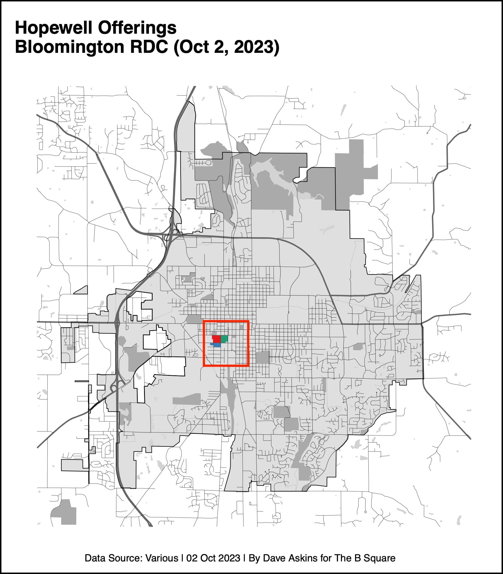 The area with the buildings to be demolished is just part of the Hopewell land, which includes the former site of the IU Health hospital. Bloomington’s RDC bought the property for $6.5 million, in a deal that finally closed late last year.