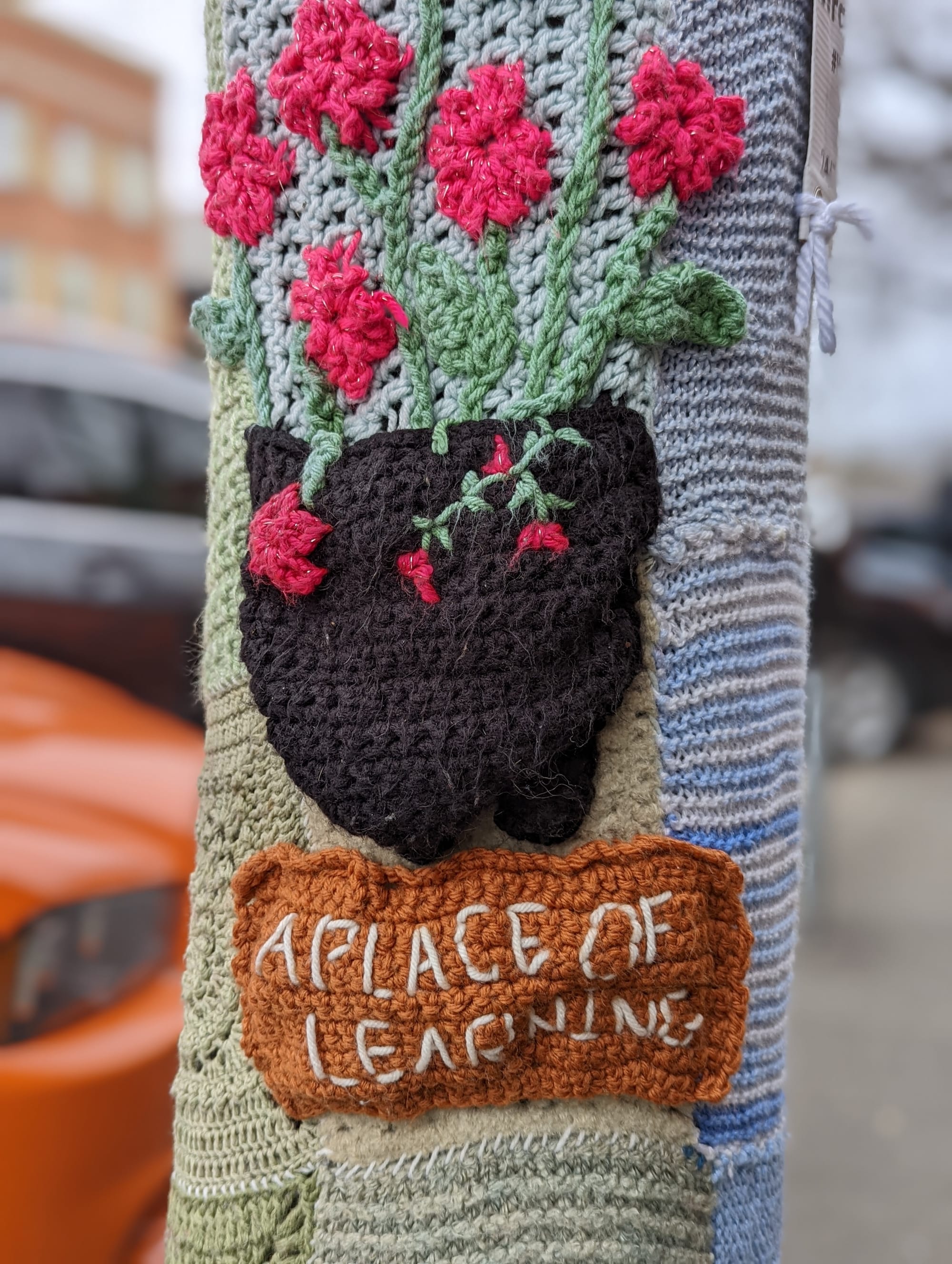The “Wrapped in Love” installation this year includes knitted pieces with words like “Mitzvah Tree” and “A place of learning” and “Let love bloom.”