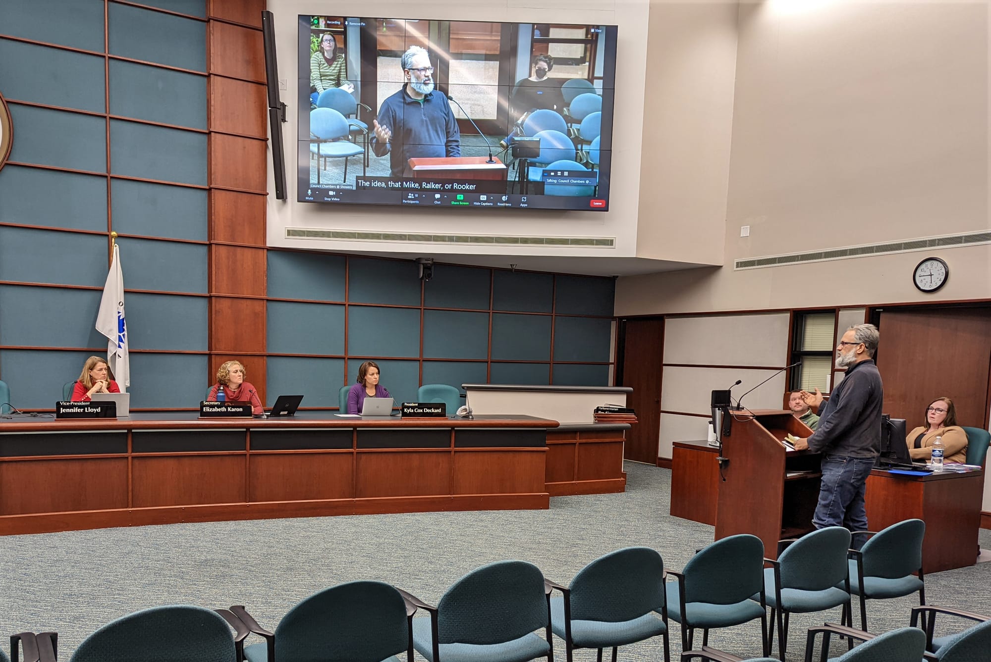 From the public mic, The B Square asked how ASL handshapes would be analyzed under the definition of speech in the policy, given that the ASL handshape for “K” was a part of the “Black Lives Matter” mural painted on Eagleson Avenue.