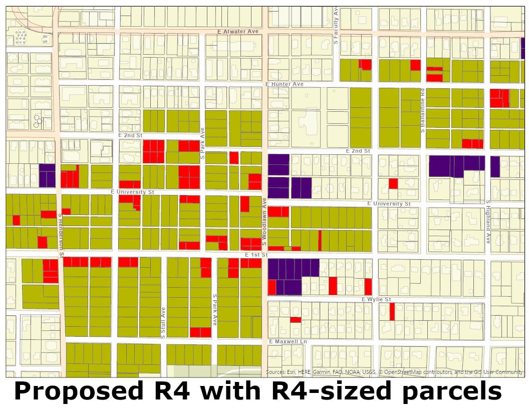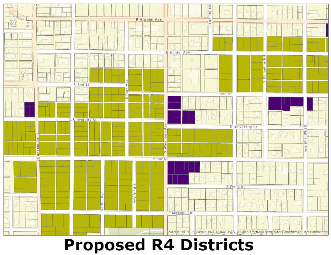 The R4 district was not a focus on controversy last year, because it did not appear anywhere on the zoning map. For some, the expectation was that the IU Health hospital site would have been a likely candidate for R4 zoning, but not older established neighborhoods. Part of the IU Health site is proposed to be zoned as R4. IU Health will start handing over the site to the city late next year in a $6.5 million real estate deal.