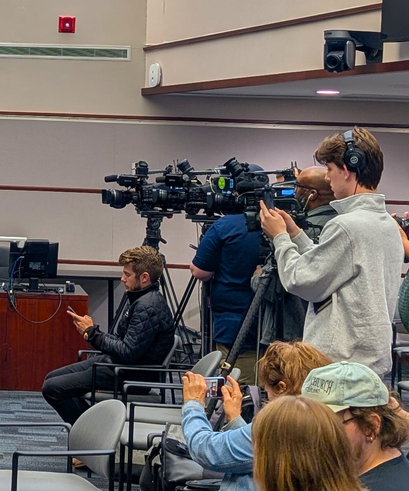 Left: Bloomington police chief Mike Diekhoff and Bloomington mayor Kerry Thomson. Right: News media at the press conference.