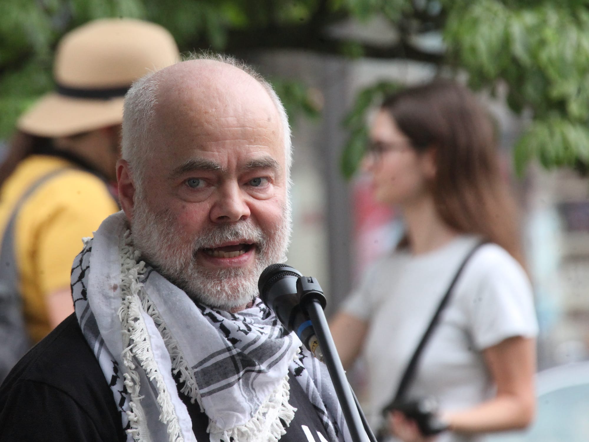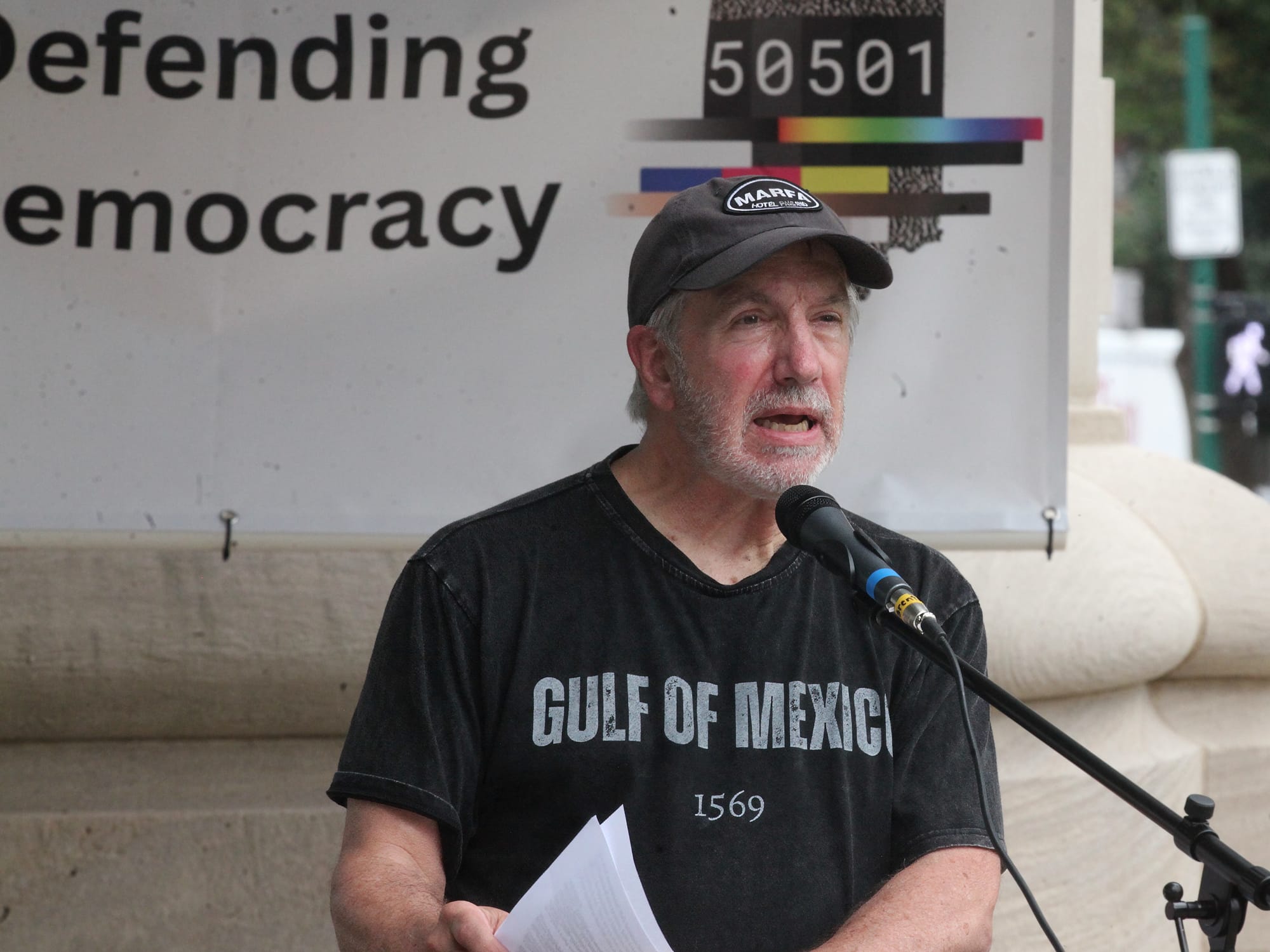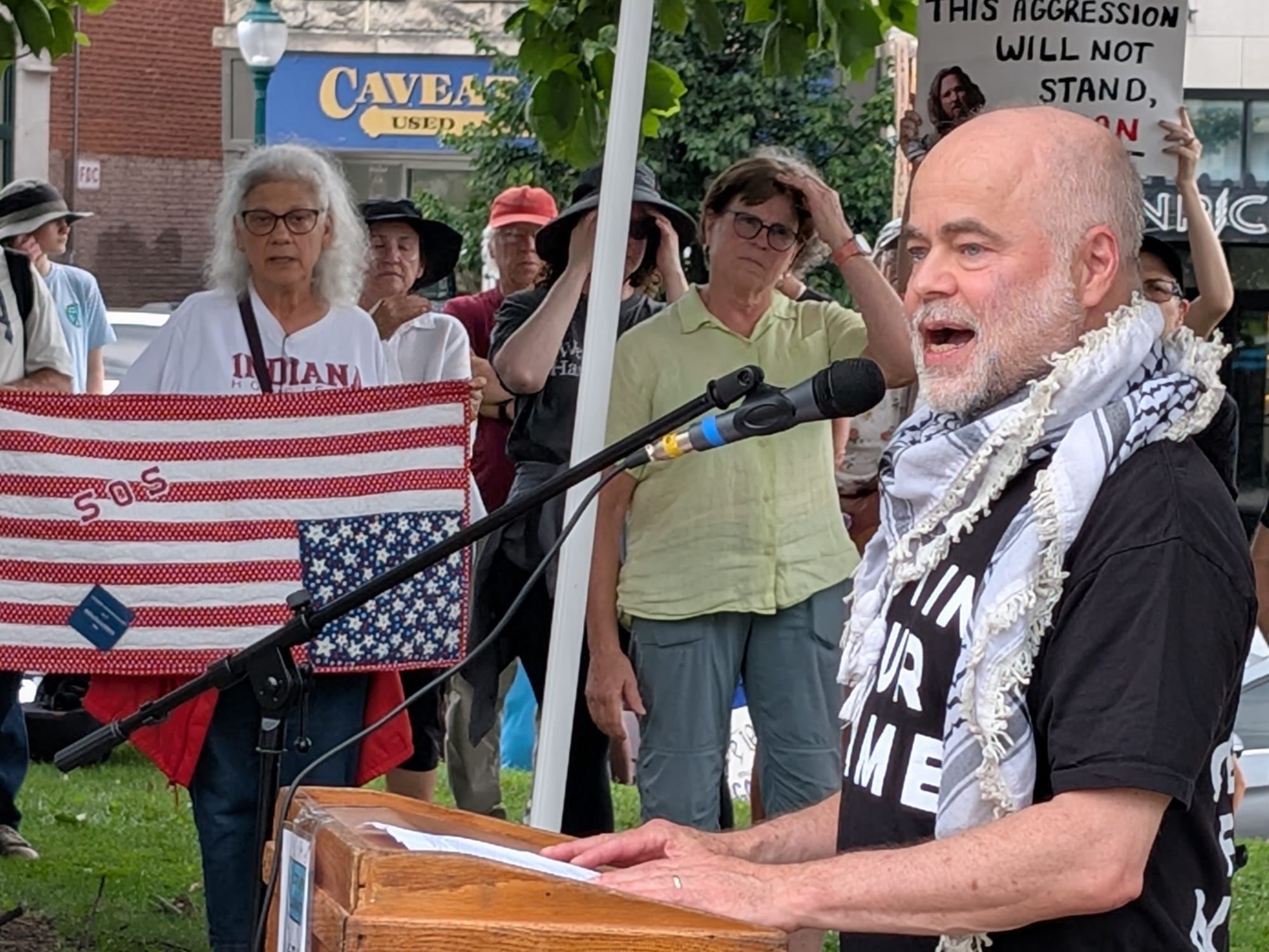 Benjamin Robinson, IU professor of Germanic studies, with Jewish Voice for Peace, addresses the rally on the topic of Palestinian rights: “The basic thought mobilizing the forces against racial equality and Palestinian liberation is that any affirmative action effort to address historic discrimination against people of color is anti-white. The same playbook has been used in targeting protesters calling for Palestinian rights.” (Dave Askins, July 17, 2025)
