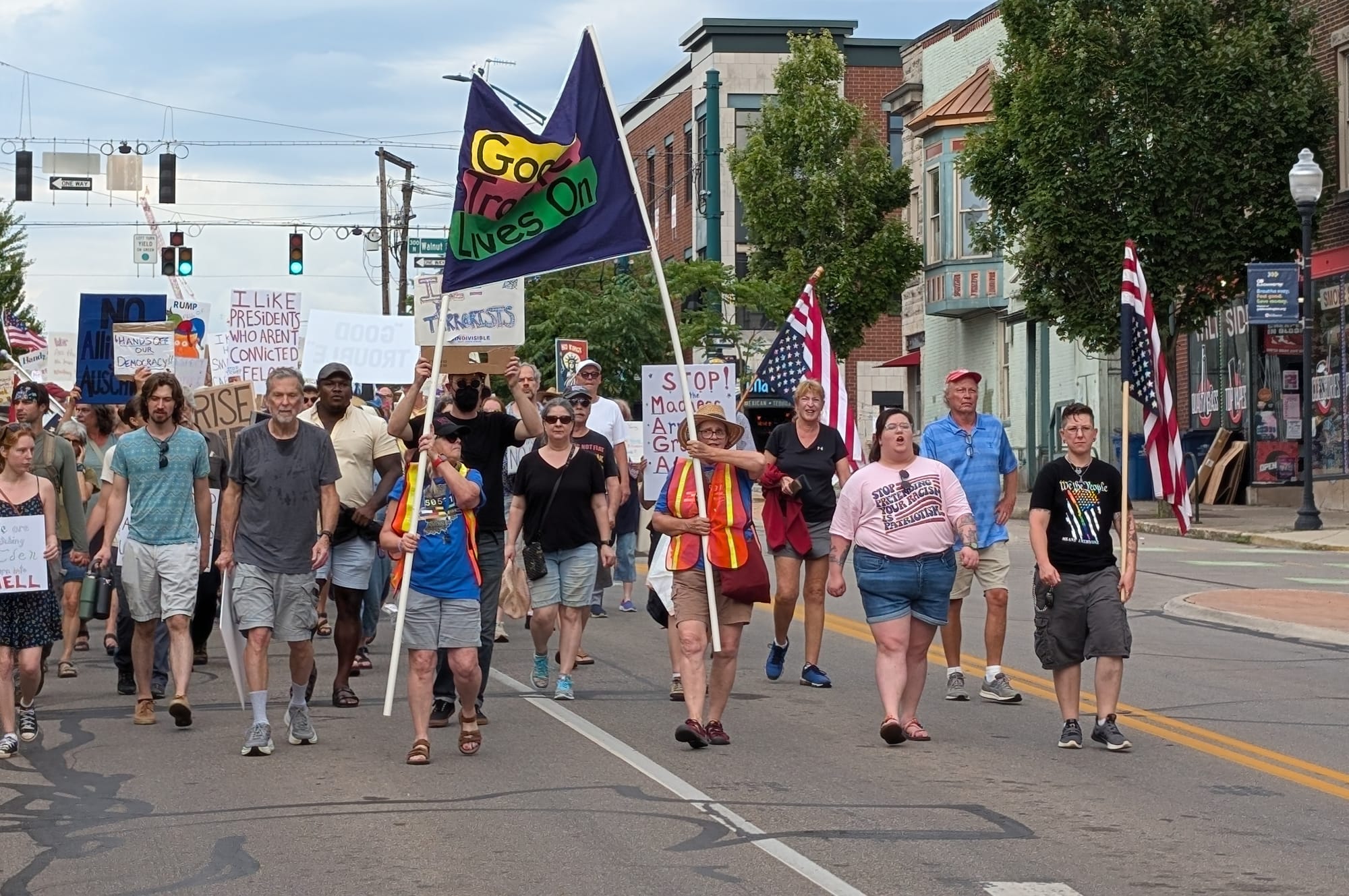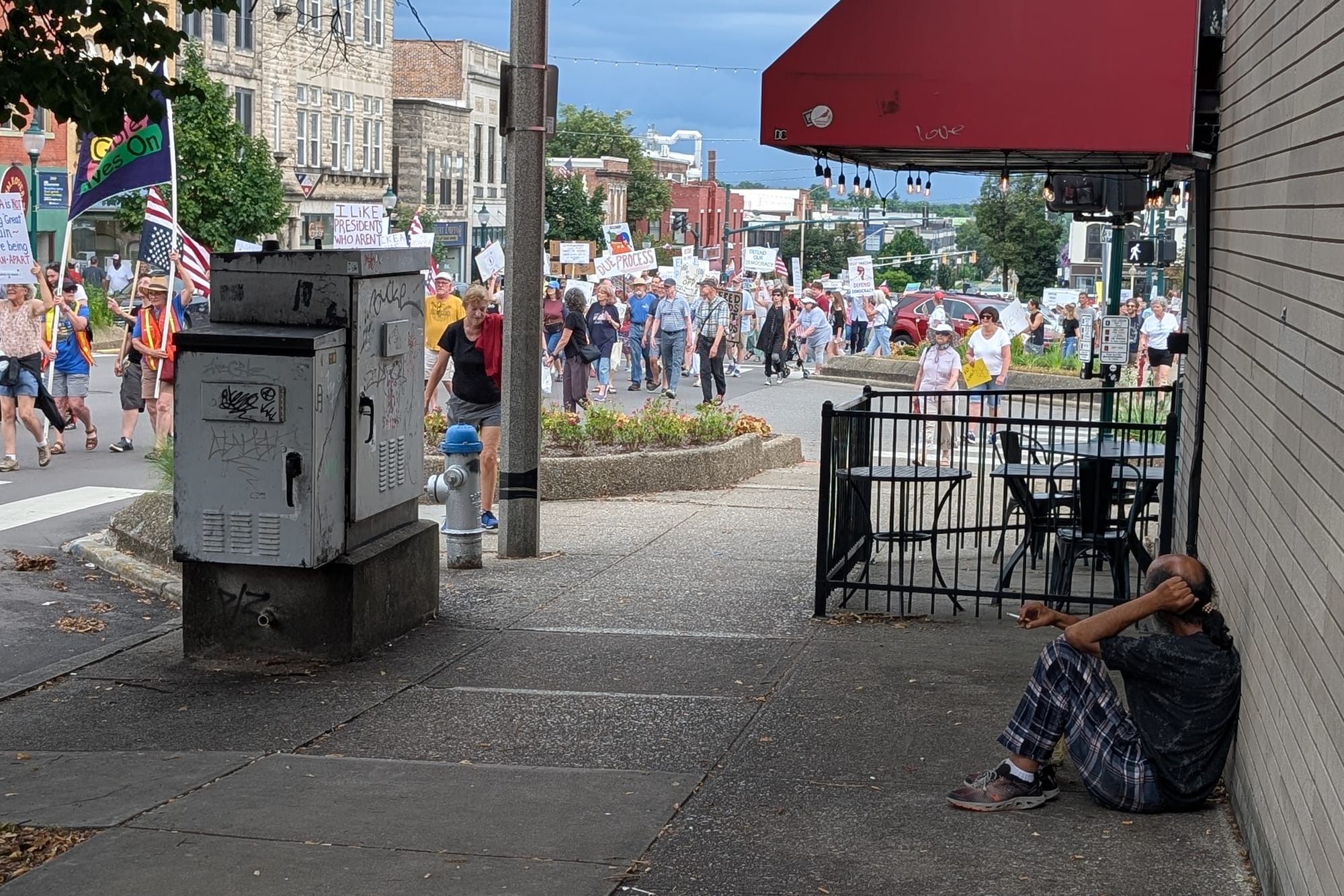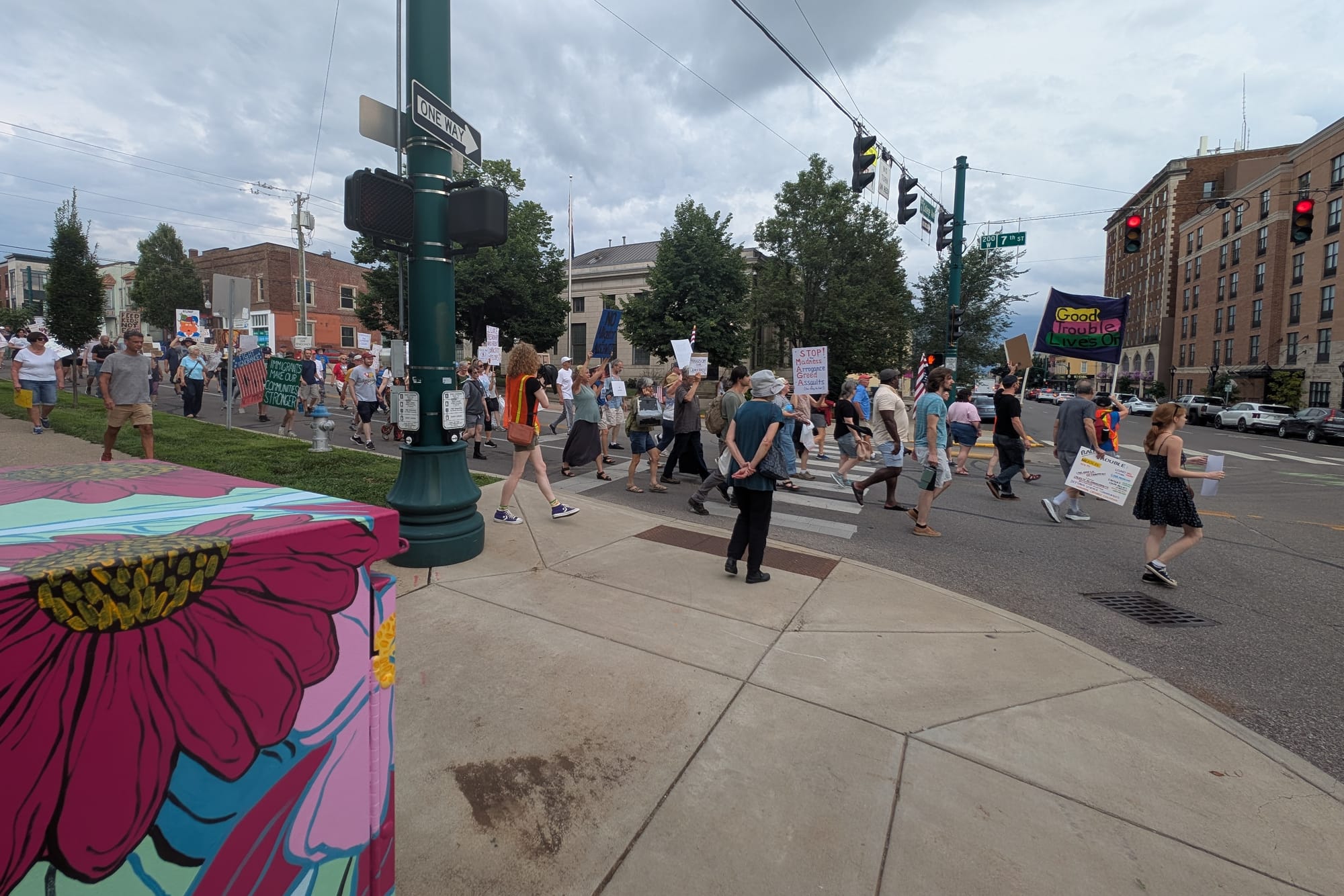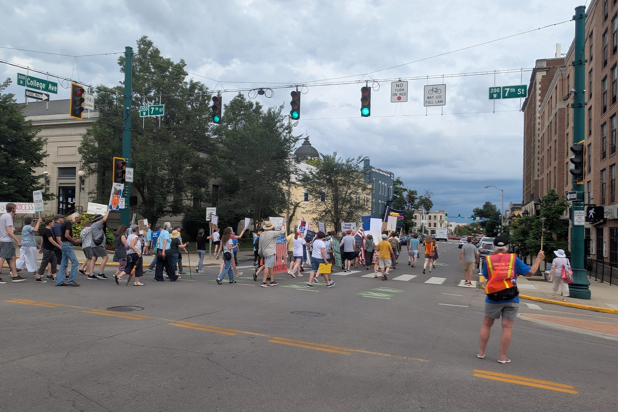 The rally marches west down 7th Street around the corner at College Avenue. (Dave Askins, July 17, 2025)