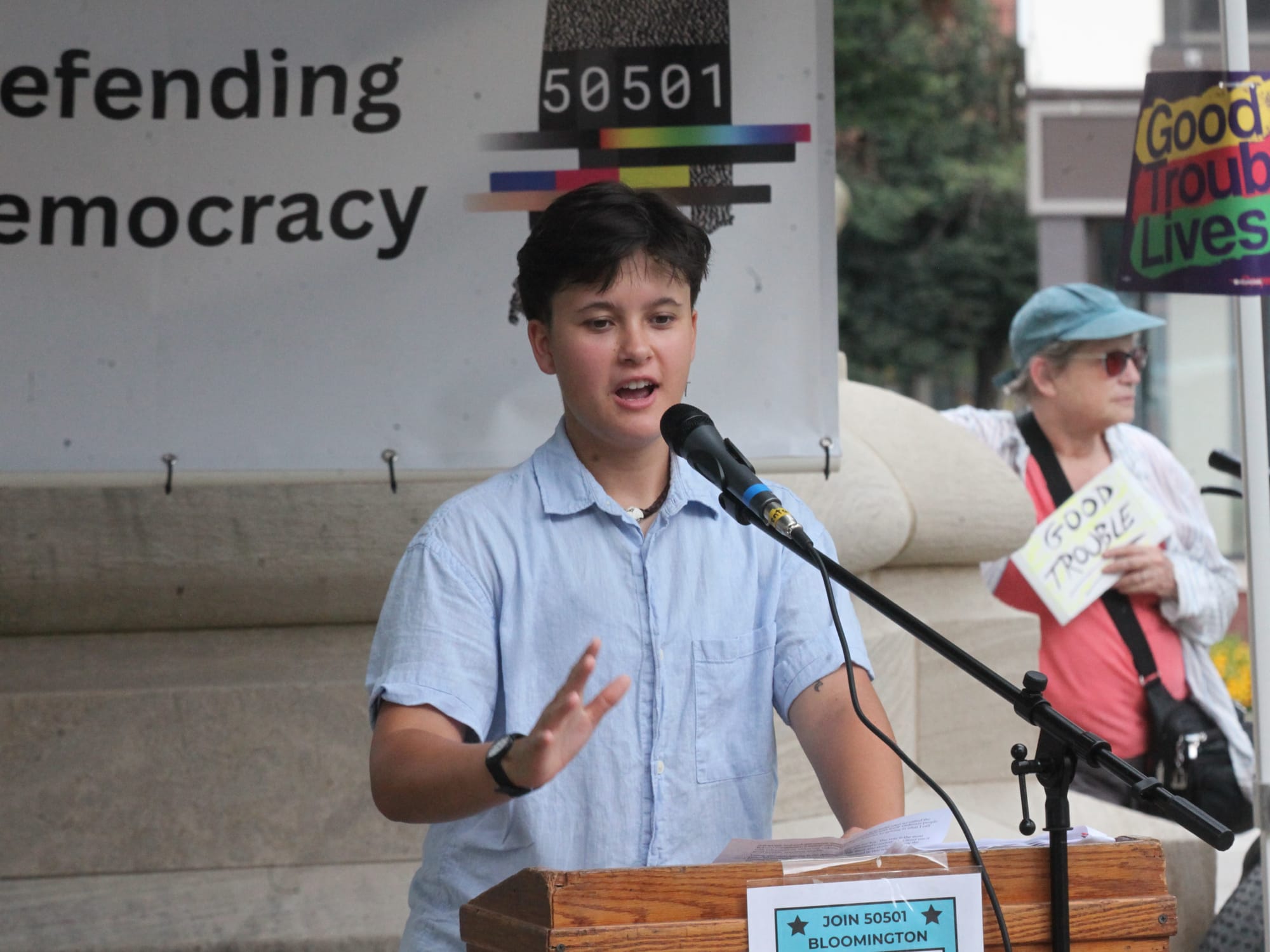 Other speakers at Thursday’s really included: Lisa Schubert Nowling, lead pastor at Bloomington’s First United Methodist Church; Sandy Washburn with the 50501 Movement; Benjamin Robinson, IU professor of Germanic studies, with Jewish Voice for Peace; and Maddy Waters, an incoming IU freshman.