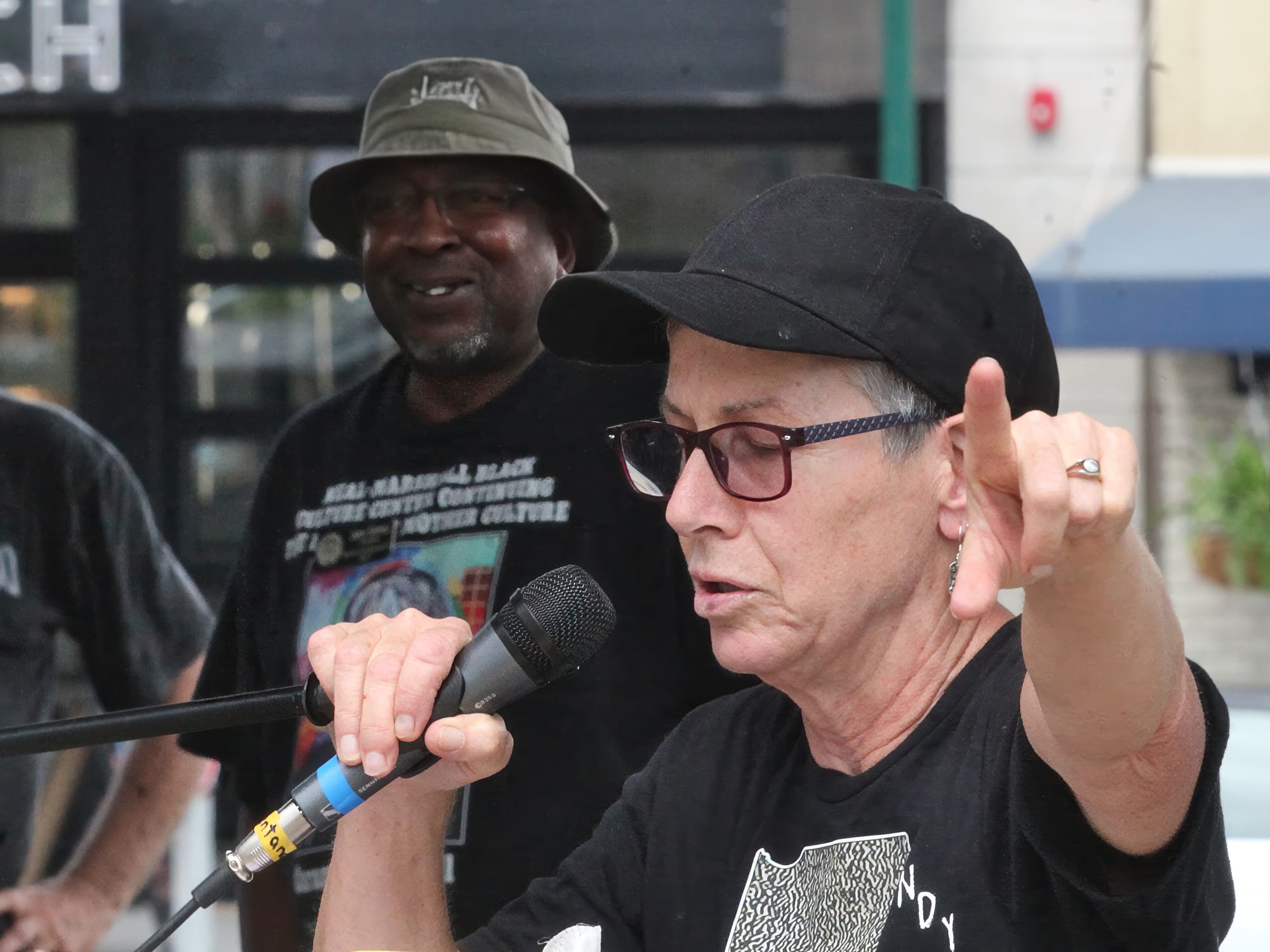 Left: Micol Seigel, who is an Indiana University history professor, and part of a group called Care Not Cages, addresses the crowd. Right: Jim Sims, former Bloomington city councilmember and current president of the Monroe County Branch NAACP, addresses the crowd at Thursday’s rally. (Dave Askins, July 17, 2025)