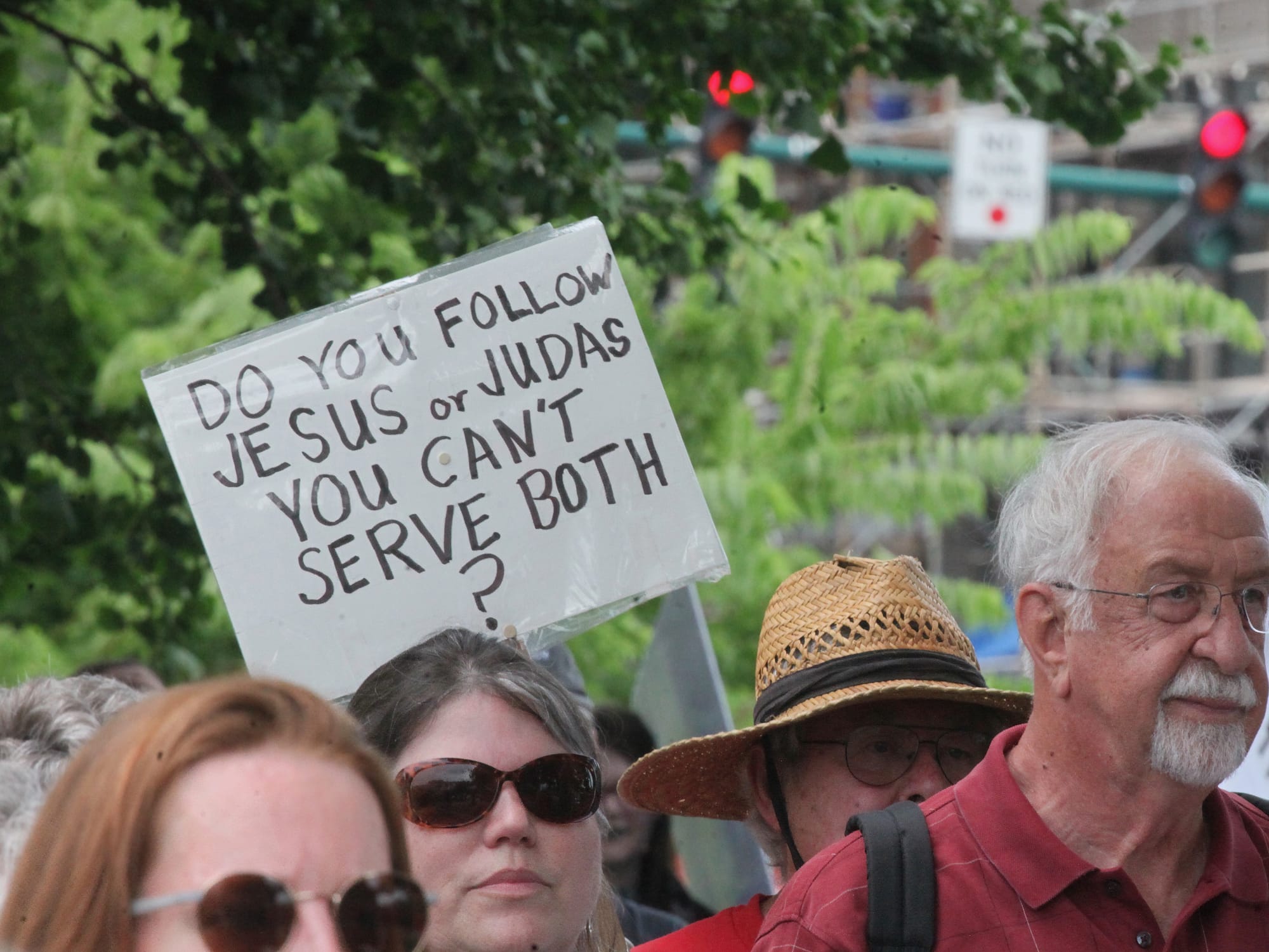 On Thursday (July 17), at least 300 people crowded onto the southeast corner of the Monroe County courthouse grounds to protest actions taken by U.S. President Donald Trump’s administration. Several community leaders addressed the gathering.