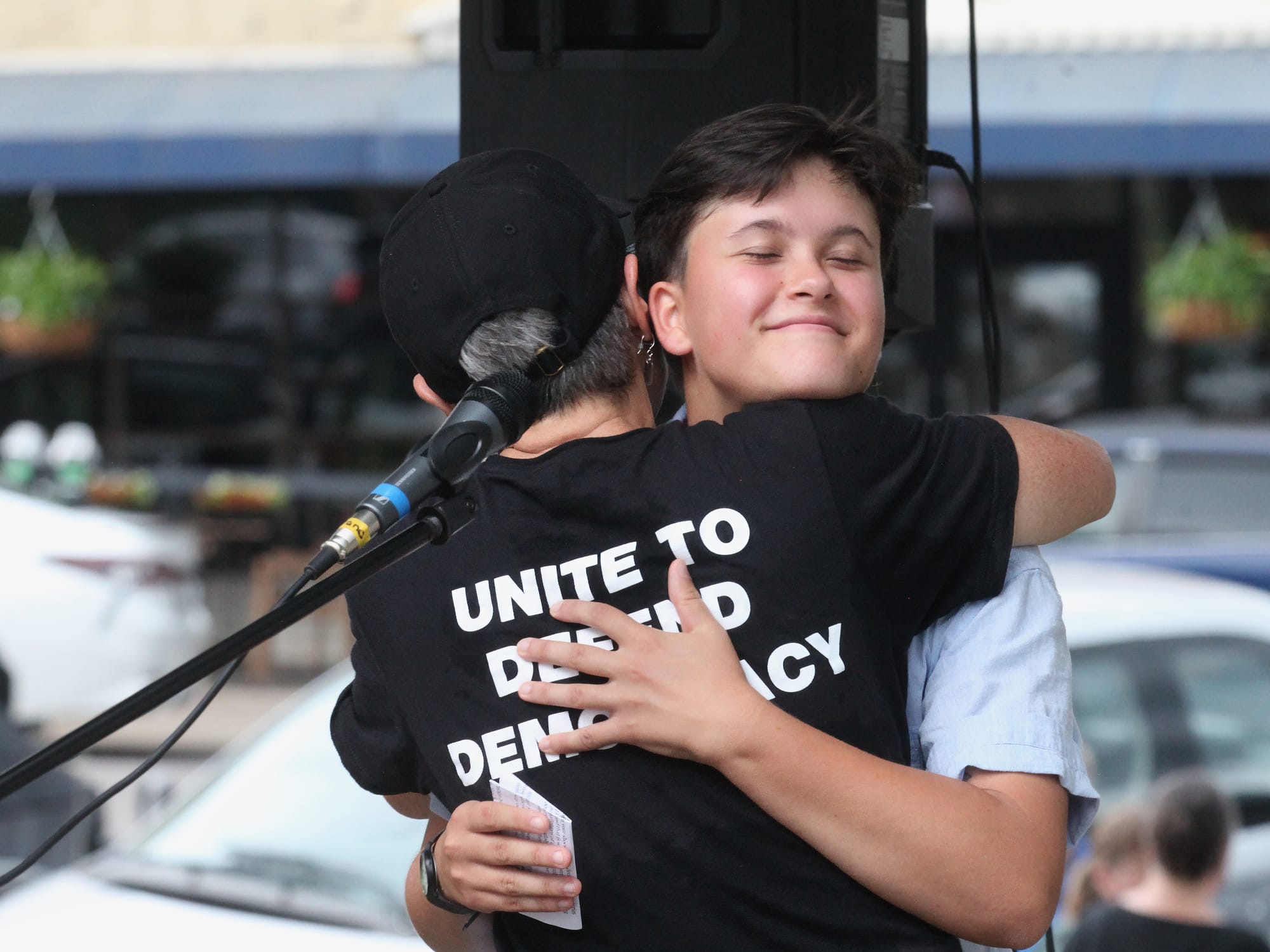 Left: Maddy Waters give Sandy Washburn a hug. Water is an incoming IU freshman. Washburn is an organizer with the 50501 Movement. Right: Maddy Waters reads aloud John Lewis's essay, written shortly before he died. (Dave Askins, July 17, 2025)