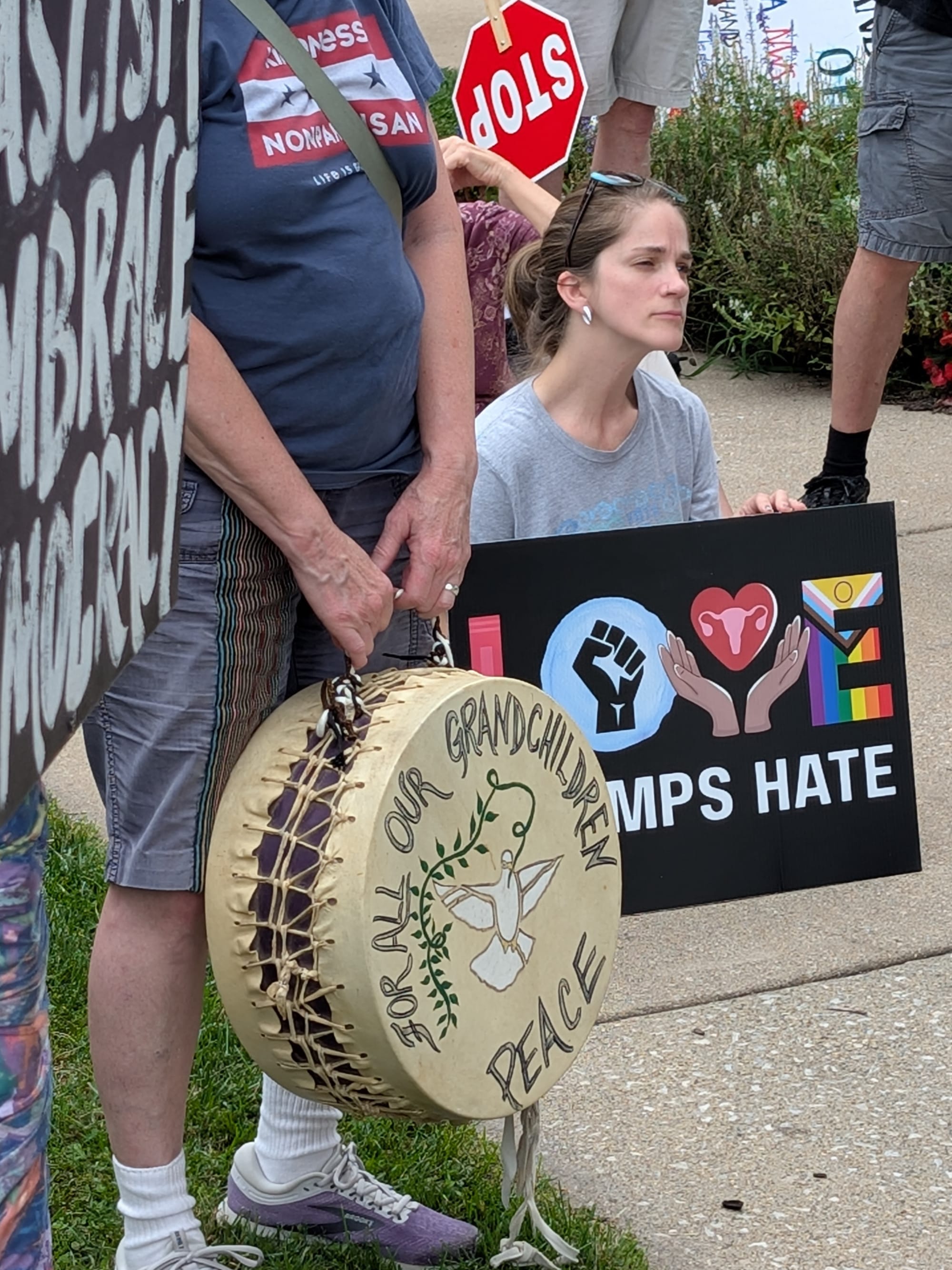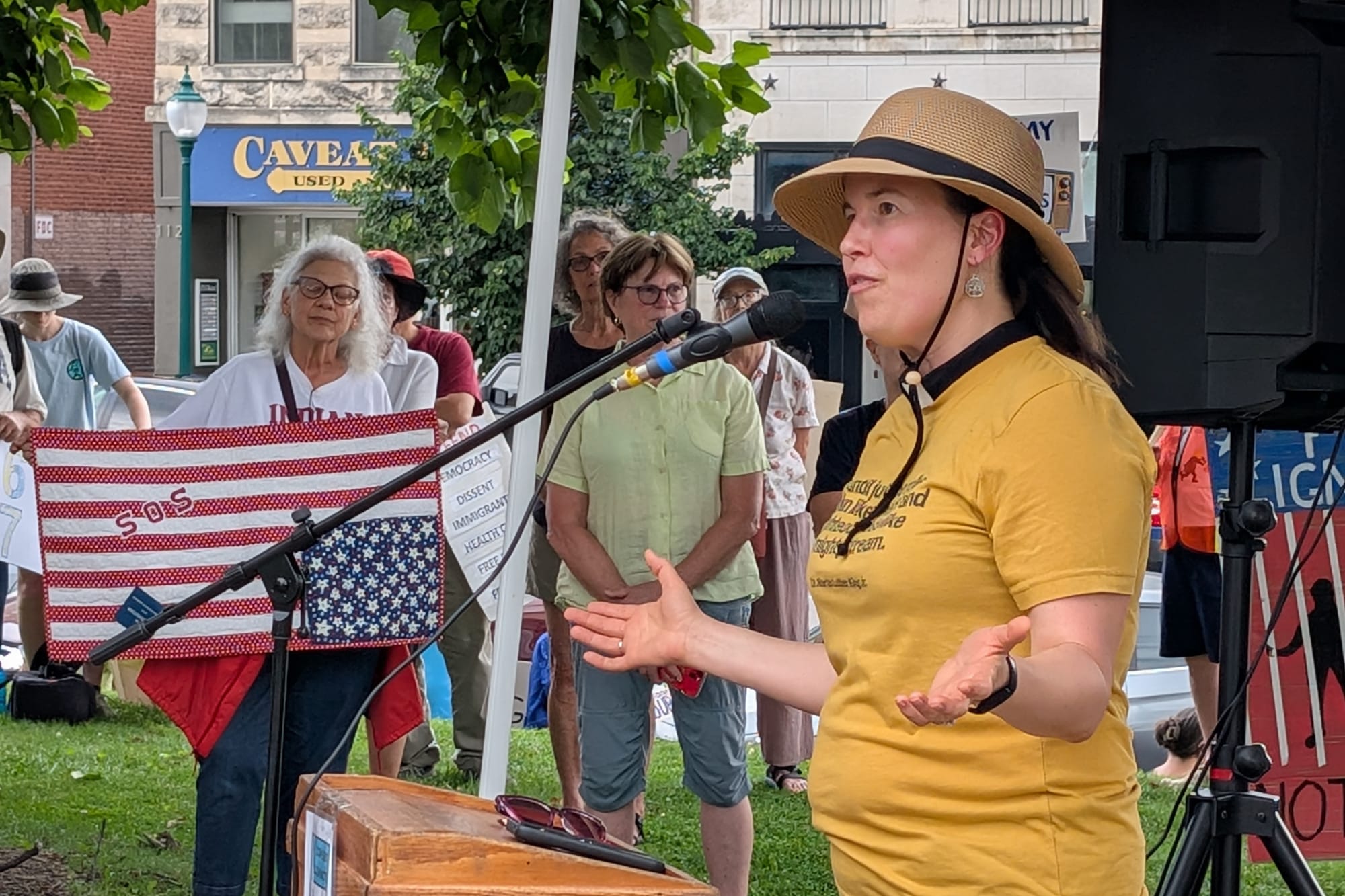 Left: Lisa Schubert Nowling, lead pastor at Bloomington’s First United Methodist Church, addresses the crowd on the topic of why she feels compelled to act: "I believe that Jesus has called me to action, and I believe that the church in the 21st Century cannot just be about saving souls, but having our souls saved ... in the way that we care for those who are marginalized, in the way that we overturn injustice and the way that we create a society, a country, and a world, where all are valued because they are made in the image of God." (Dave Askins, July 17, 2025)