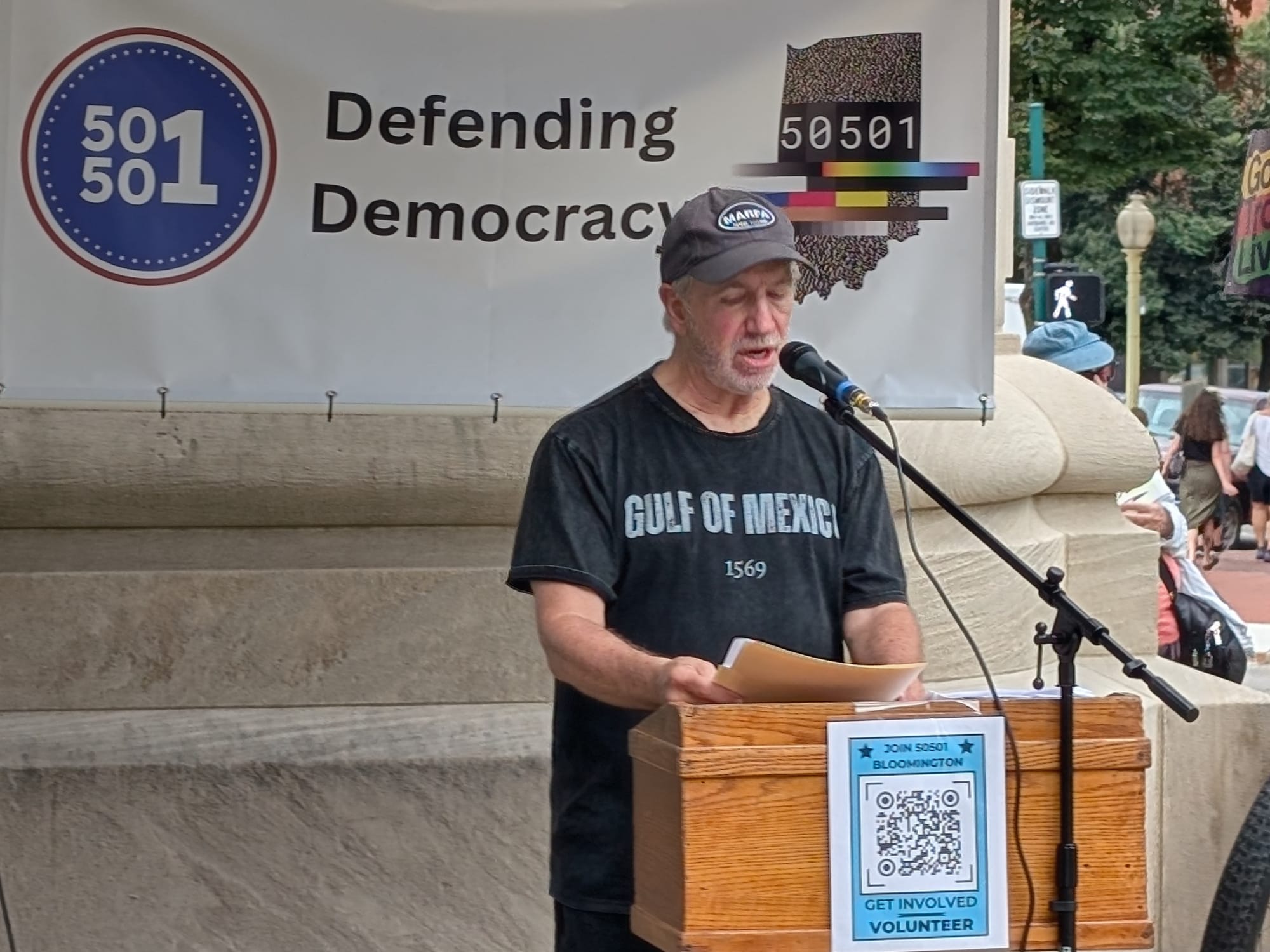 Most of the focus at Thursday’s rally was on national and state-level policy issues. But there were direct connections to local affairs, like the planning for the new Monroe County jail, and the dismantling of DEI programs at Indiana University.