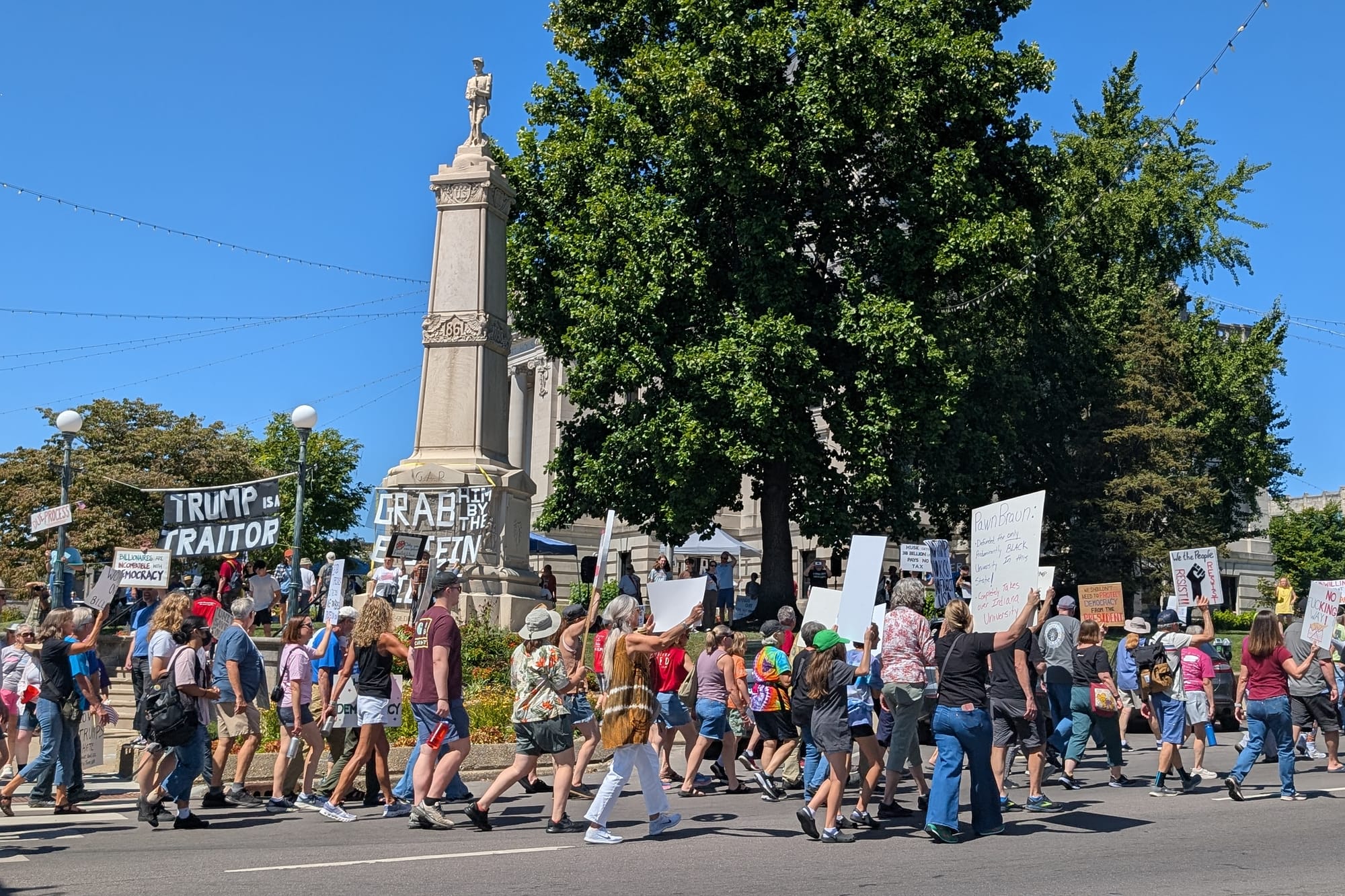 At noon on Monday, under clear sunny skies with a temperature around 75F°, an estimated 300 people gathered on the historic Monroe County courthouse lawn for the Bloomington edition of the “Workers Over Billionaires” protest organized by the local chapter of the 50501 Movement.