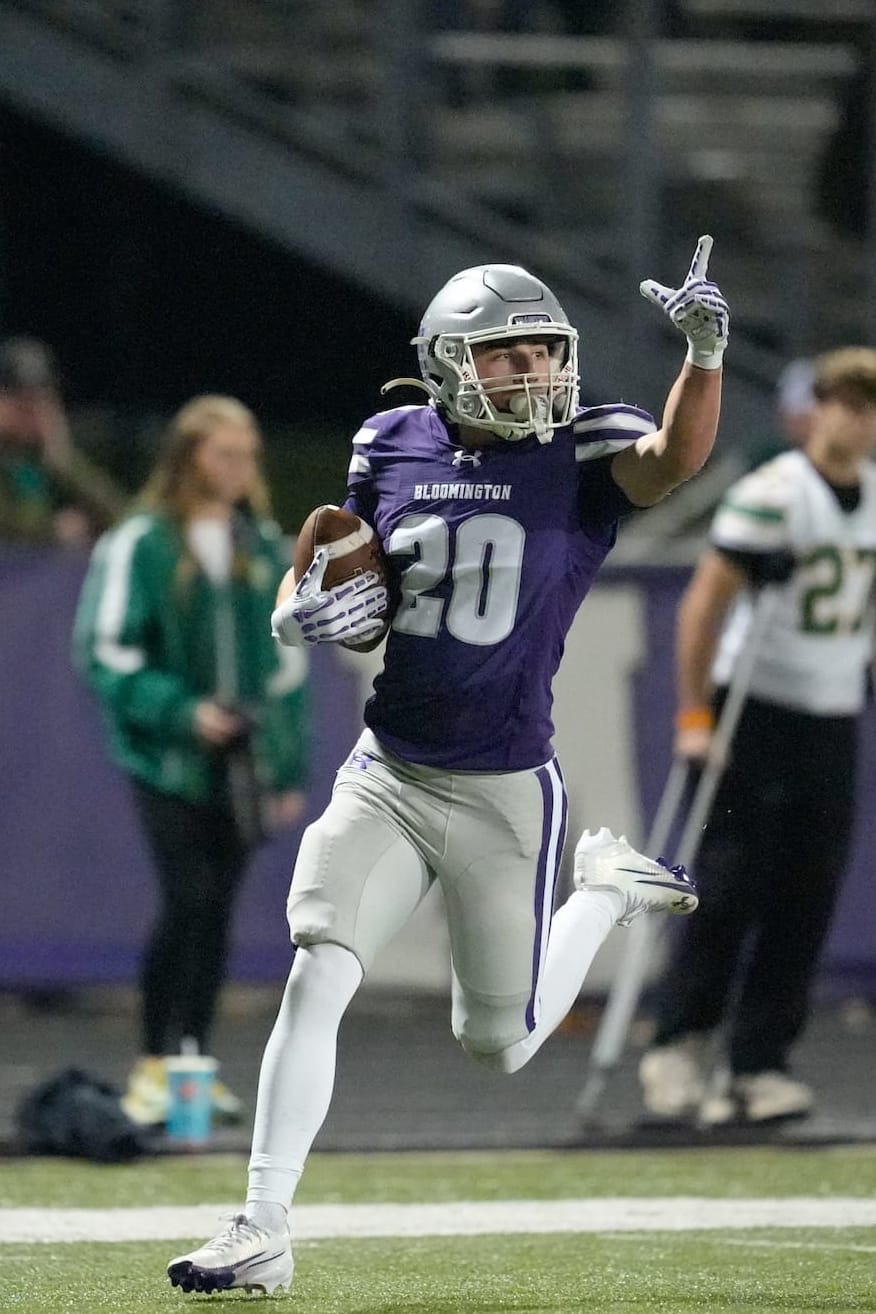 The regional championship win for Bloomington South last Friday included two standout plays: senior wide receiver and kick returner Sam Giles’s 99-yard kickoff return for a touchdown; and a 98-yard interception return for a touchdown by senior defensive back Gabe Taylor.