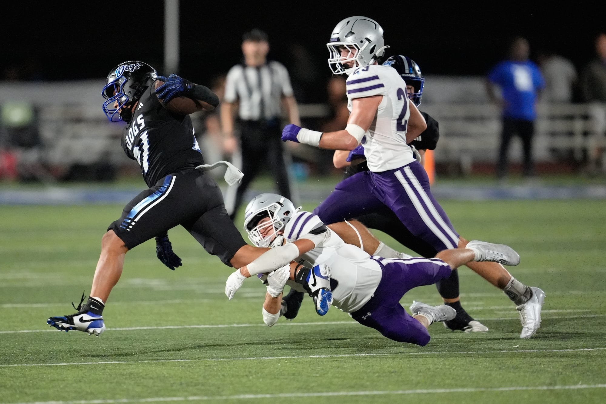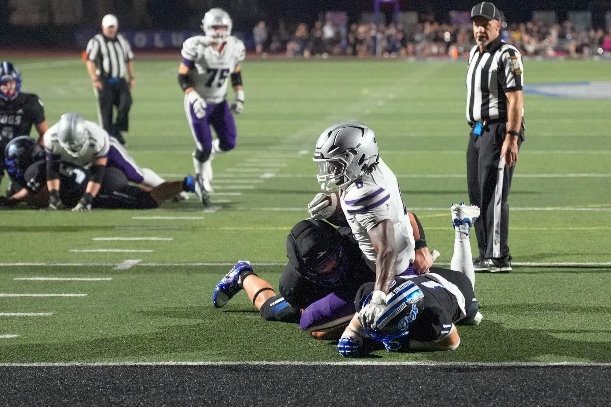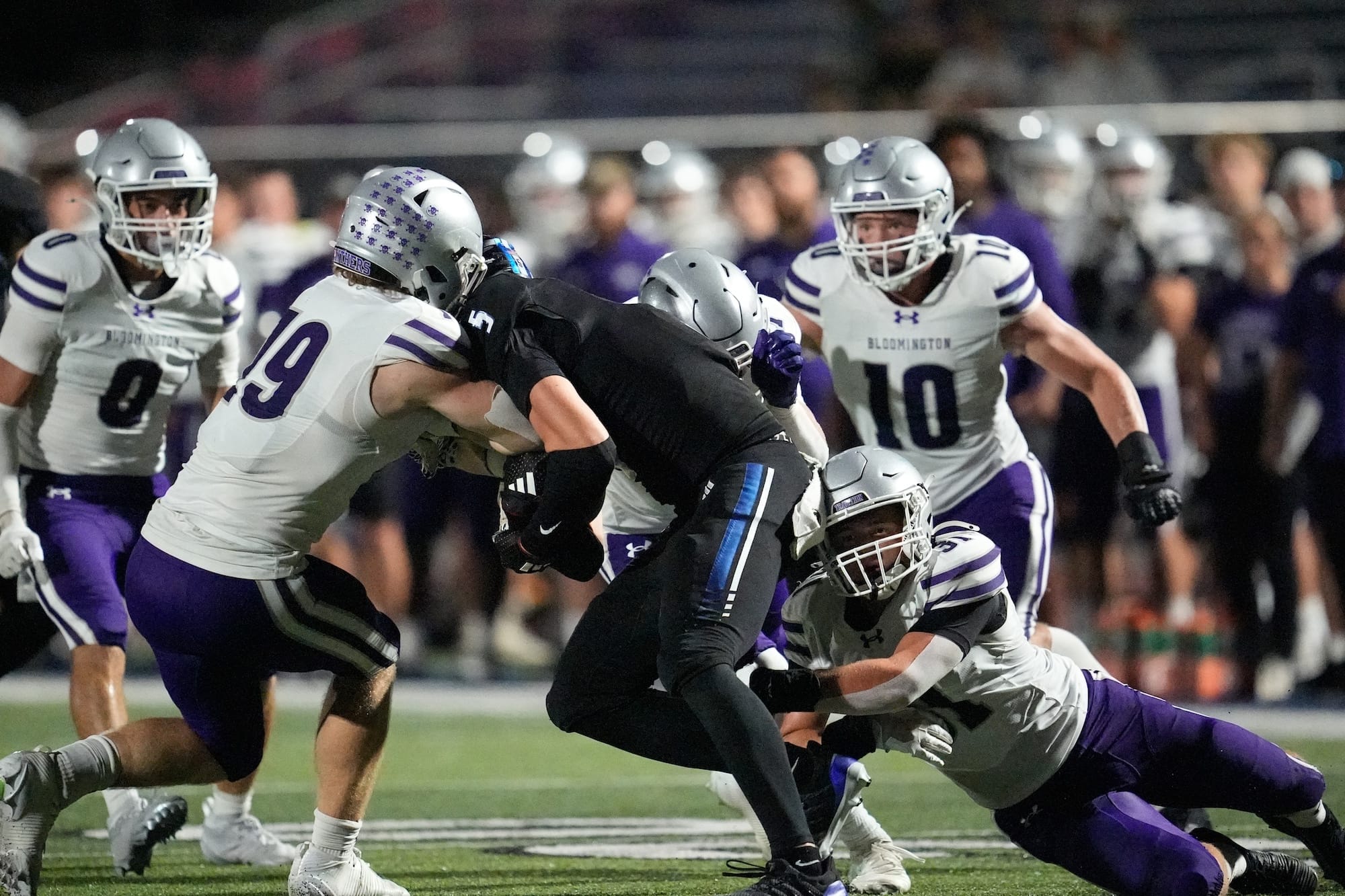 Bloomington South defenders team up to stop Bulldog ball carrier Asher Ratliff (15). (Dave Quick, Oct. 3, 2025)Bloomington South versus Columbus North. (Dave Quick, Oct. 3, 2025)Bloomington South versus Columbus North. (Dave Quick, Oct. 3, 2025)Braylen Townsend (6) finds his way into the end zone again. (Dave Quick, Oct. 3, 2025)Braylen Townsend (6) flexes after a score. (Dave Quick, Oct. 3, 2025)Noah Knepper (38) drags down Bulldog Cohen Long (11) (Dave Quick, Oct. 3, 2025)The backdrop to the handshake line after the game is a scoreboard that says Columbus North 24, Bloomington South 55. (Dave Quick, Oct. 3, 2025)