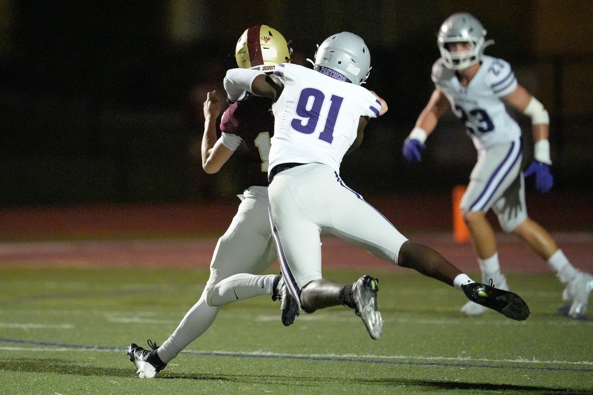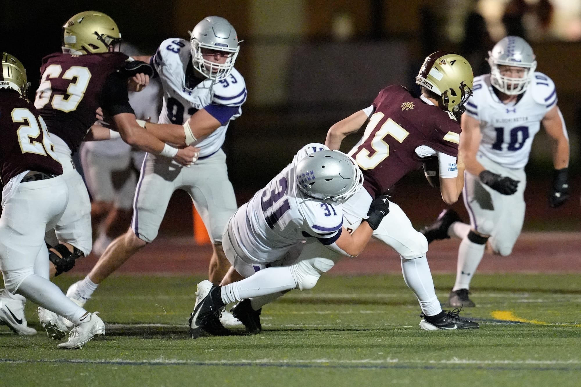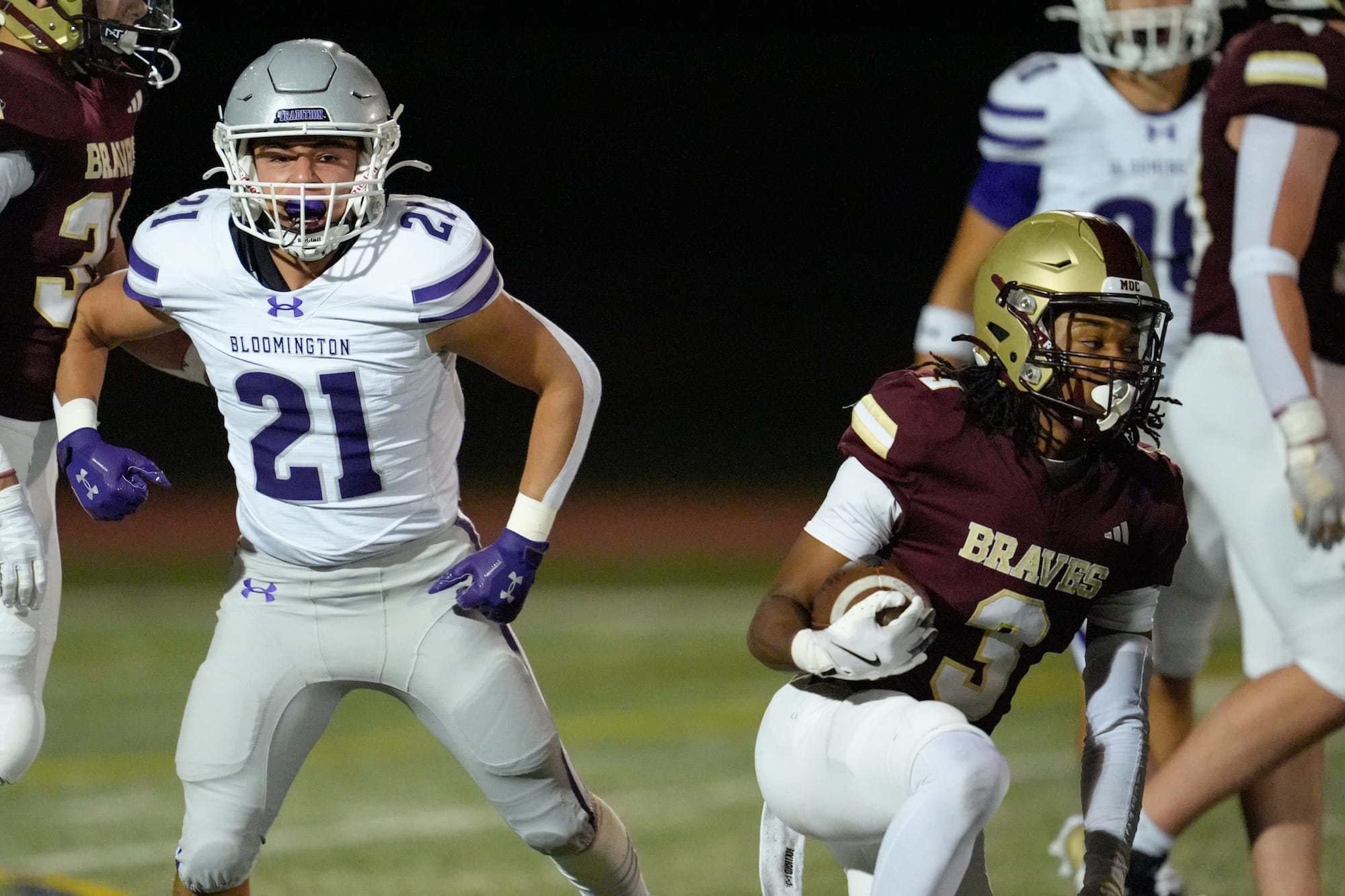 The Panthers line up before their game against the Braves. (Dave Quick, Oct. 10, 2025)The Panthers line up before their game against the Braves. (Dave Quick, Oct. 10, 2025)Braylen Townsend (6) is again in the endzone for the Bloomington South Panthers. (Dave Quick, Oct. 10, 2025)Jalen Williams (1) sizes up the blocking before heading downfield with the ball. (Dave Quick, Oct. 10, 2025)Jalen Williams (1) cruises over the goal line. (Dave Quick, Oct. 10, 2025) (Dave Quick, Oct. 10, 2025)Duncan Combs (2) has a choice of receivers on this play. (Dave Quick, Oct. 10, 2025)Jalen Williams (1) makes sure he gets the ball over the goal line. (Dave Quick, Oct. 10, 2025)A Brebeuf defender tries to keep Jalen Williams (1) out of the end zone. (Dave Quick, Oct. 10, 2025)Connor Parker (3) celebrates mid-air with Jalen Williams (1). (Dave Quick, Oct. 10, 2025)Blake Azcui (21) celebrates bringing down the Brebeuf ball carrier. (Dave Quick, Oct. 10, 2025)Liam Moore (4) wraps up the Brebeuf ball carrier. (Dave Quick, Oct. 10, 2025)Shaun Cooper (34) rumbles down the field. (Dave Quick, Oct. 10, 2025)Bloomington South quarterback Duncan Combs (2) lets the ball fly. (Dave Quick, Oct. 10, 2025)Charlie Morris (13) drags down Brebeuf’s Carter Cosgrove (15). (Dave Quick, Oct. 10, 2025)Jalen Williams (1) gets ready to cut one way or the other. (Dave Quick, Oct. 10, 2025)Bloomington South defenders Liam Moore (4) and Noah Knepper (38) defend the pass. (Dave Quick, Oct. 10, 2025)Daniel Iruoje (91) for Bloomington South has his man wrapped up. (Dave Quick, Oct. 10, 2025)Bloomington South defenders look to collect a loose ball. (Dave Quick, Oct. 10, 2025)Bloomington South’s Jonathan Winstead (18) outruns a Brebeuf defender. (Dave Quick, Oct. 10, 2025)Bloomington South quarterback Duncan Combs (2) sails the ball down the field. (Dave Quick, Oct. 10, 2025)The final score on the scoreboard reads: Bloomington South 38, Brebeuf 7. (Dave Quick, Oct. 10, 2025)
