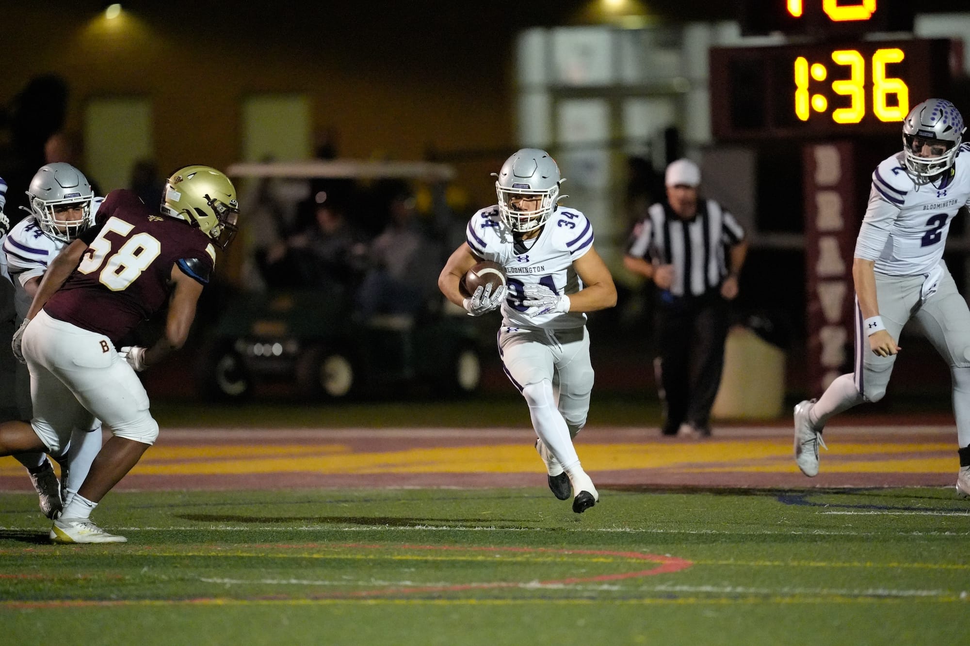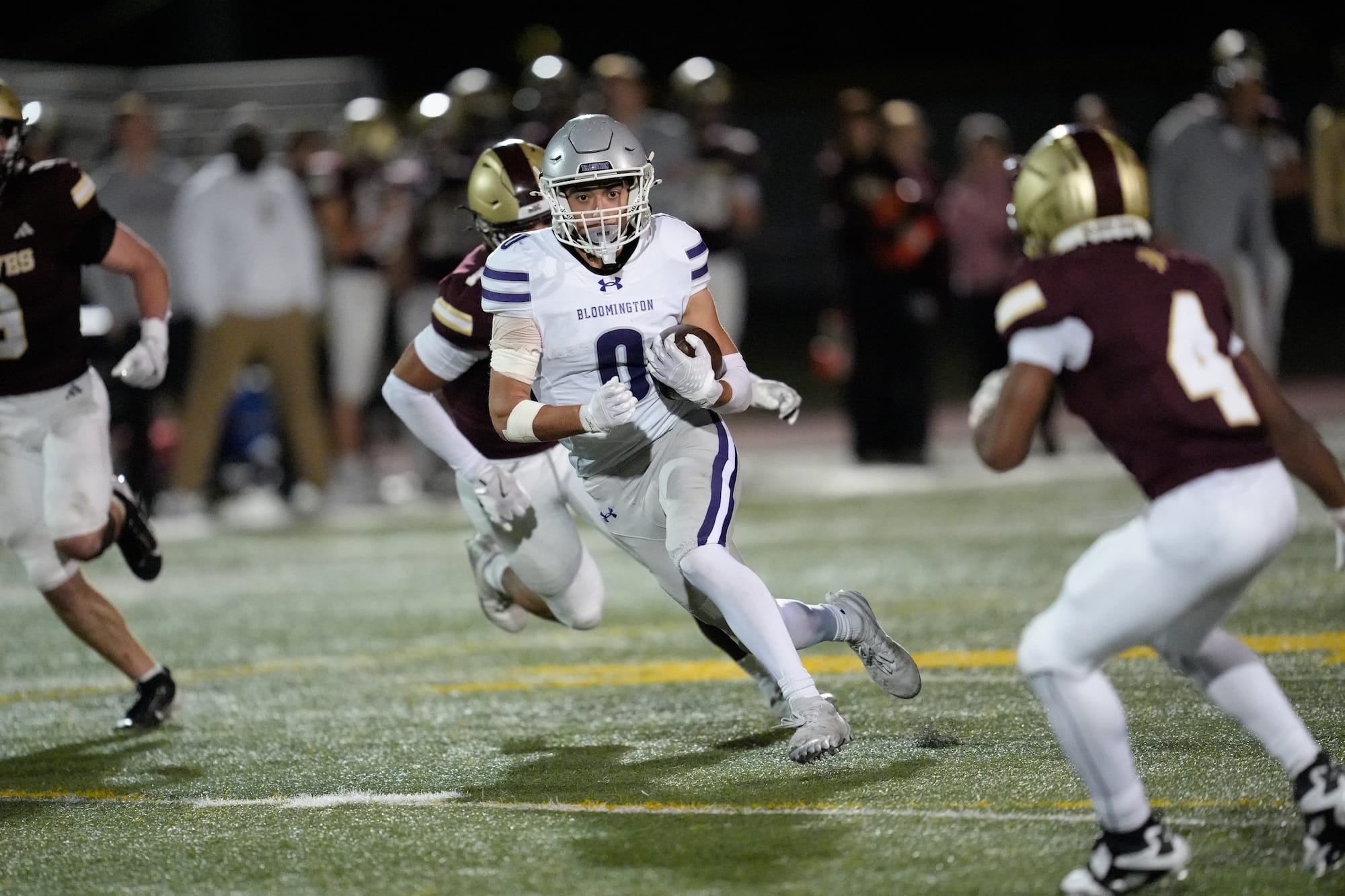 Sam Giles (0) carries the ball for Bloomington South. (Dave Quick, Oct. 10, 2025)