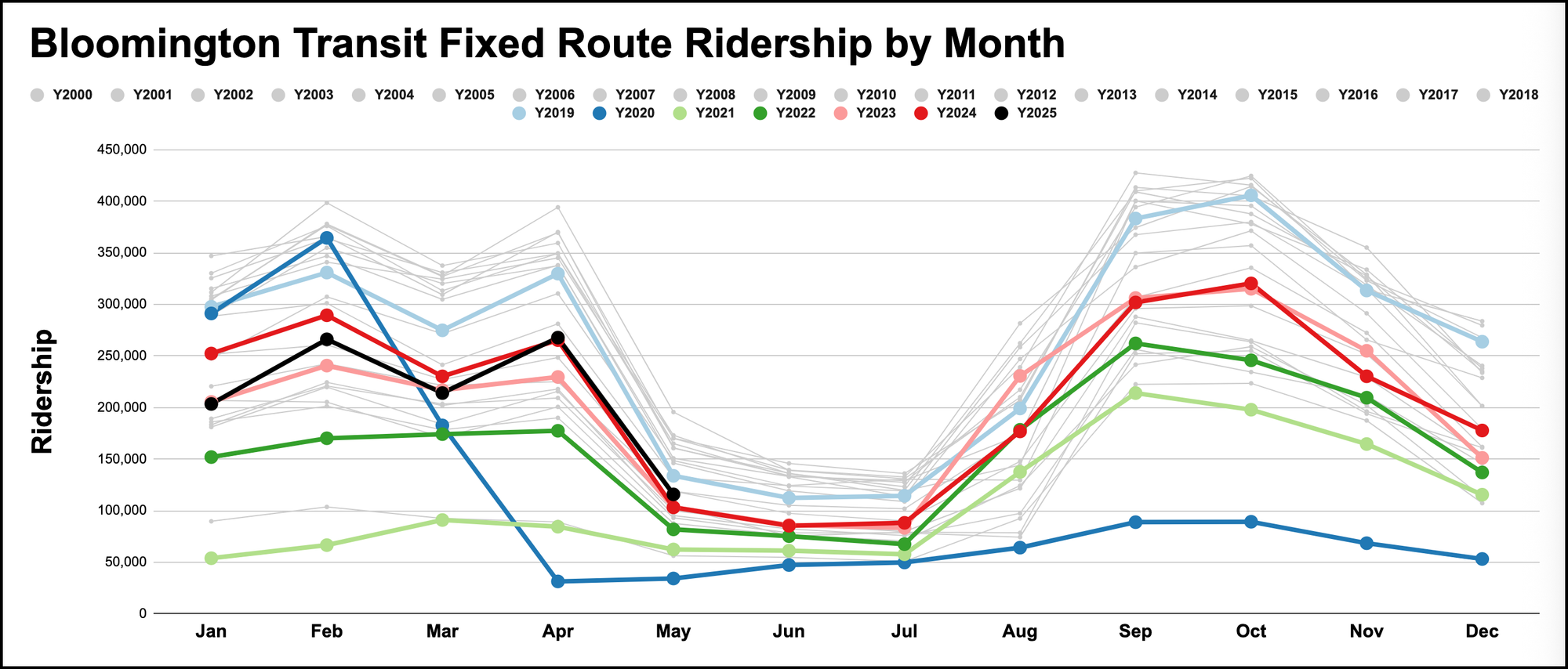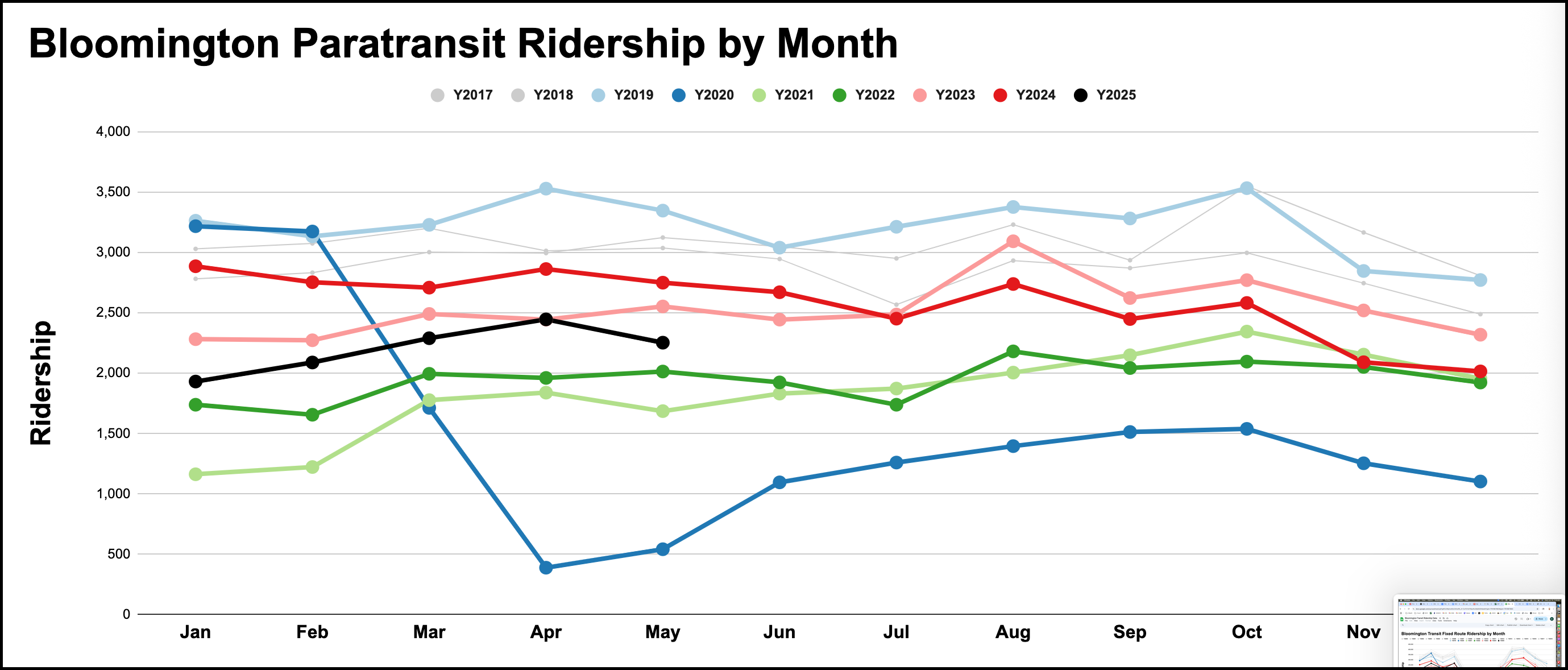Ridership on fixed routes is up for the most recent month, but still down year-to-date compared to 2024. The 115,789 rides in May this year were 12% better than May 2024. So May marked the second month in a row that the 2025 fixed ridership numbers have outpaced the corresponding 2024 numbers by at least a little bit. That's after starting the year with three months in a row that showed lower monthly totals. Shelley Strimaitis, who is planning and special projects manager for BT, told the board that some of the better ridership in May is due to Indiana University's schedule, which included more days in May this year than last year. The year-to-date figure of 1,067,259 is still about 6.4% less than last year.