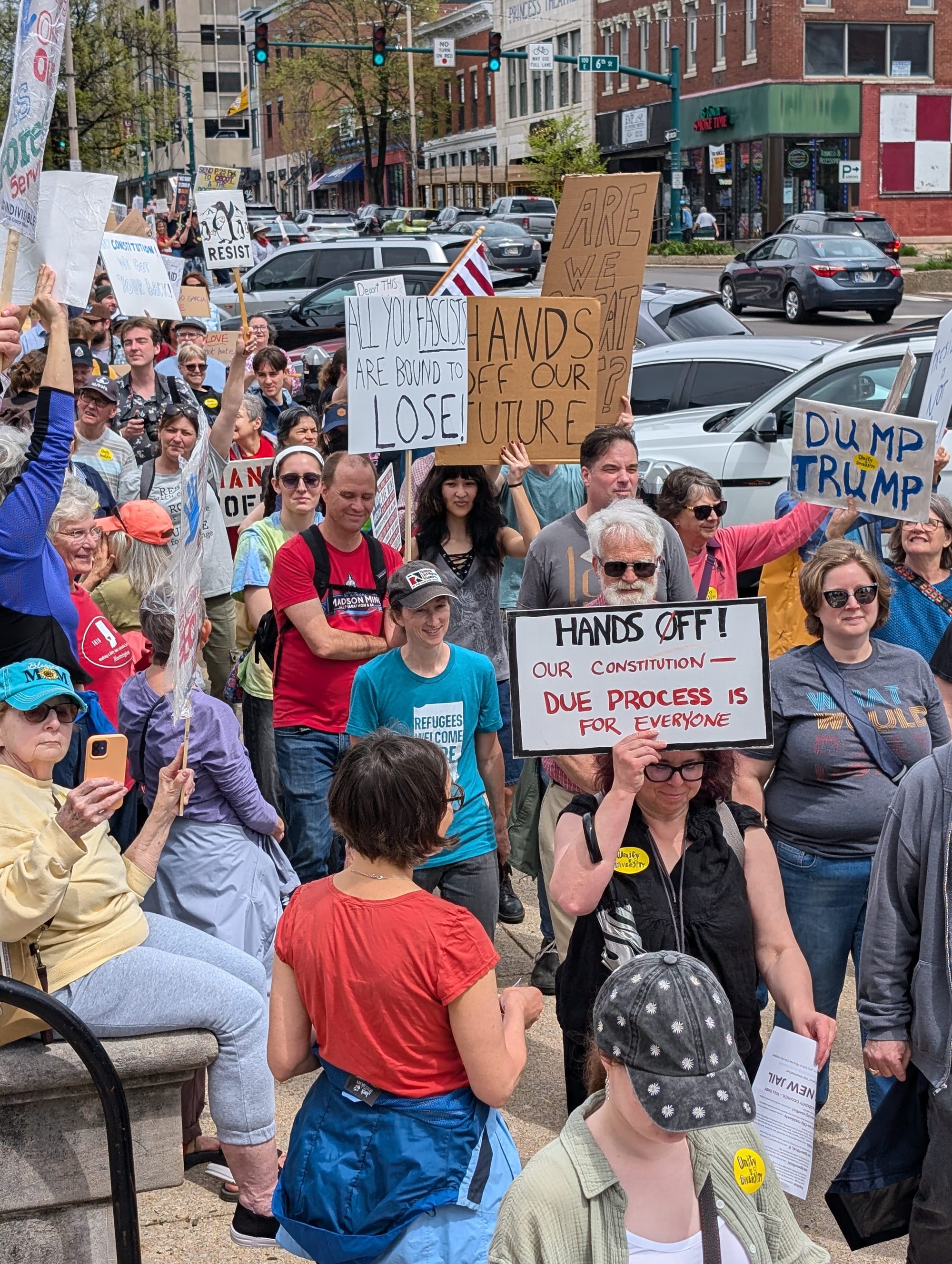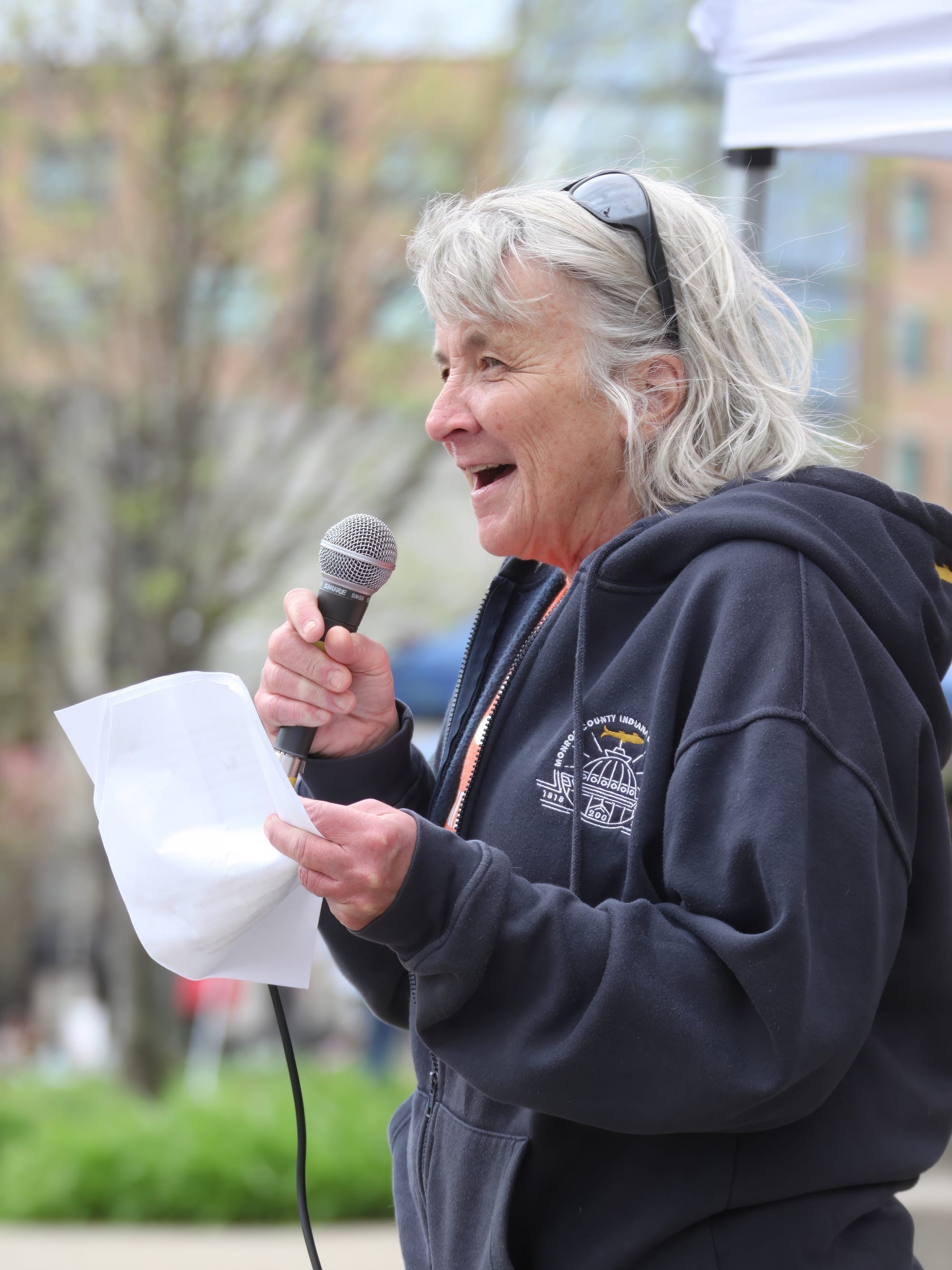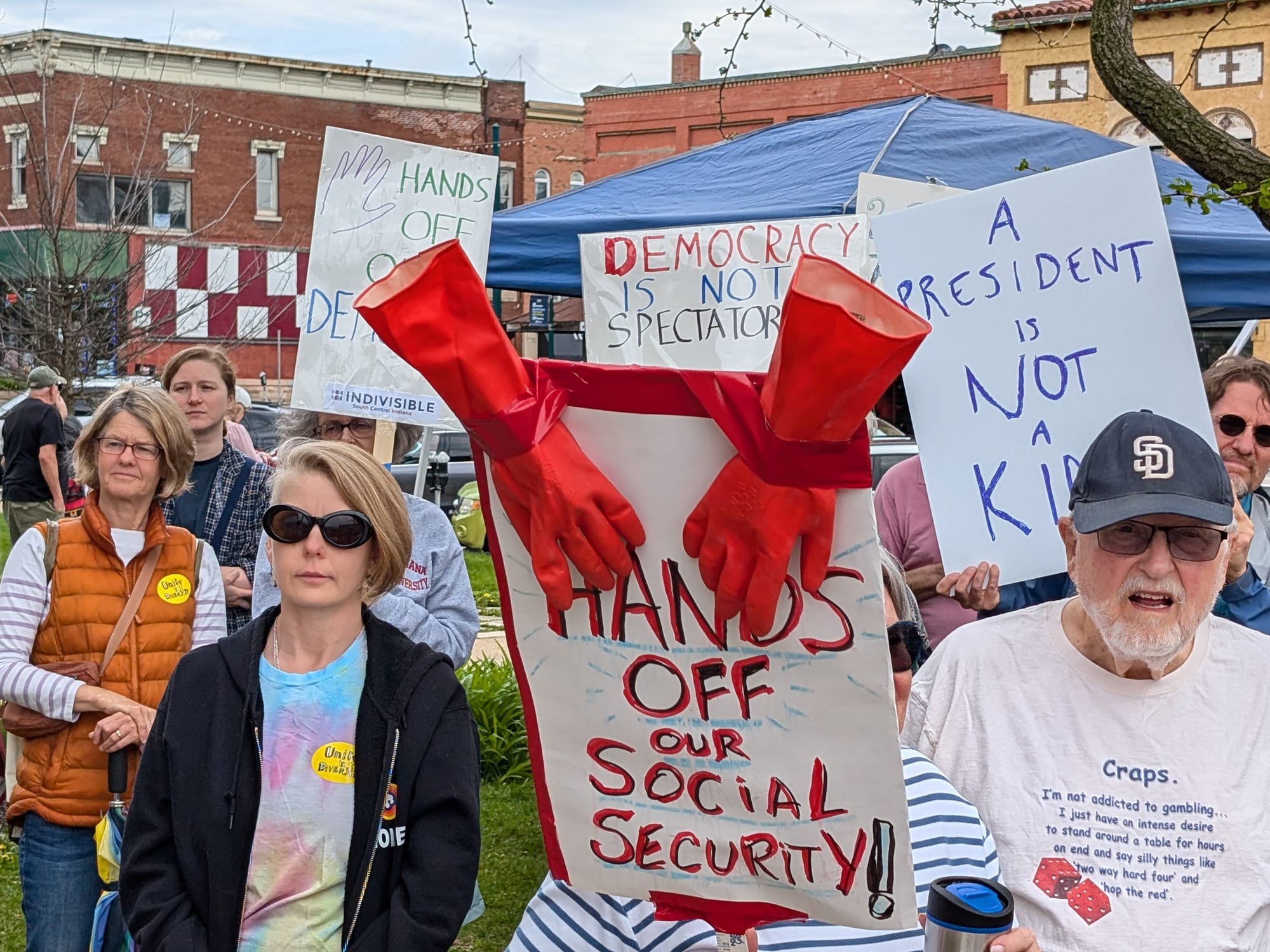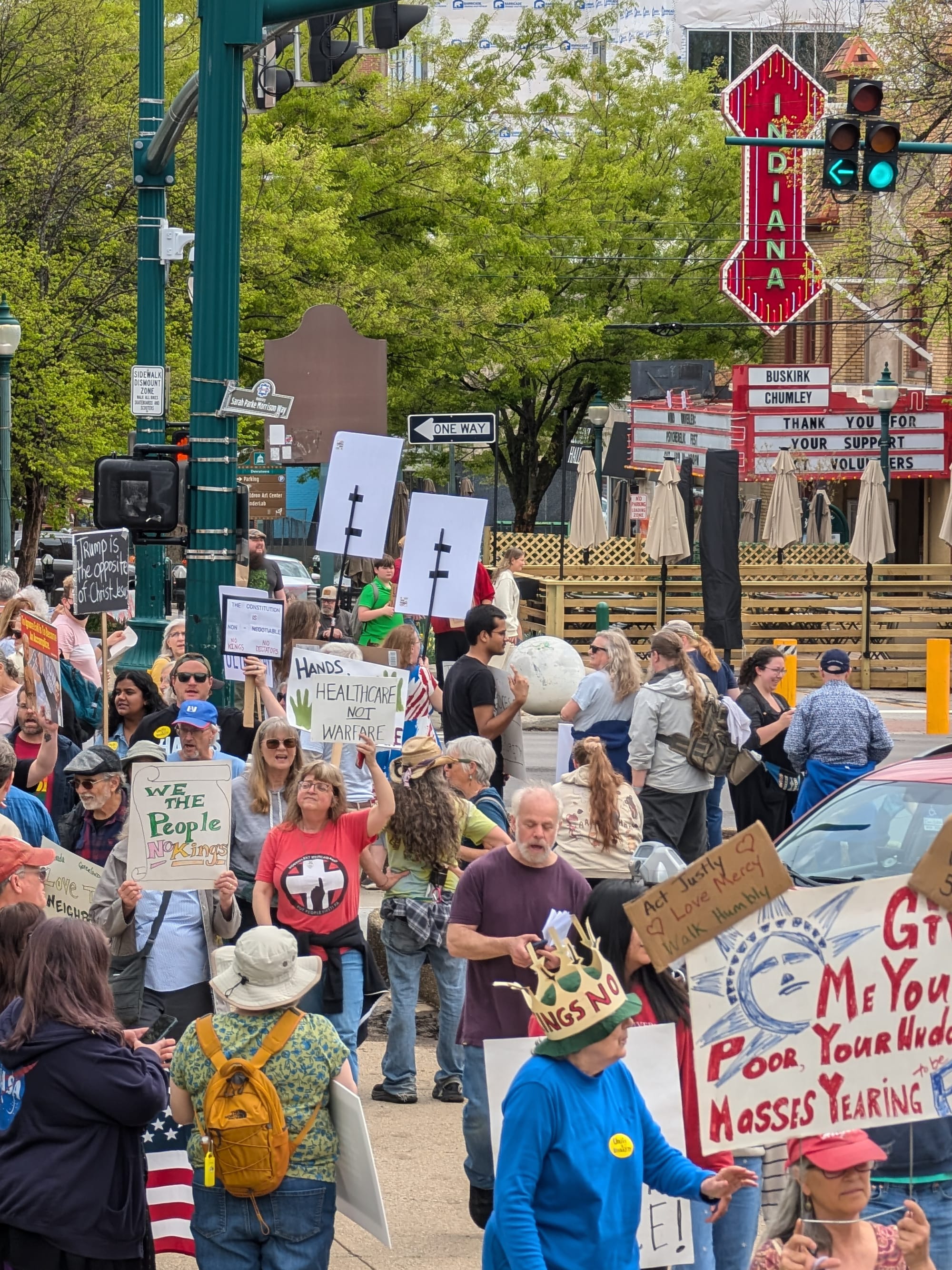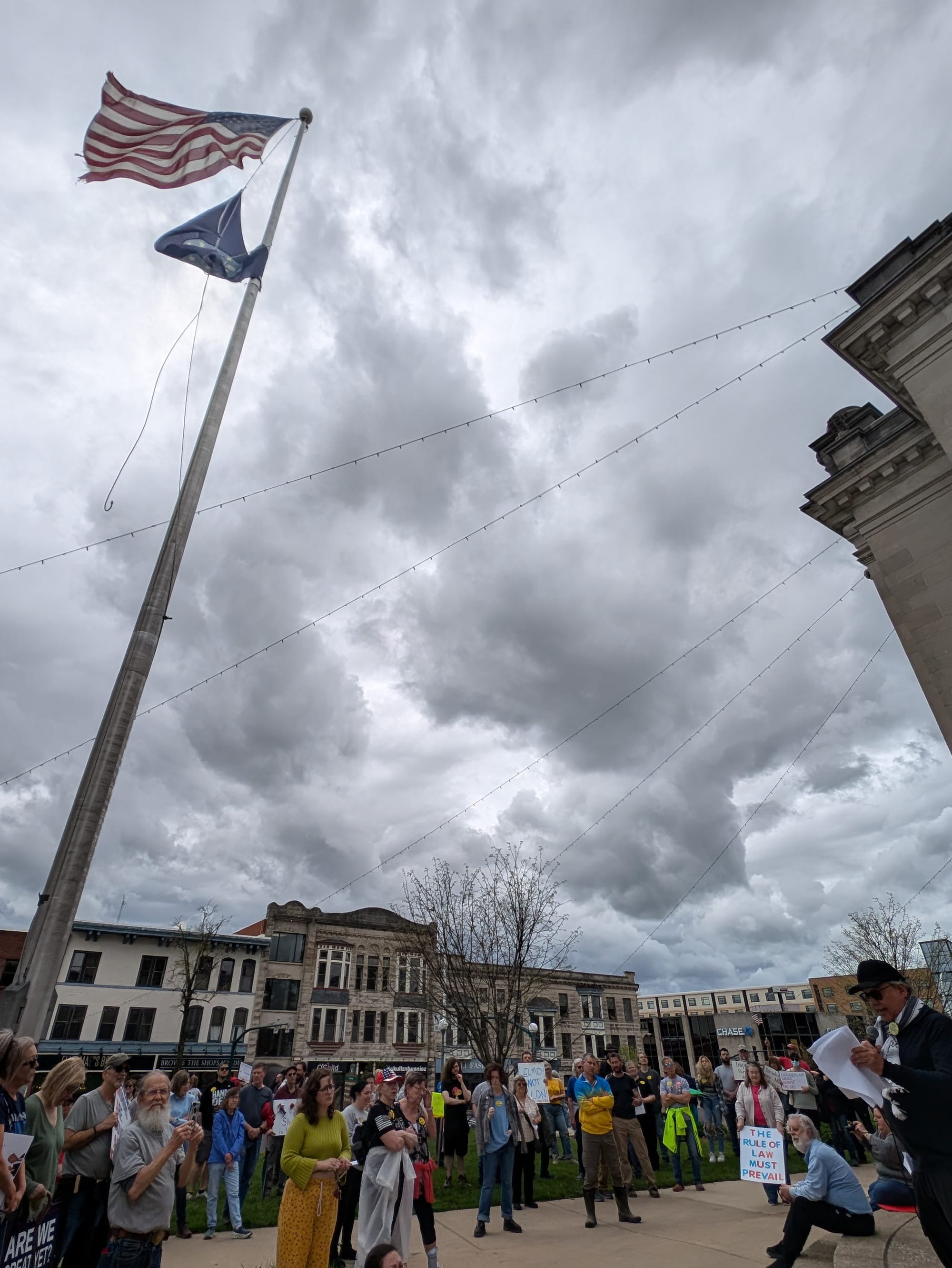 Bloomington's edition of the 50501 Movement's national day of protests kicked off at noon on Saturday (April 19) at the city's traditional venue for such demonstrations, the southeast corner of the historic Monroe County courthouse.