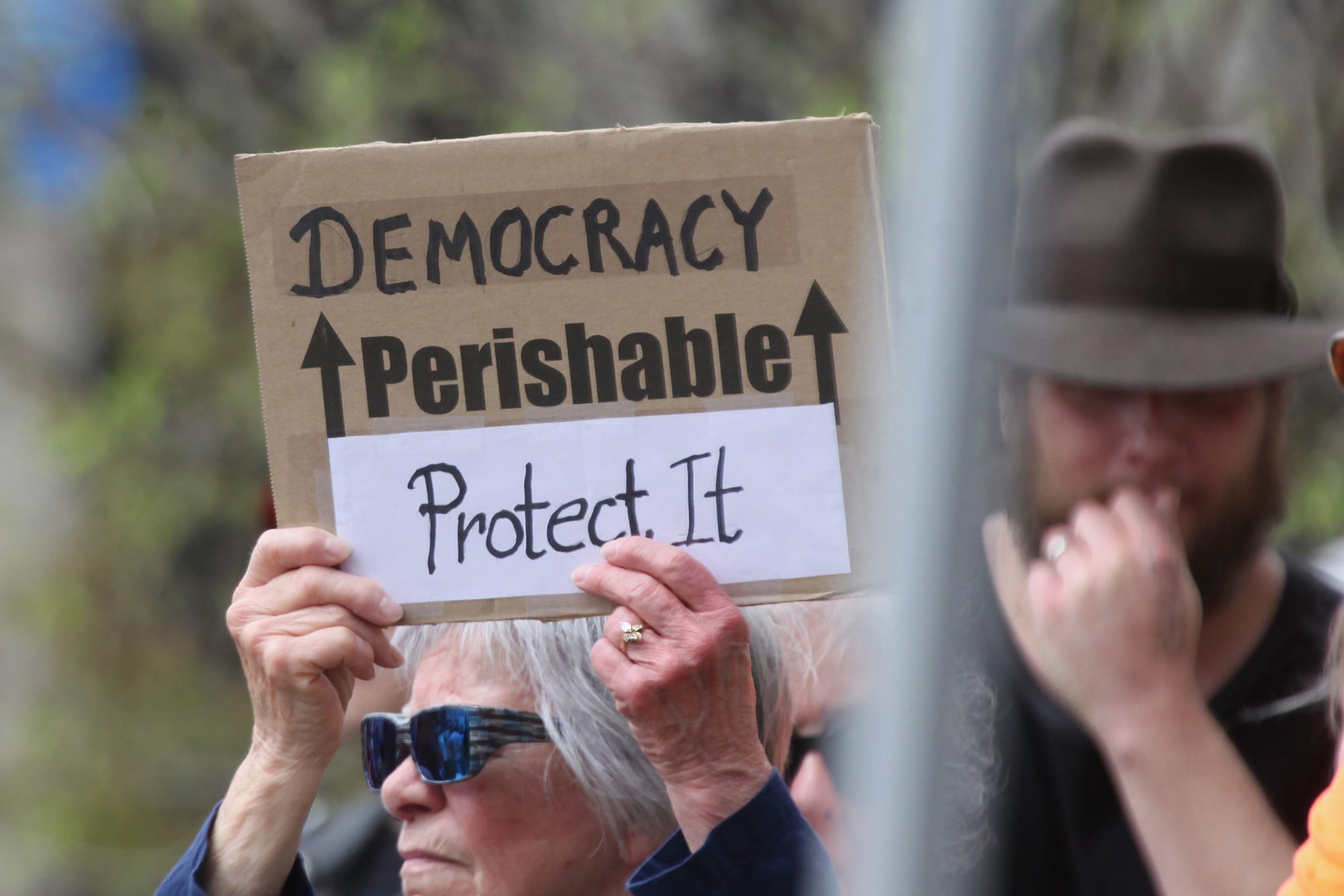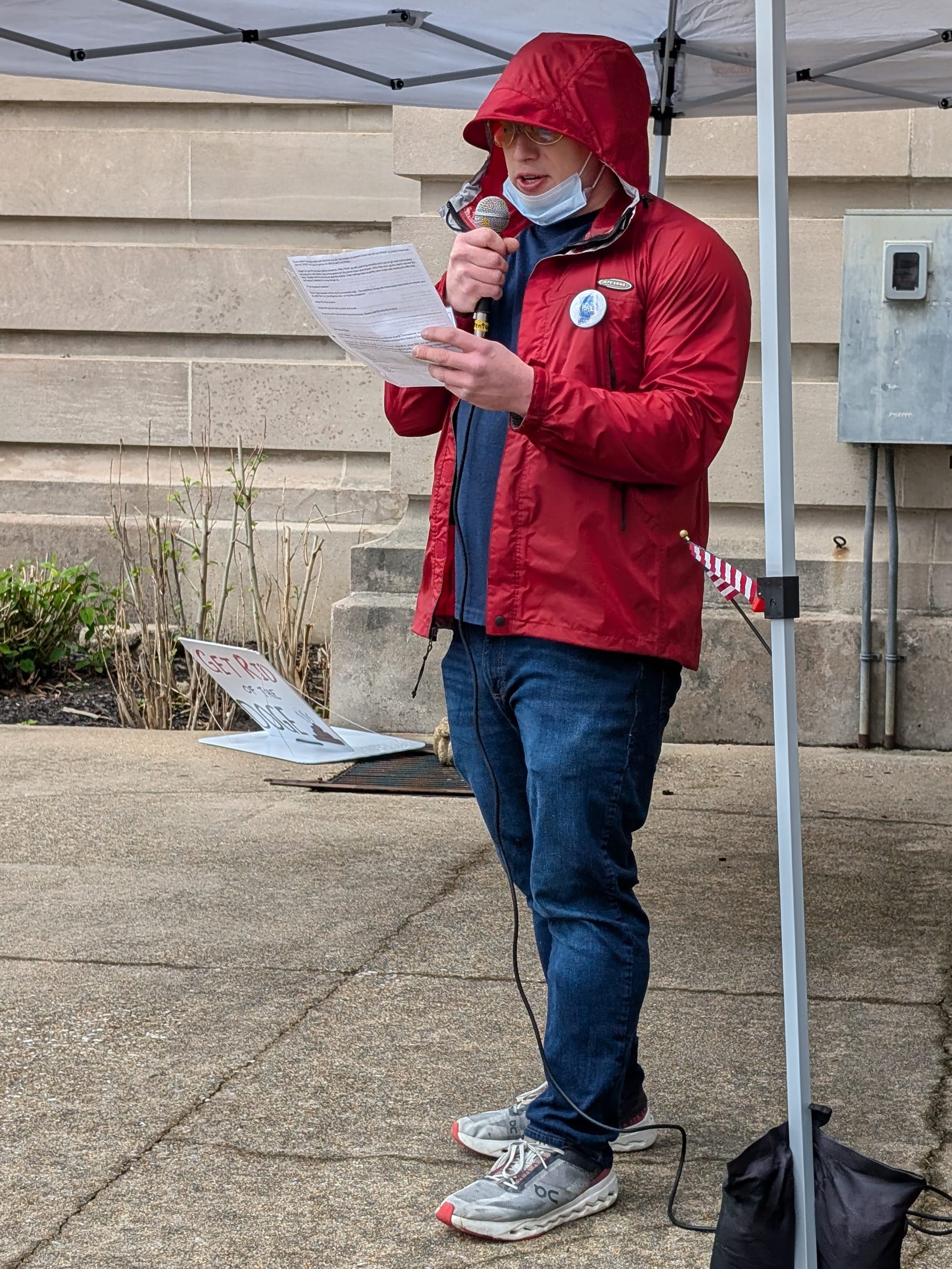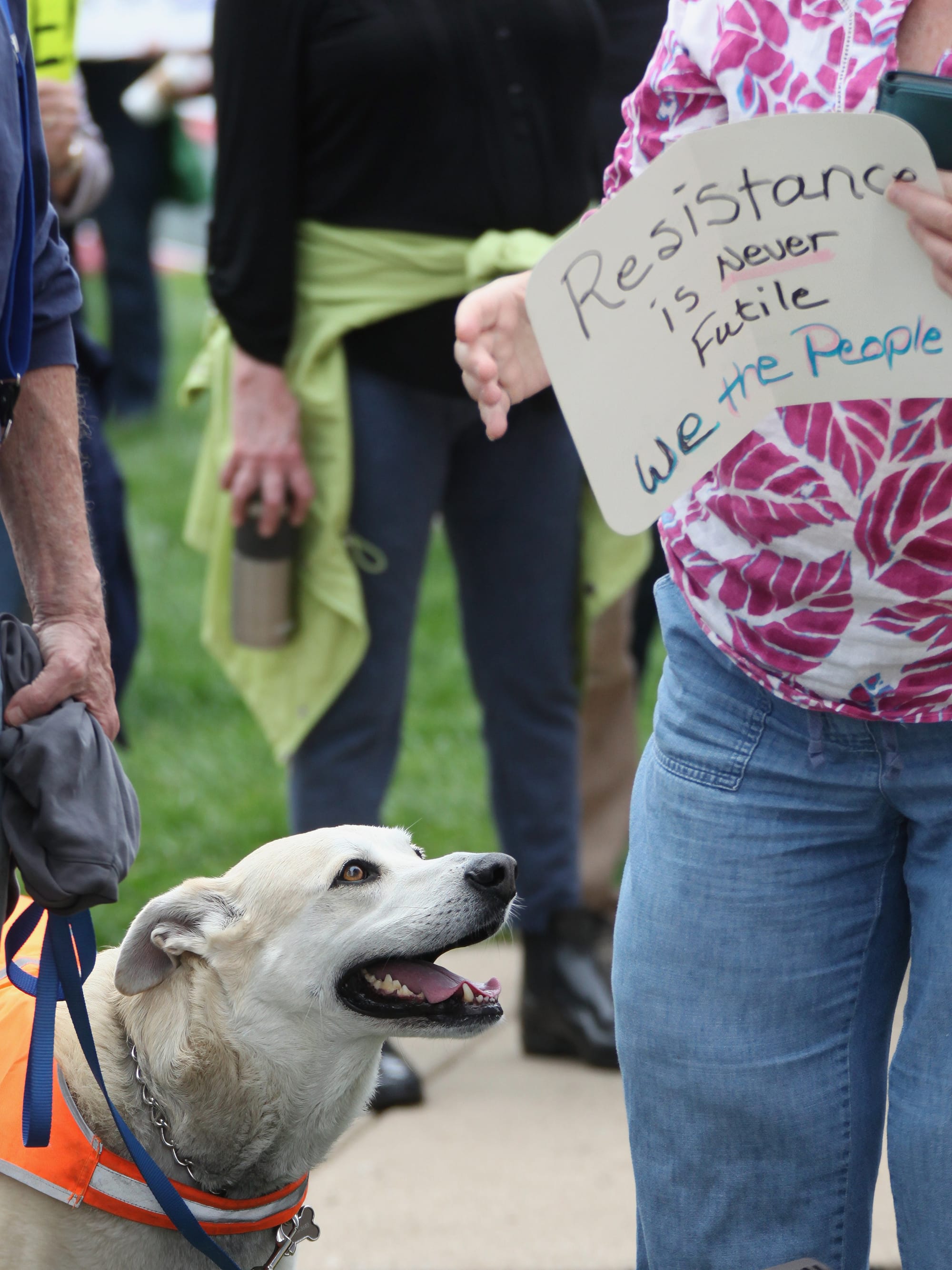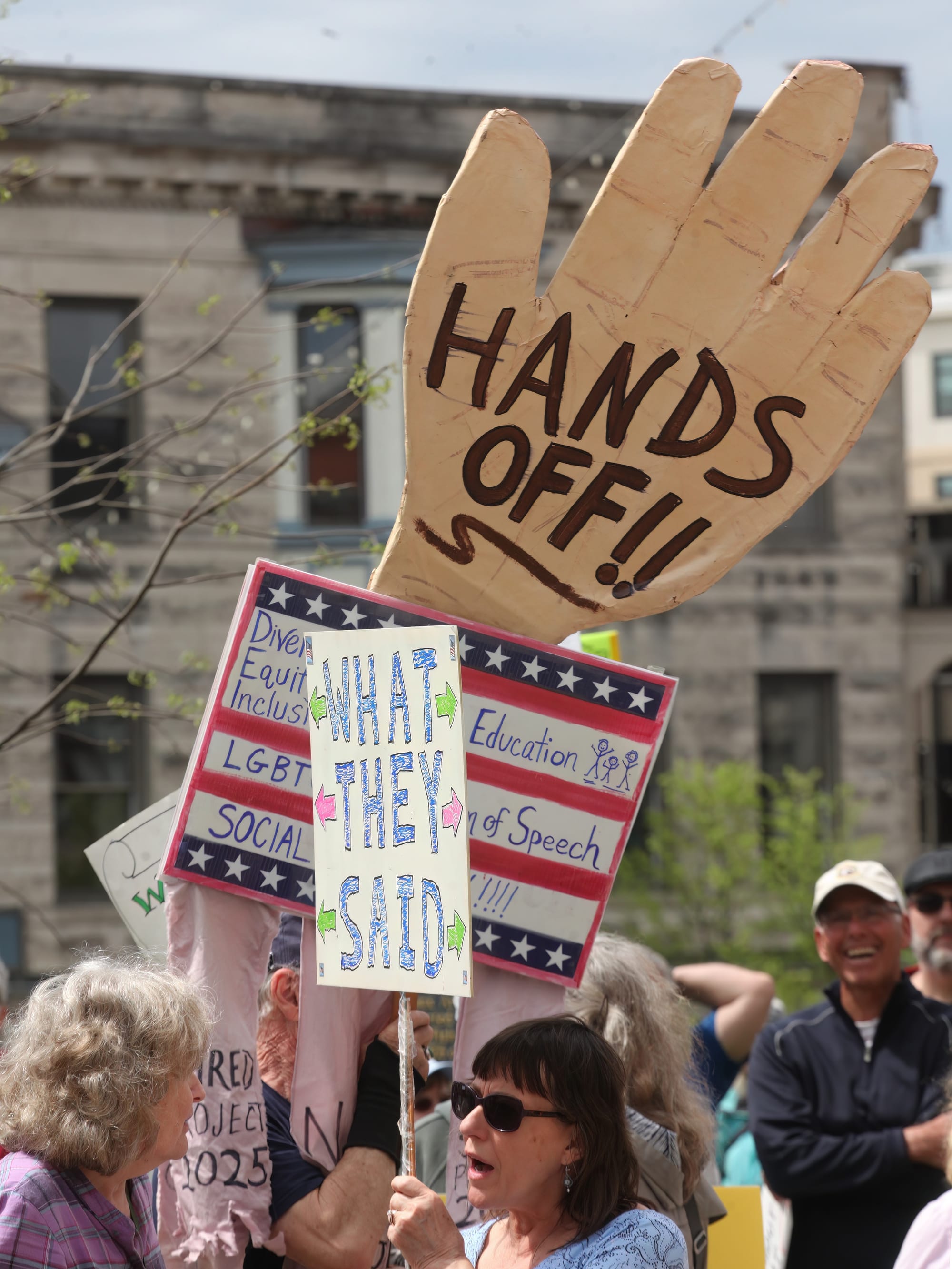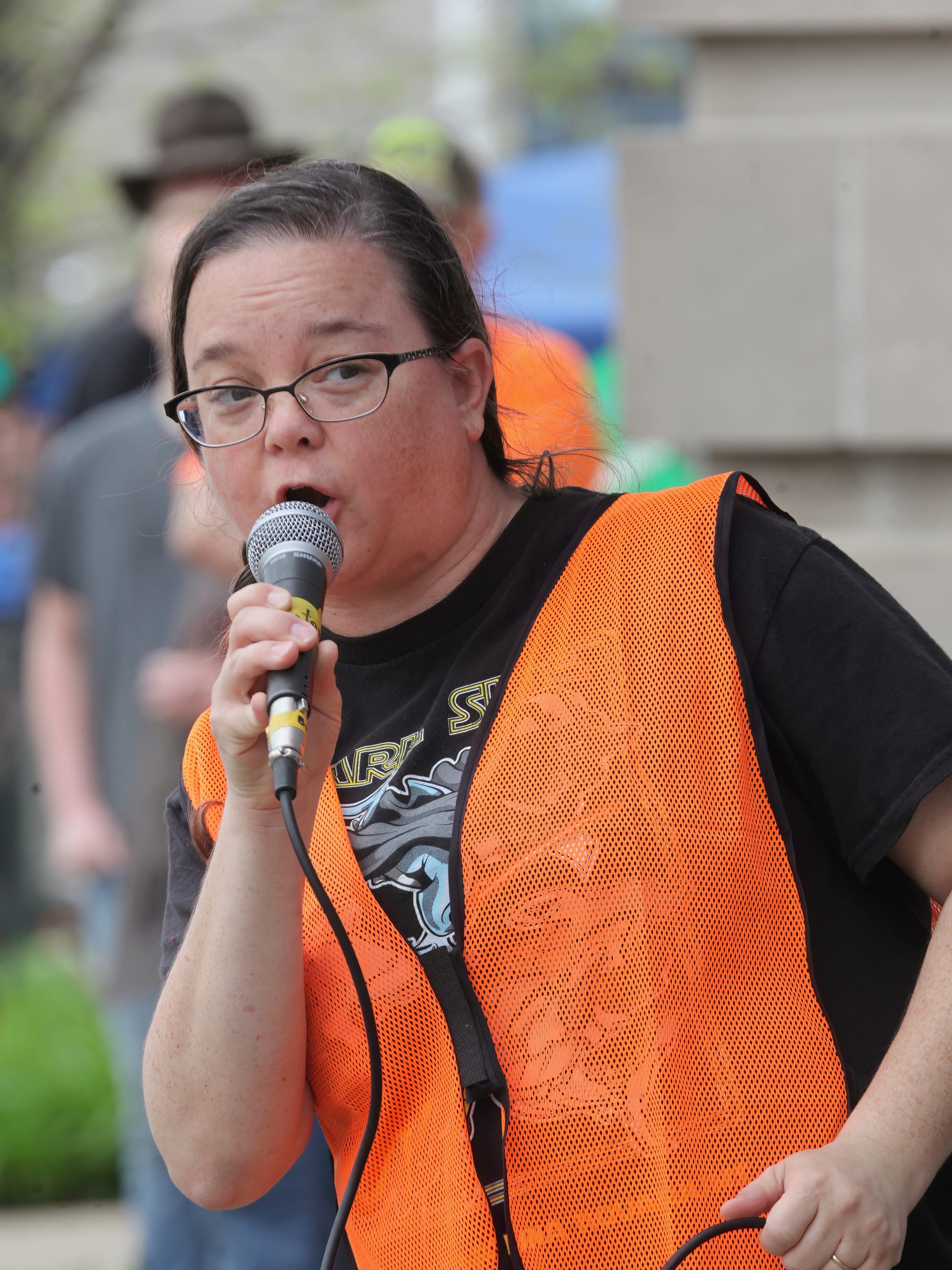 Bloomington's edition of the 50501 Movement's national day of protests kicked off at noon on Saturday (April 19) at the city's traditional venue for such demonstrations, the southeast corner of the historic Monroe County courthouse.