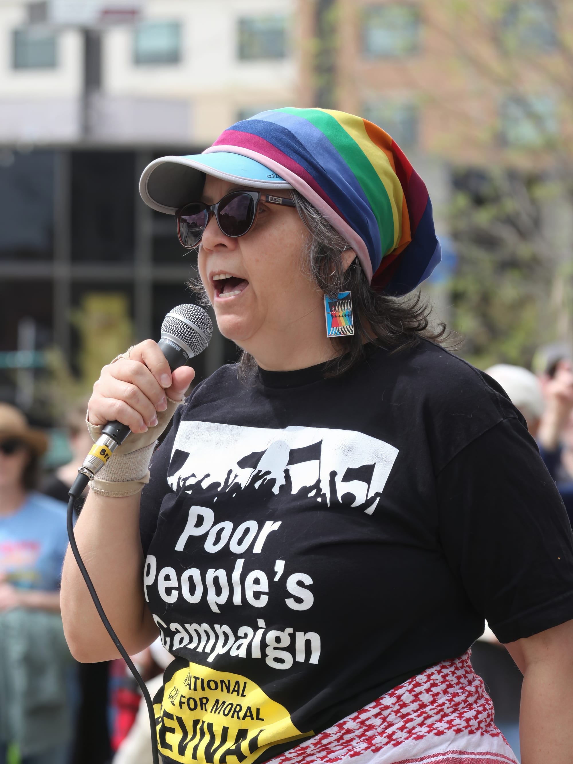 Addressing the crowd on the topic of food security was Monroe County commissioner Julie Thomas, who said, "Hungry people can't fight. They struggle to learn, and they struggle to work." Thomas continued: "Hungry people live in the tyranny of the moment focusing on food. They don't have time to attend a rally or call their member of Congress." Thomas added, "I appreciate everyone who brought food today, helping to feed your neighbors, but we cannot stop now."