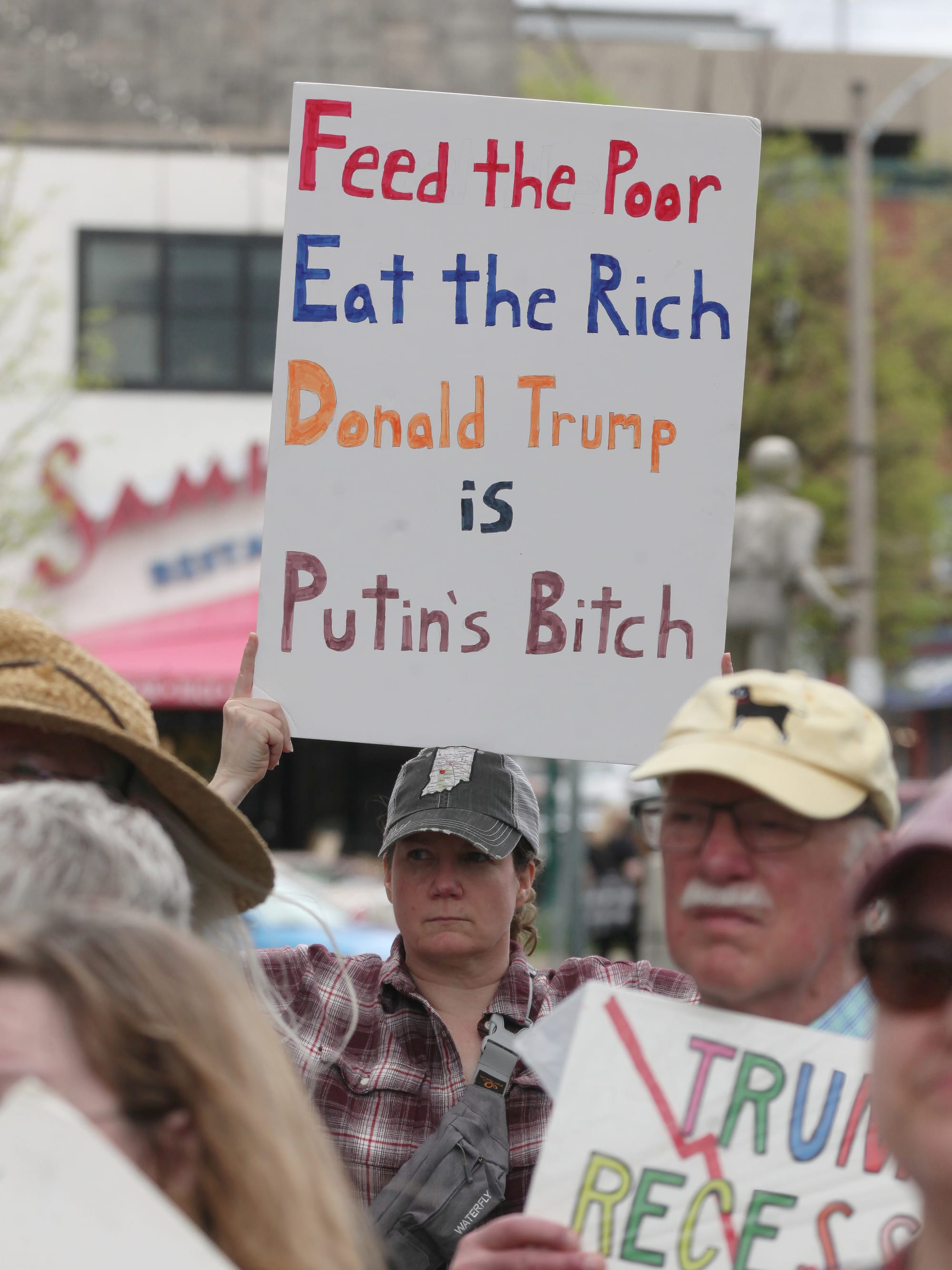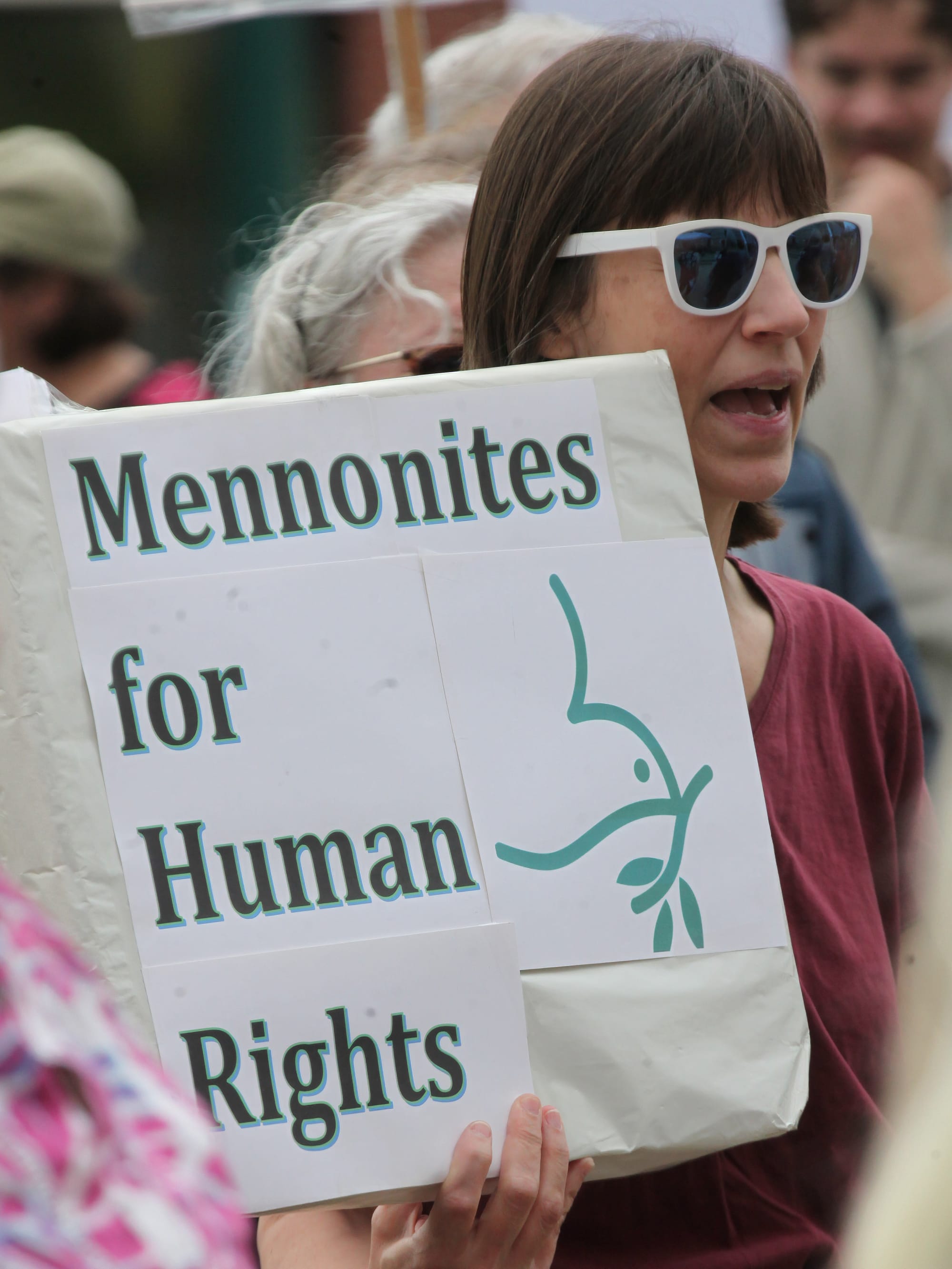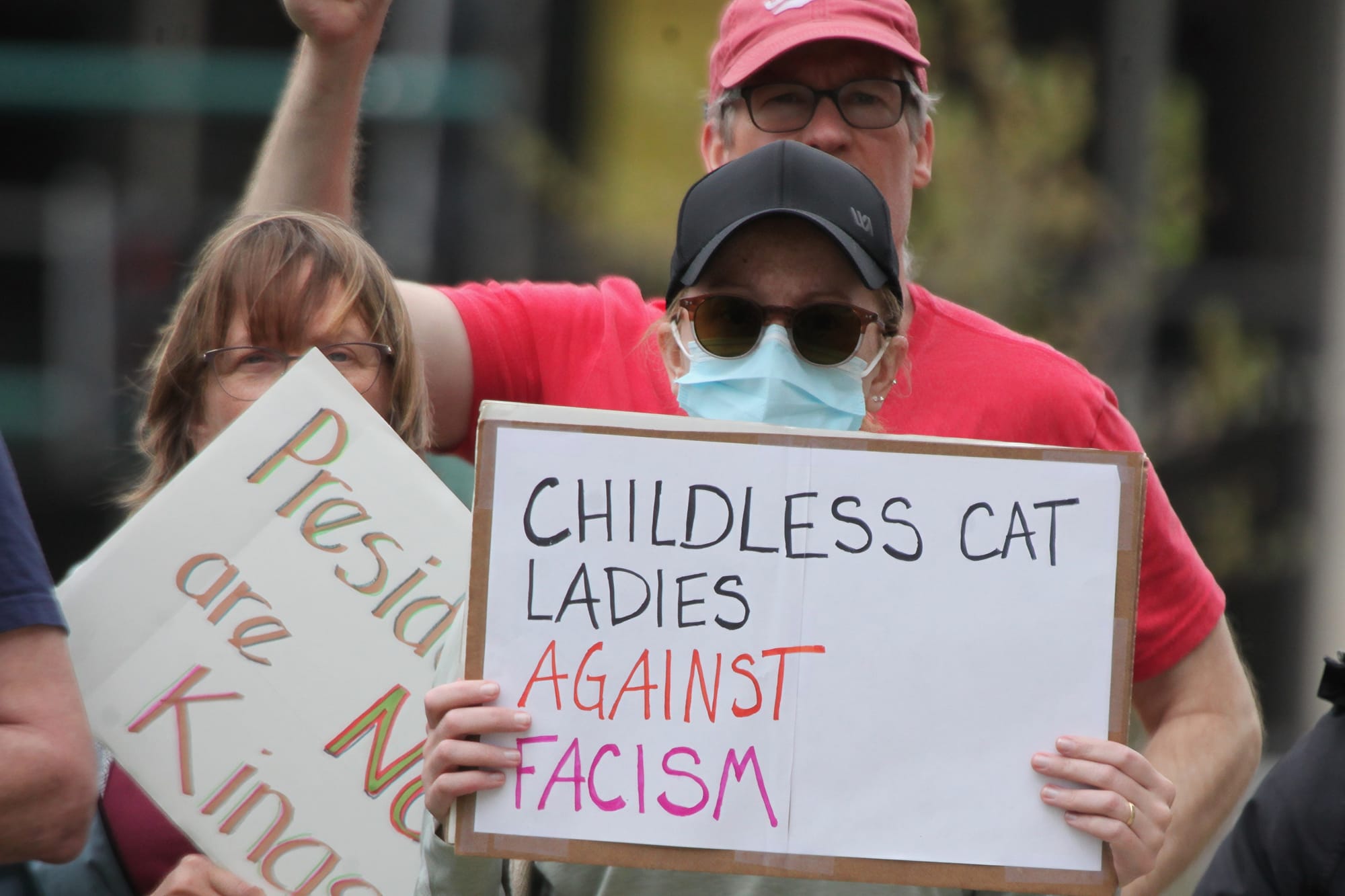 An estimated 500 people heard speeches, sang songs, chanted, and waved signs, drawing general support from motorists who honked as they drove north on Walnut Street past the courthouse.