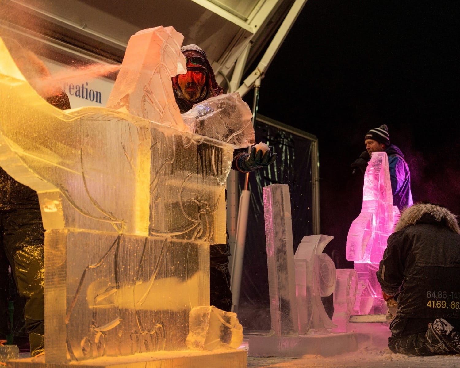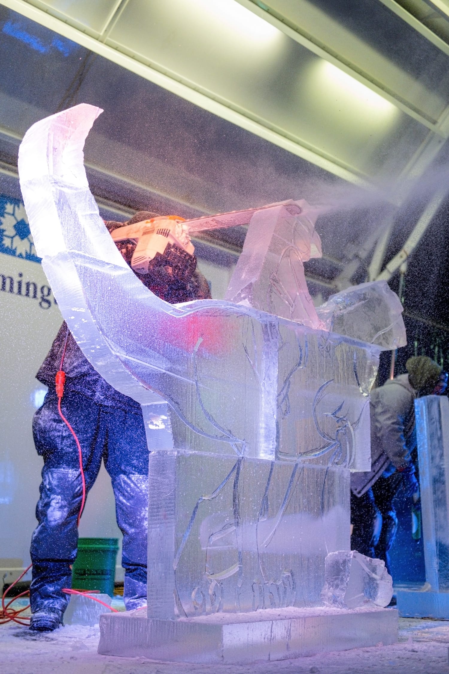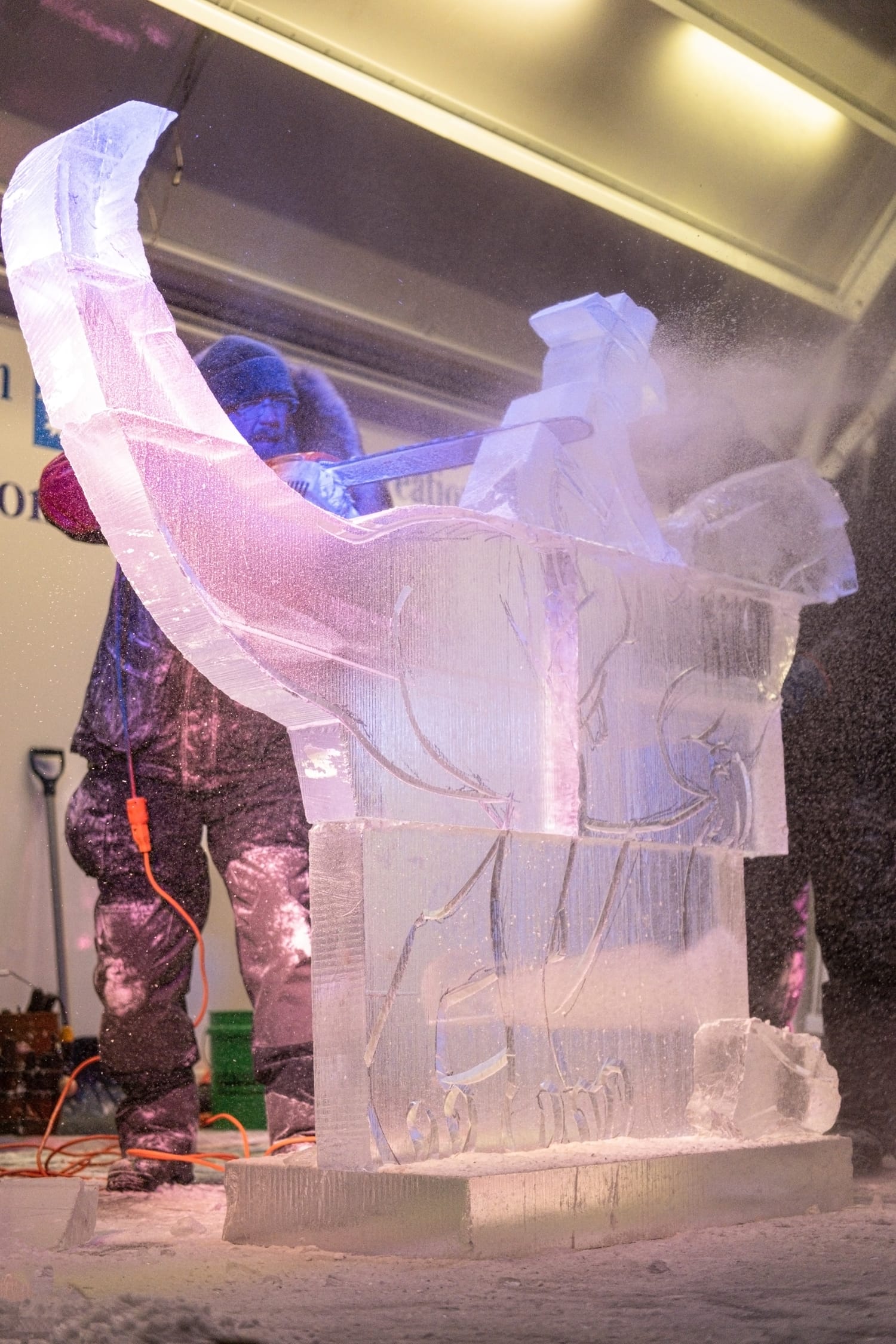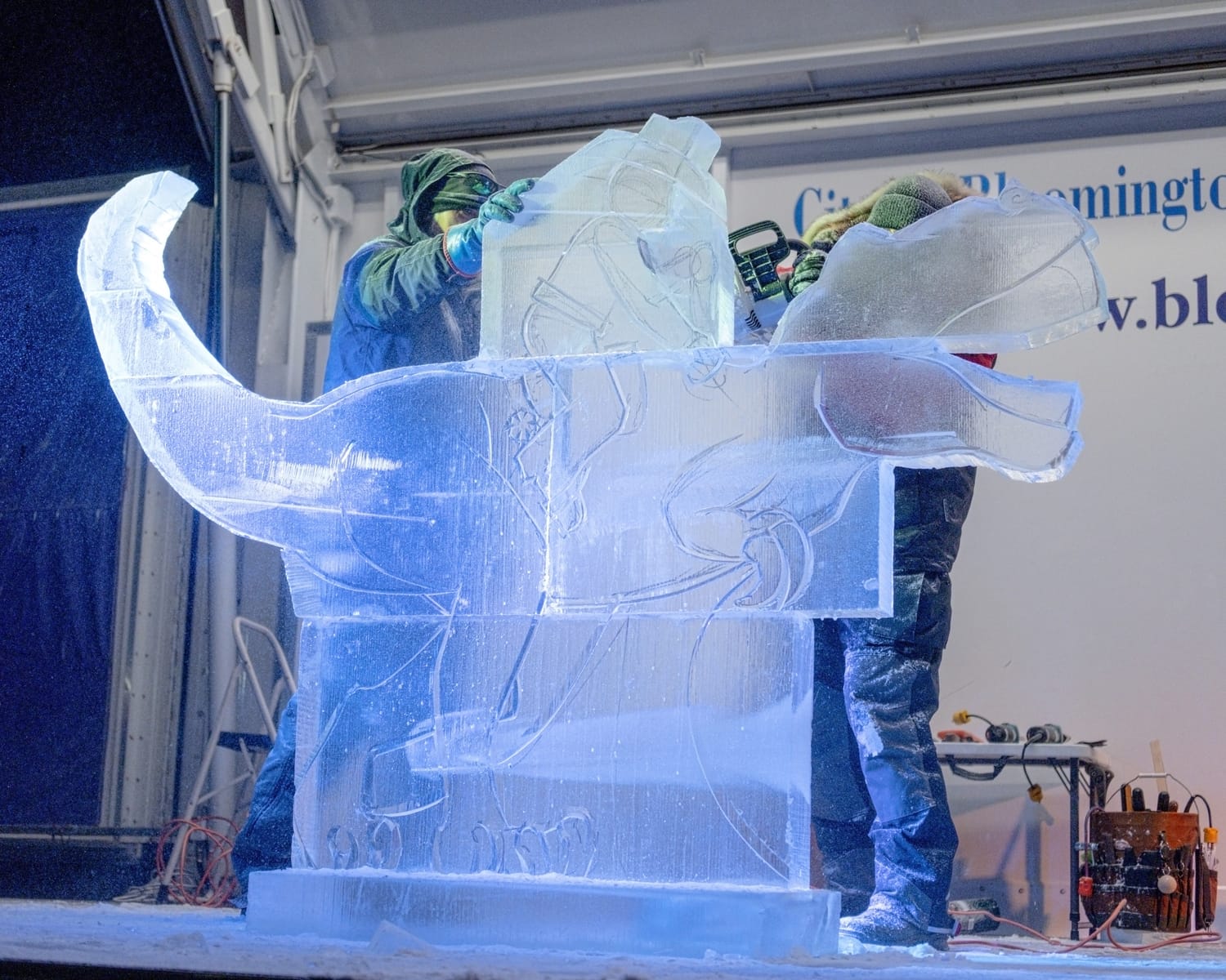 During the competition, the head of the dinosaur sculpture briefly broke off, a moment that drew laughter from the crowd and was treated by the sculptors as a happy accident. The piece was quickly reattached using water—which freezes almost instantly in subzero conditions—serving as a reminder that, in ice carving, water is glue.