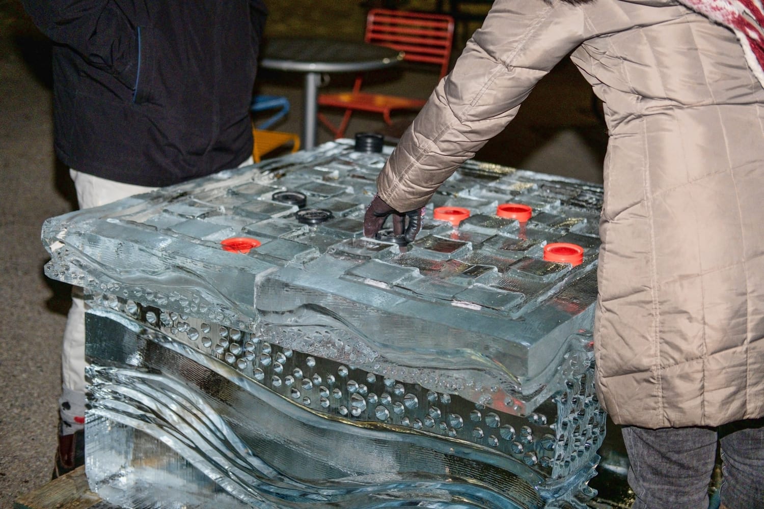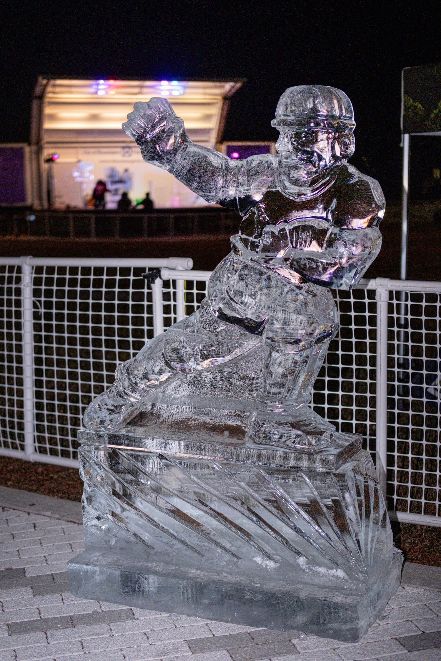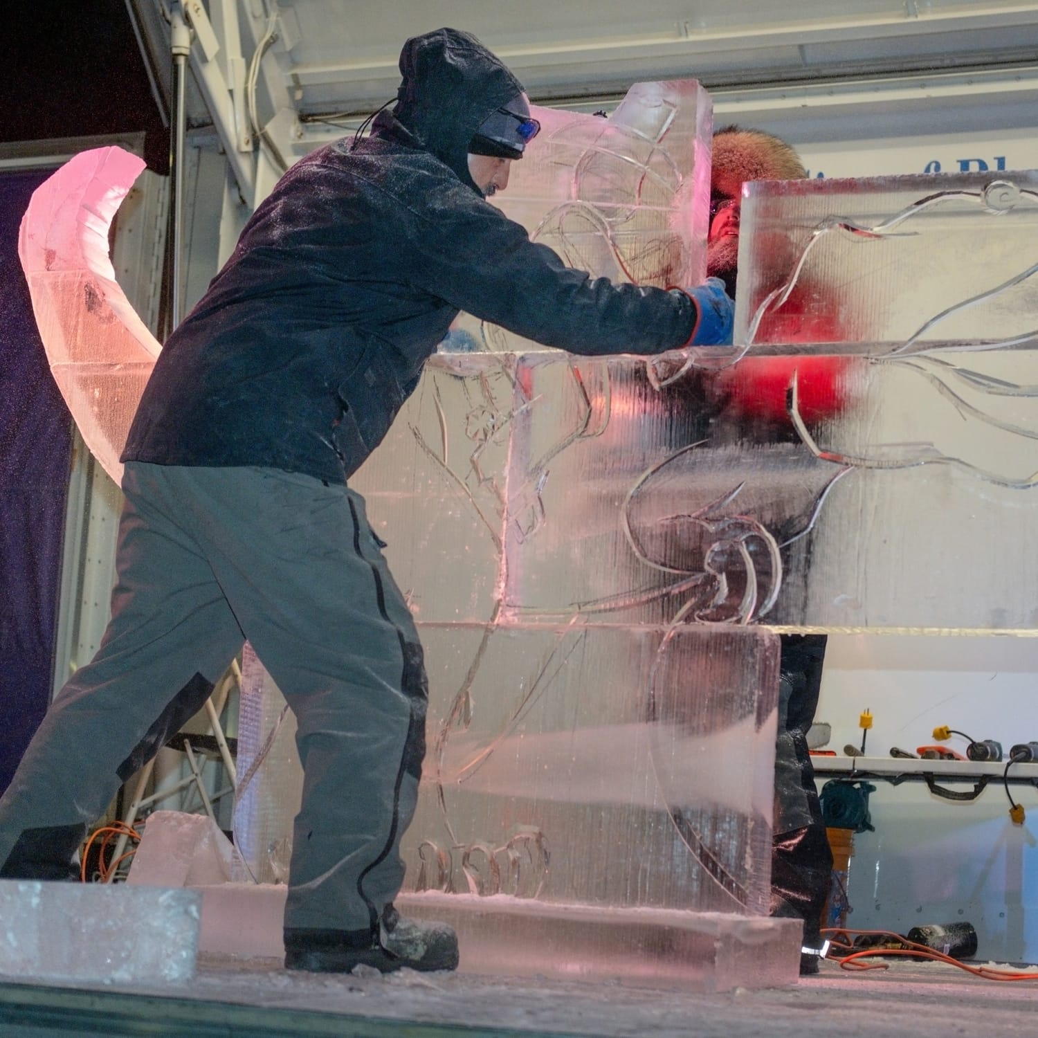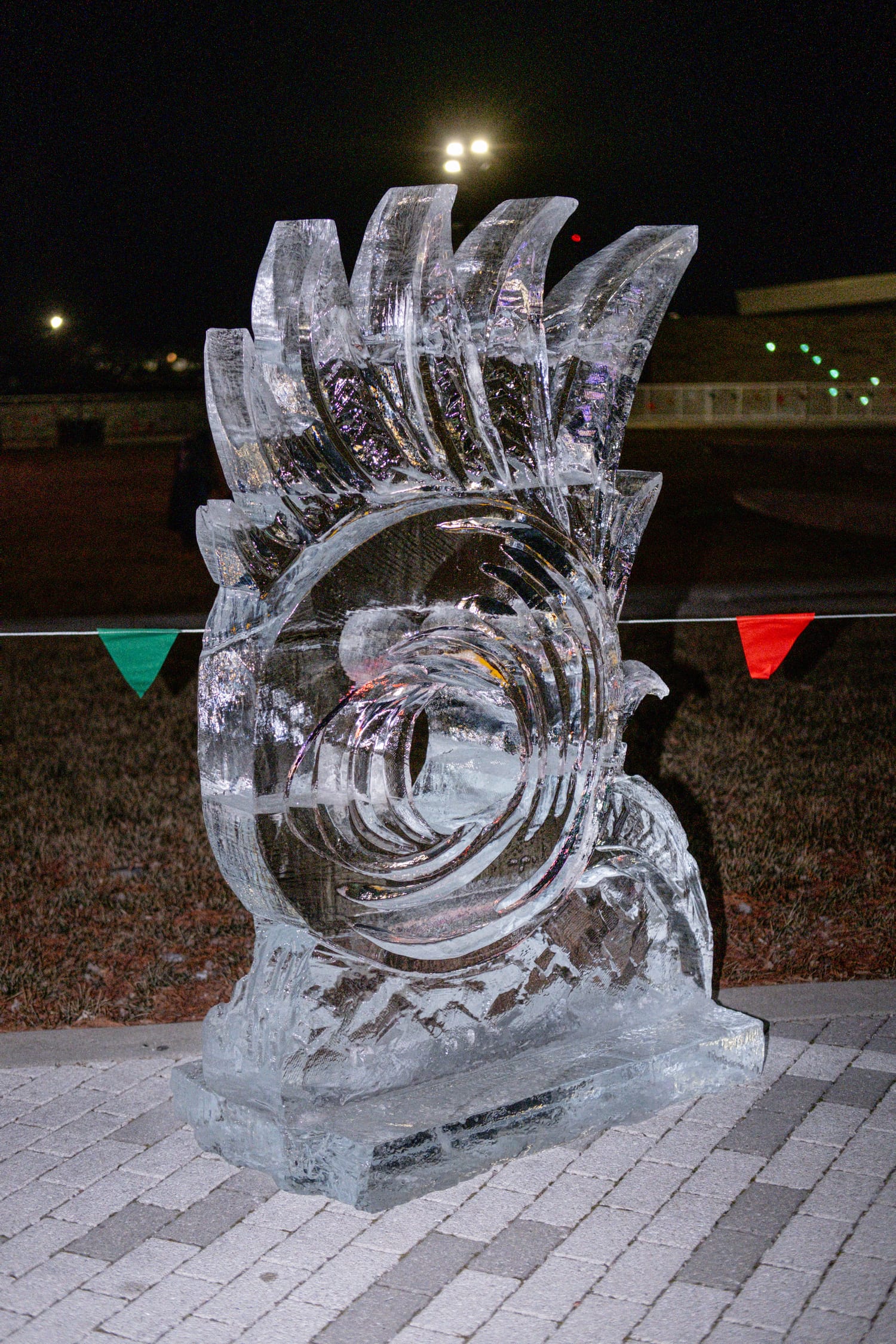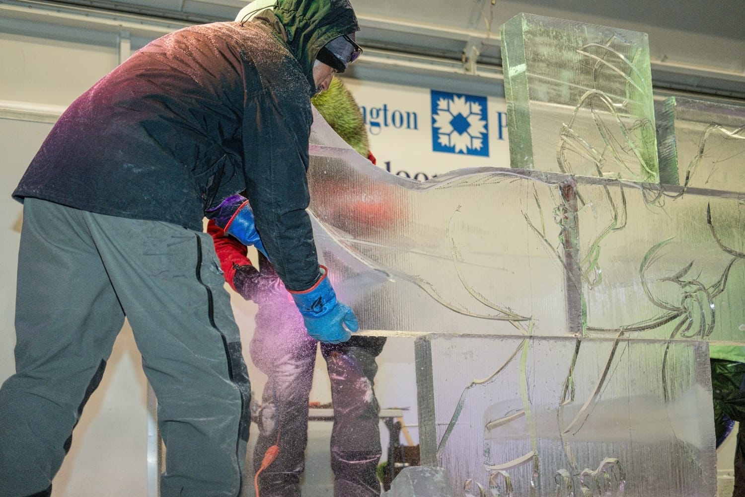During the competition, the head of the dinosaur sculpture briefly broke off, a moment that drew laughter from the crowd and was treated by the sculptors as a happy accident. The piece was quickly reattached using water—which freezes almost instantly in subzero conditions—serving as a reminder that, in ice carving, water is glue.