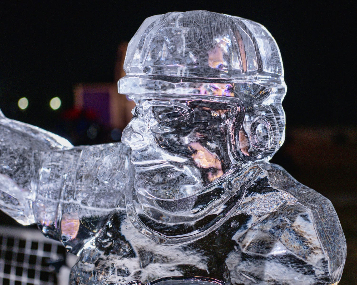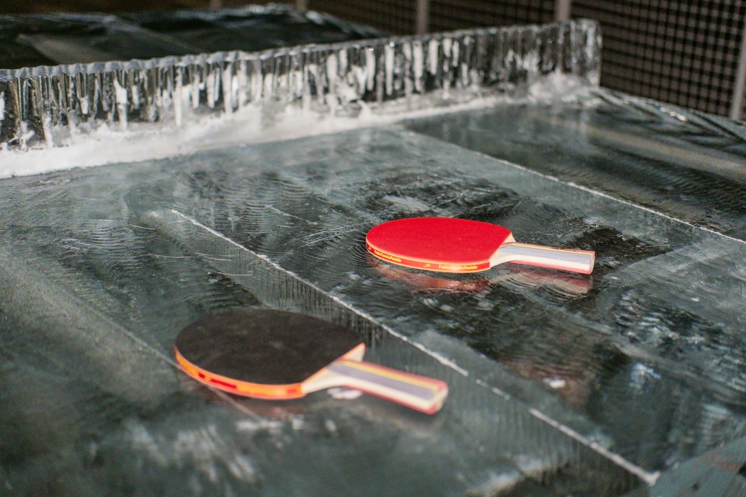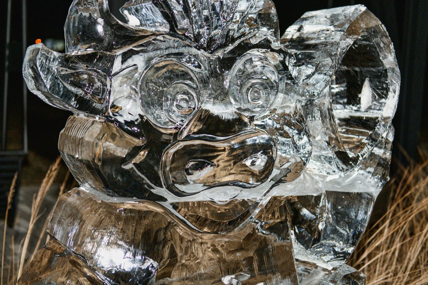 The ice-carvings featured playful designs, including a cowboy riding a dinosaur, Winnie the Pooh, Olaf from Frozen, and functional sculptures such as an ice checkerboard and ping-pong table.