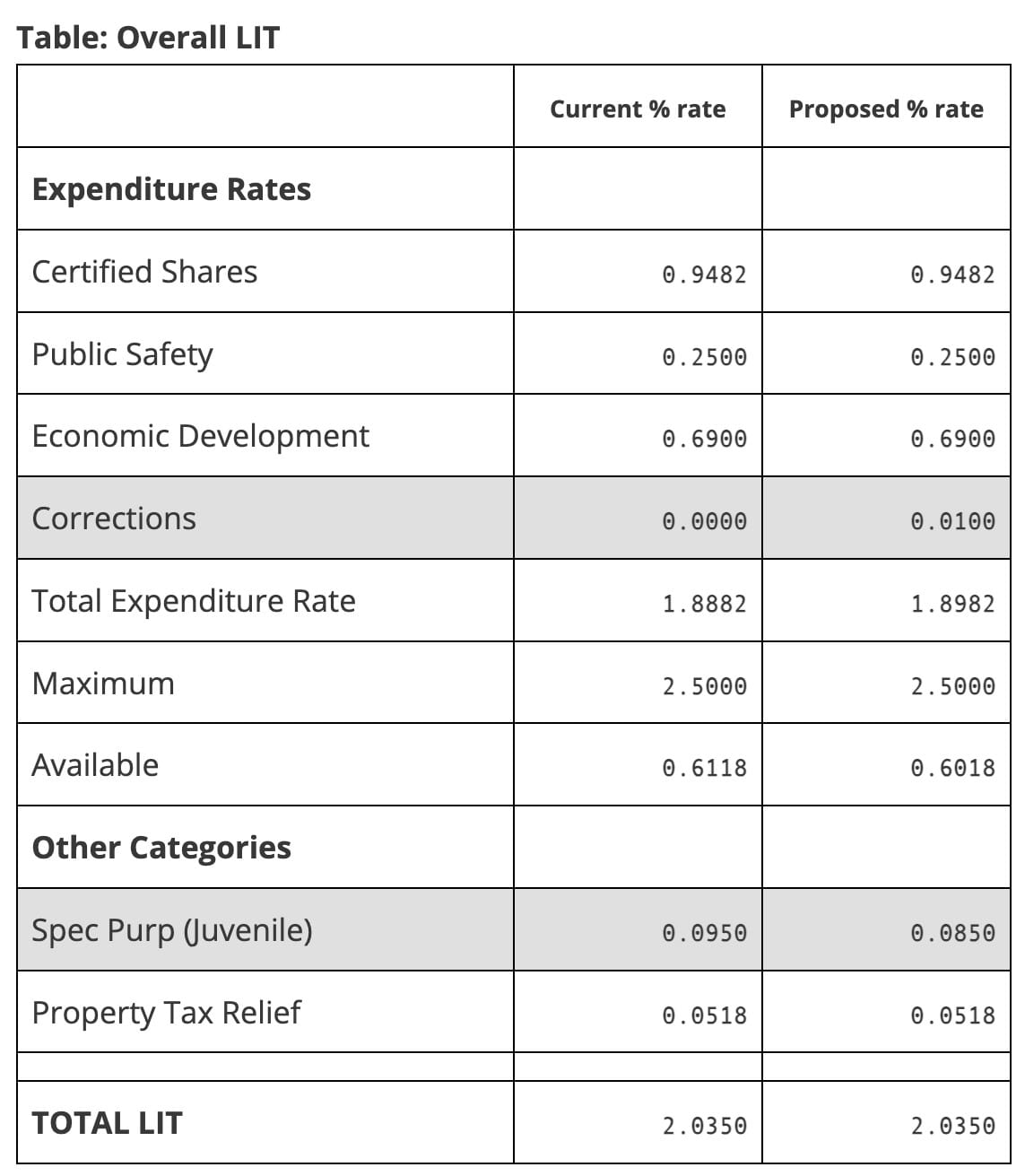 For now, the county council is just looking to shift one category of local income tax to another. The idea is to reduce by 0.01 percent the LIT in a category called the special purpose LIT, but to impose, for the first time, a rate in the corrections LIT by a corresponding 0.01 percent.