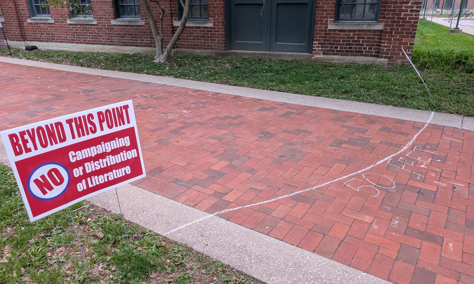 Left: No campaigning is allowed within 50 feet of the polls. Right: This is looking south down the sidewalk by the Showers building when all the campaign signs were still in place. (Dave Askins, April 7, 2026)
