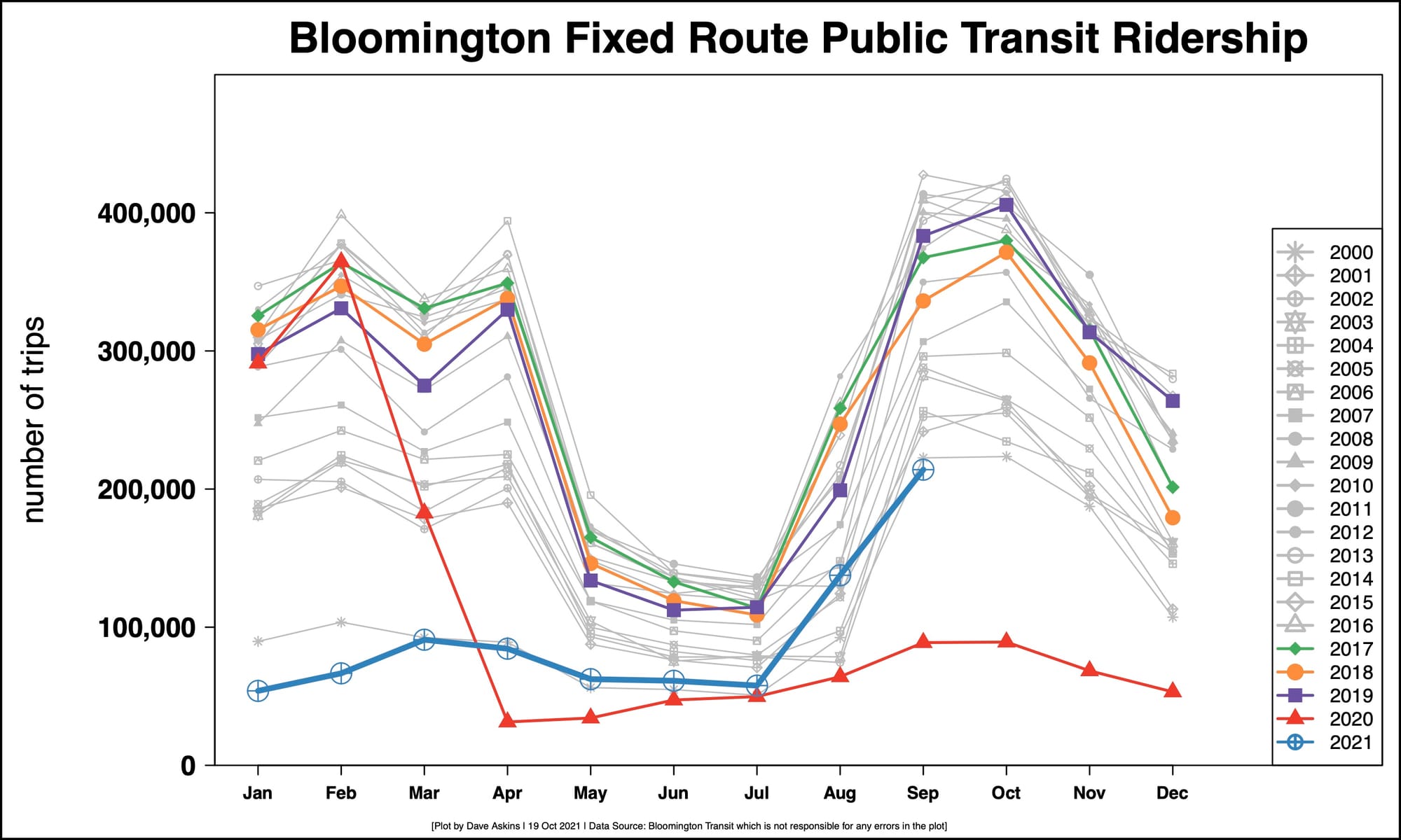 This year, the monthly ridership numbers for September showed the kind of seasonal jump from August that’s normally associated with the start of Indiana University’s fall semester: 214,000 rides in September compared to 138,000 in August. That means they’re also sharply up from the 88,000 rides given in September 2020, when the university delivered its instruction remotely, due to the pandemic.