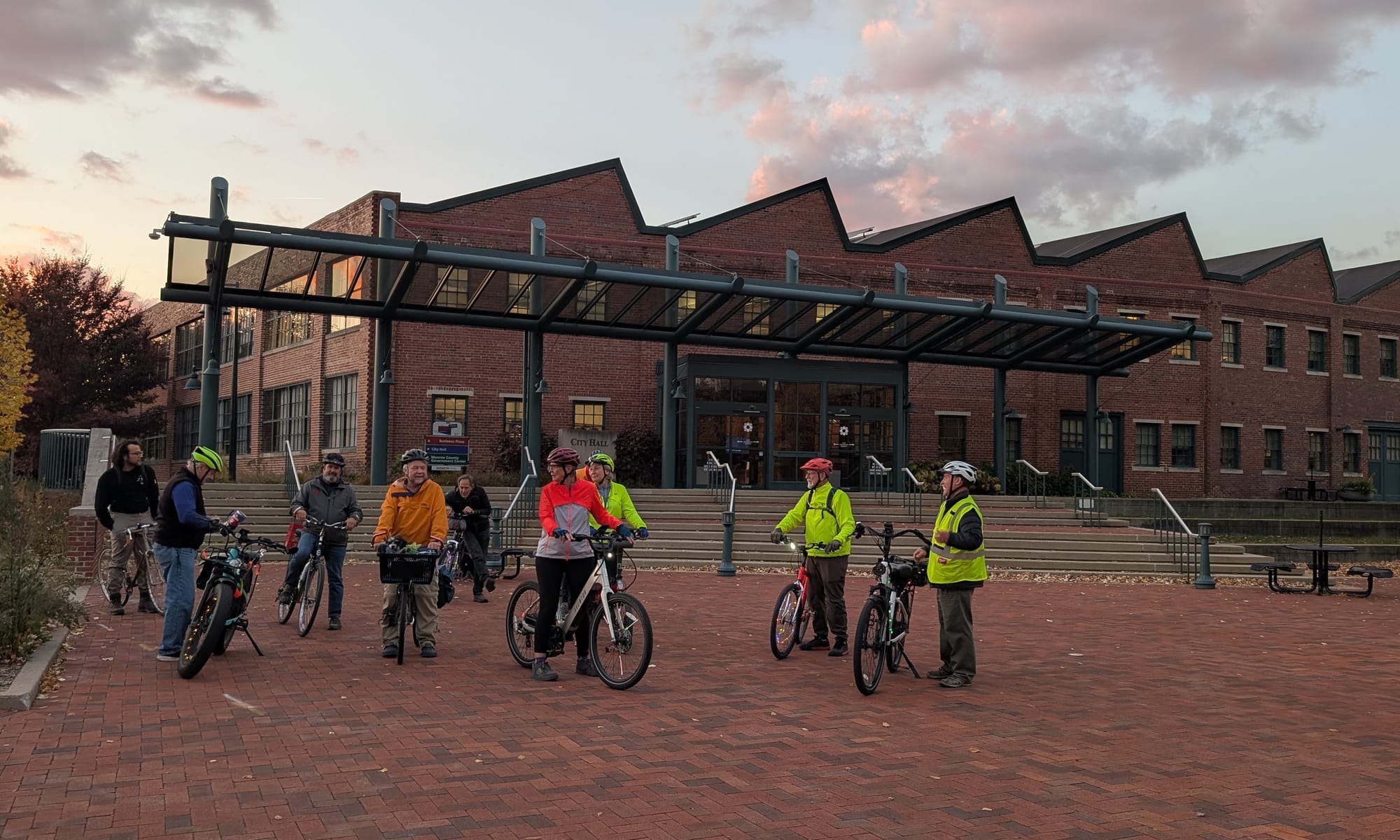 A group of cyclists is assembled on Fernandez Plaza in front of city hall ready to leave for their regular ride on the occasion of the full moon.