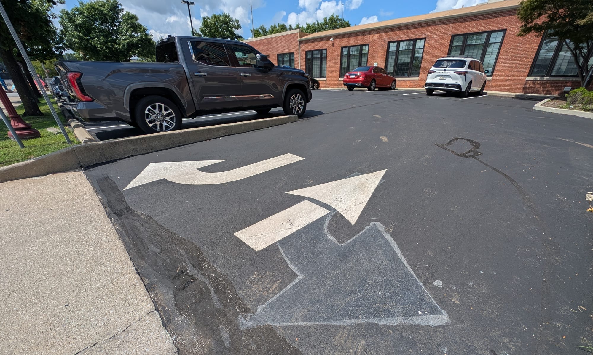 The new markings on the Bunger & Robertson Parking lot were redone so that the arrow inviting motorists to turn left onto 3rd Street out of the parking lot now invites motorists to enter the parking lot