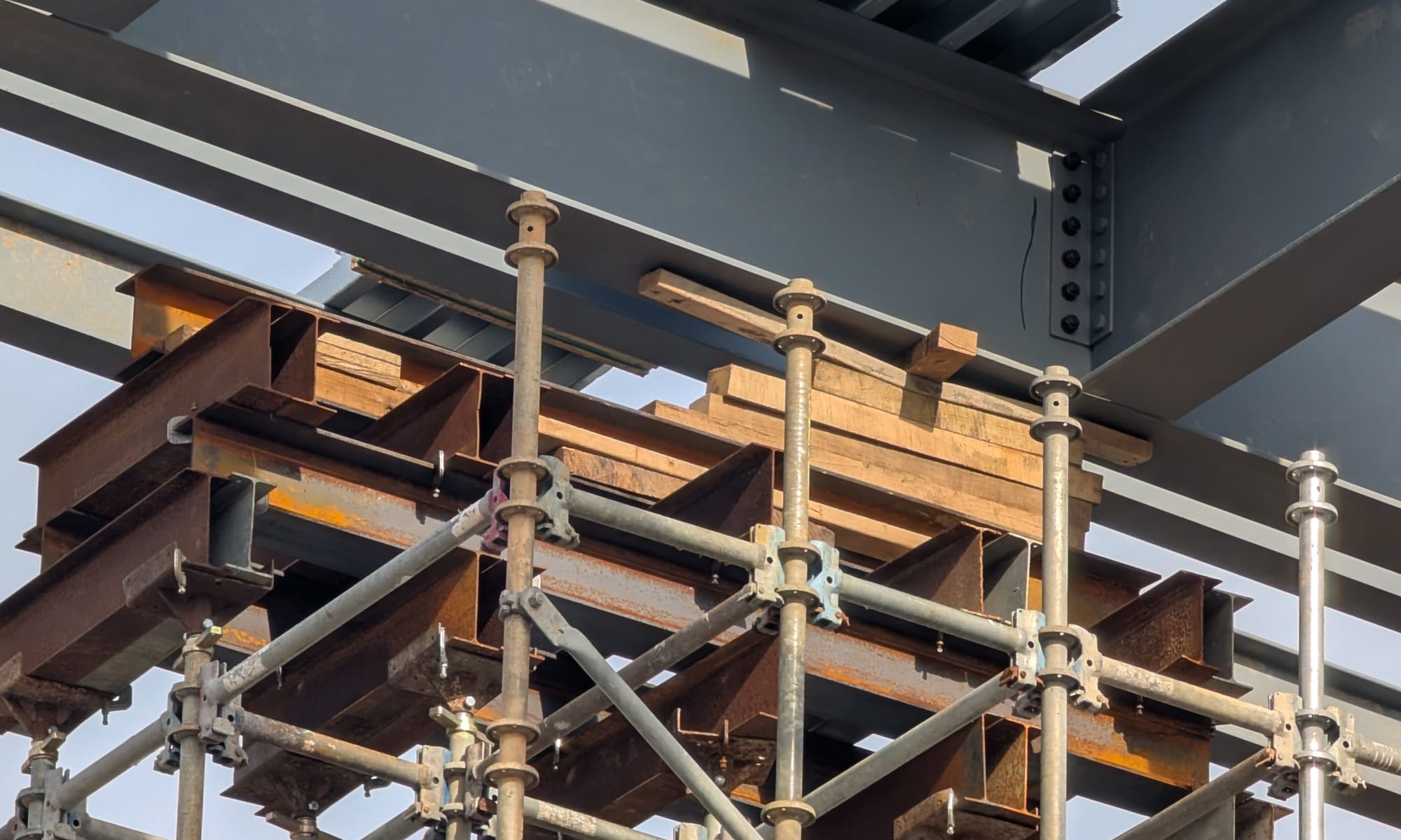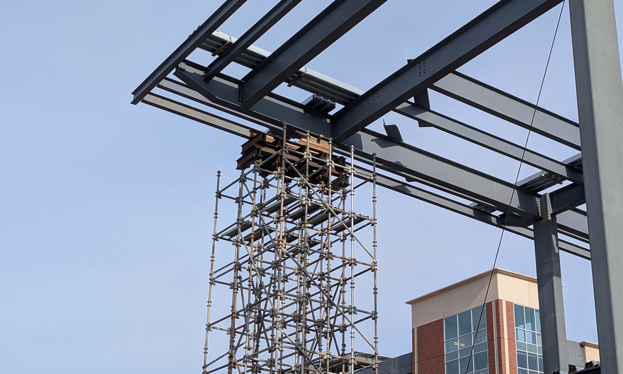There is a tower of scaffolding under the corner of the steel skeleton that is being erected for the convention center expansion with wooden blocks to support the corner where the beams come together. It’s a precautionary measure to deal with a 30-foot cantilever.