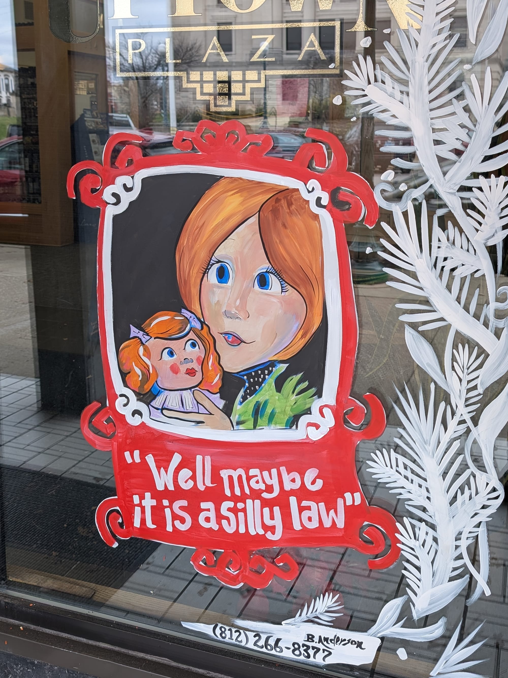 The store window at Goods for Cooks is painted with a vignette from "Santa Claus is Coming to Town" and a quote: “Well maybe it _is_ a silly law.” The artist is Bre Anderson.