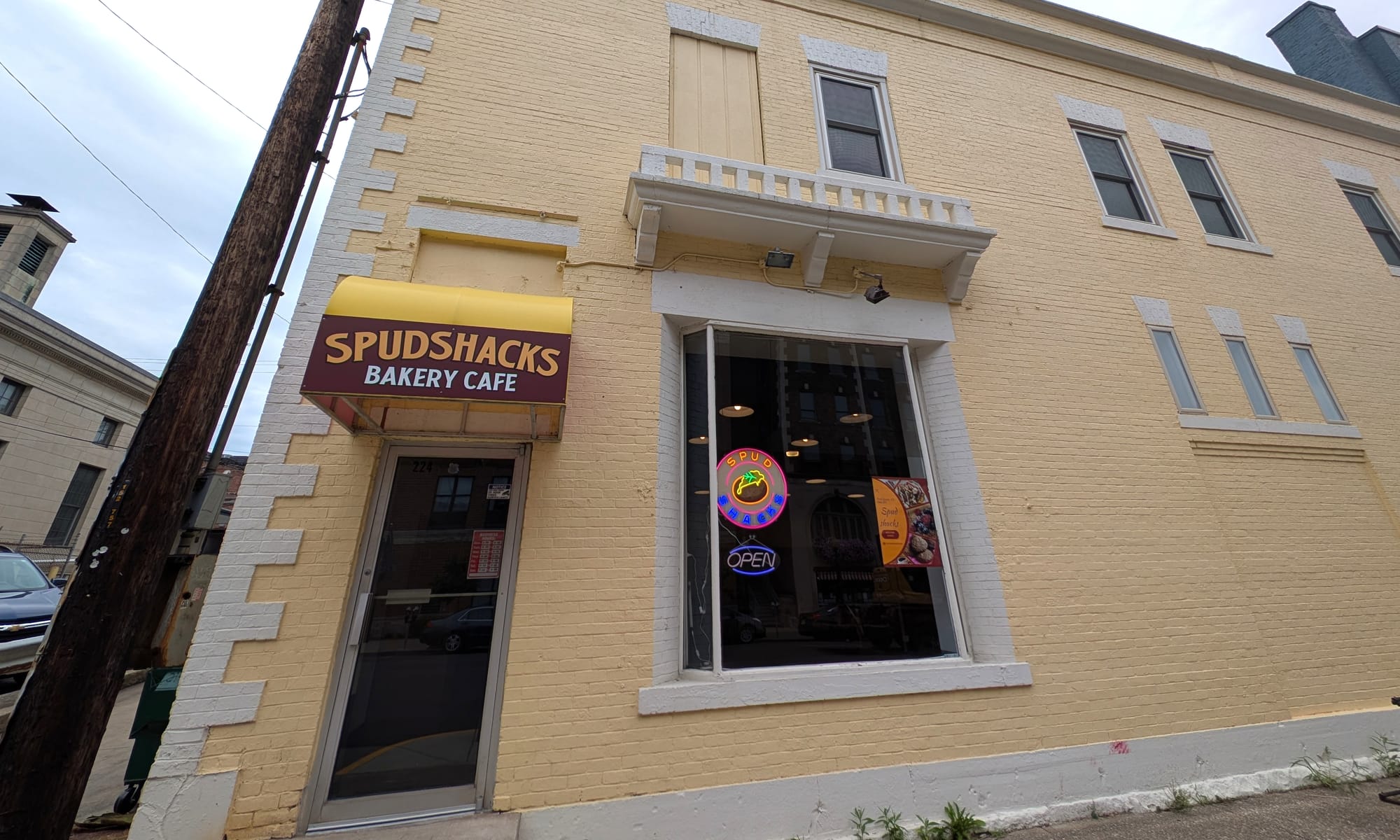 Today was the first day of business for Spudshacks Bakery Cafe. As the name suggests, loaded baked potatoes are a main offering. They will also sell you a cookie.