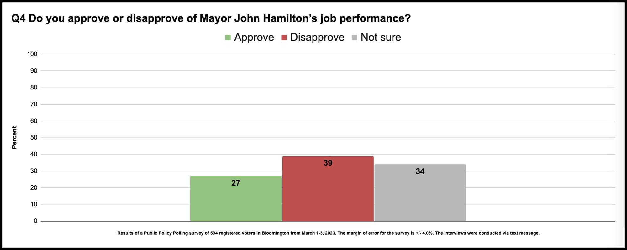 I don’t think the Bloomington mayor’s approval rating gets routinely polled by the local press. In any case, I could not find any historical numbers against which to judge Hamilton’s results.