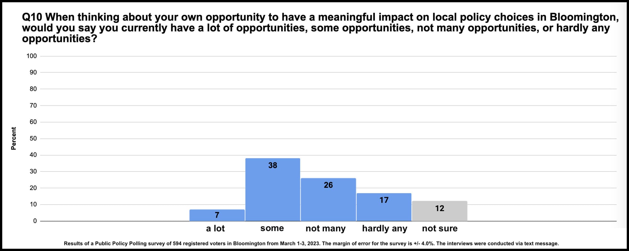 The text-to-web poll was conducted from March 1-3, 2023, and received completed responses from 594 registered voters in Bloomington. The margin of error for the survey was +/- 4.0%.