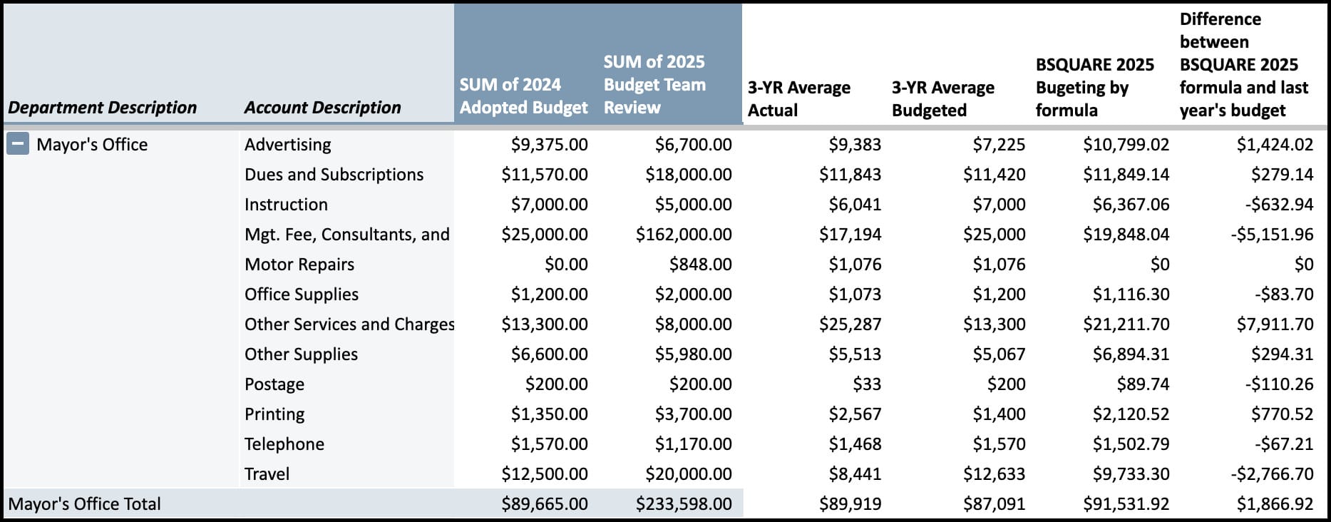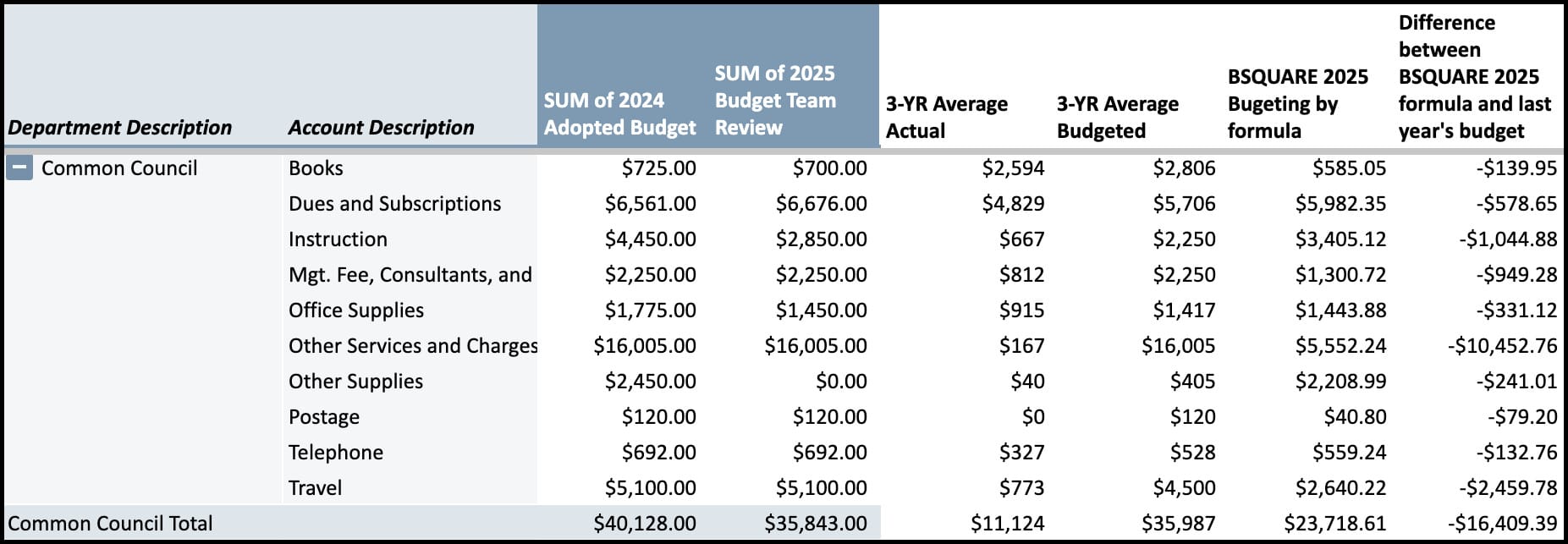 For each line, The B Square then calculated the average of expenditures for the last three full years (2021, 2022, and 2023) and the average of adopted budgeted amounts. The B Square then took the 2024 approved amount and subtracted 66 percent of the difference between adopted and actual expenditures, and set that number as the “formula budget” for 2025.