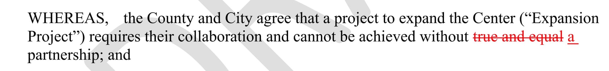 An initial attempt to draft a revised MOU to extend the steering committee’s work foundered on revisions proposed by the city that struck the phrase “true and equal” as a modifier of the word “partnership.”