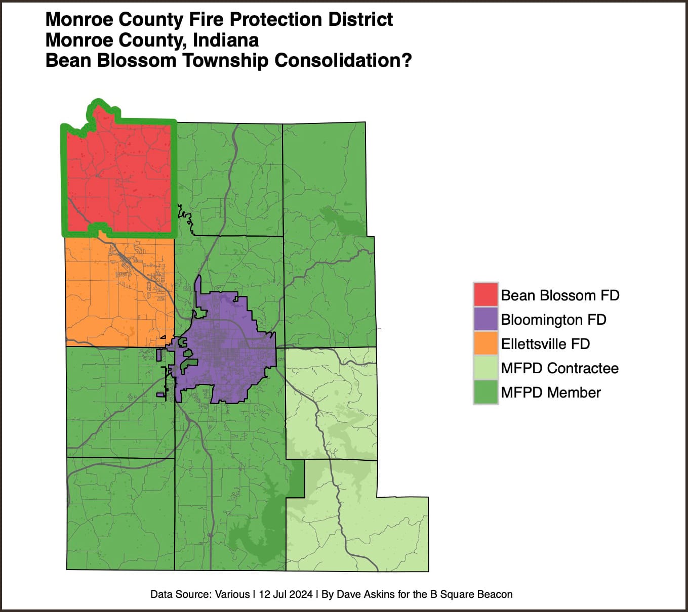 As the Monroe Fire Protection District added townships as members, that reduced the number of fire departments in the county to four—Monroe Fire Protection District (MFPD), Bloomington fire department, Ellettsville fire department, and Bean Blossom Township fire department.