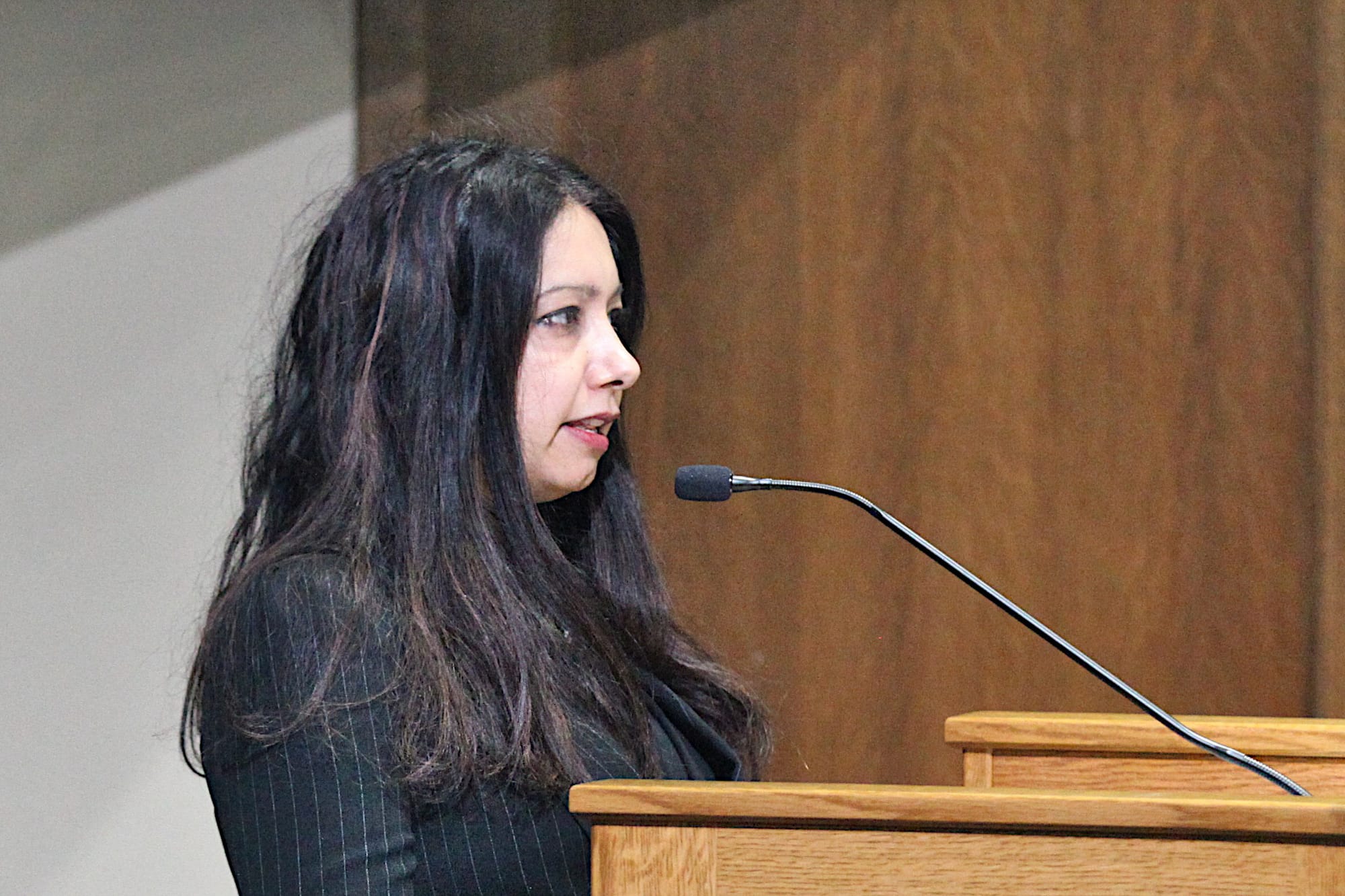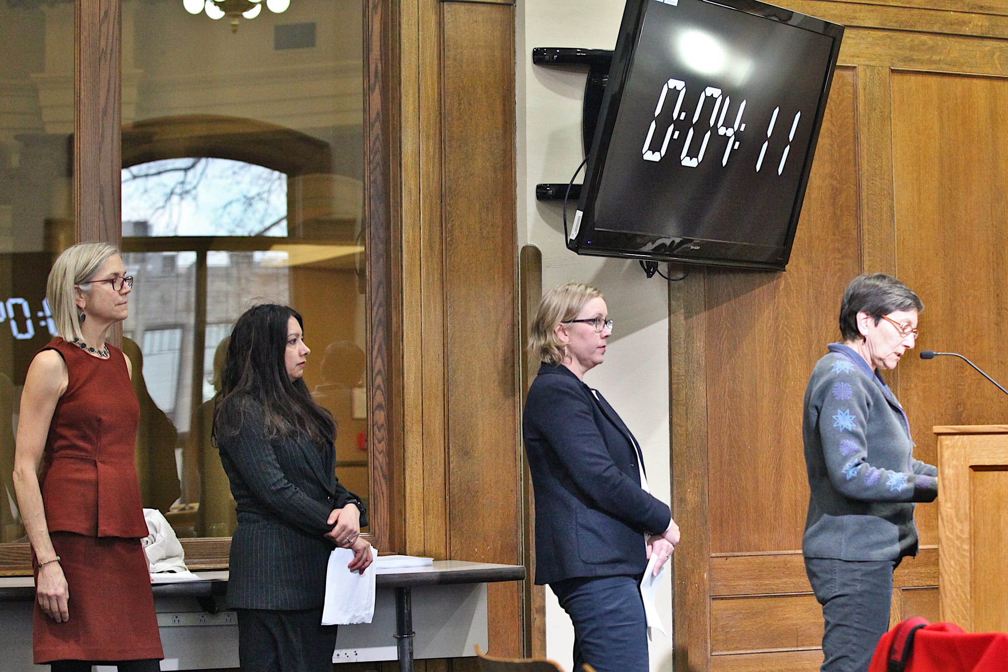 Photo 1: IJTF members (from left) Cathi Crabtree, Shruti Rana, Christie Popp, and Jane Grant, deliver public commentary at the Feb. 11, 2020 meeting of Monroe County’s council. Photo 2: IJTF member Cathi Crabtree. Photo 3: County councilor Trent Deckard. Photo 4: Shruti Rana, IJTF member and professor at Indiana University’s Hamilton Lugar School of Global and International Studies, delivers public commentary to Monroe County’s council. Photo 5: County councilor, Kate Wiltz. Photo 6: County councilor Eric Spoonmore.