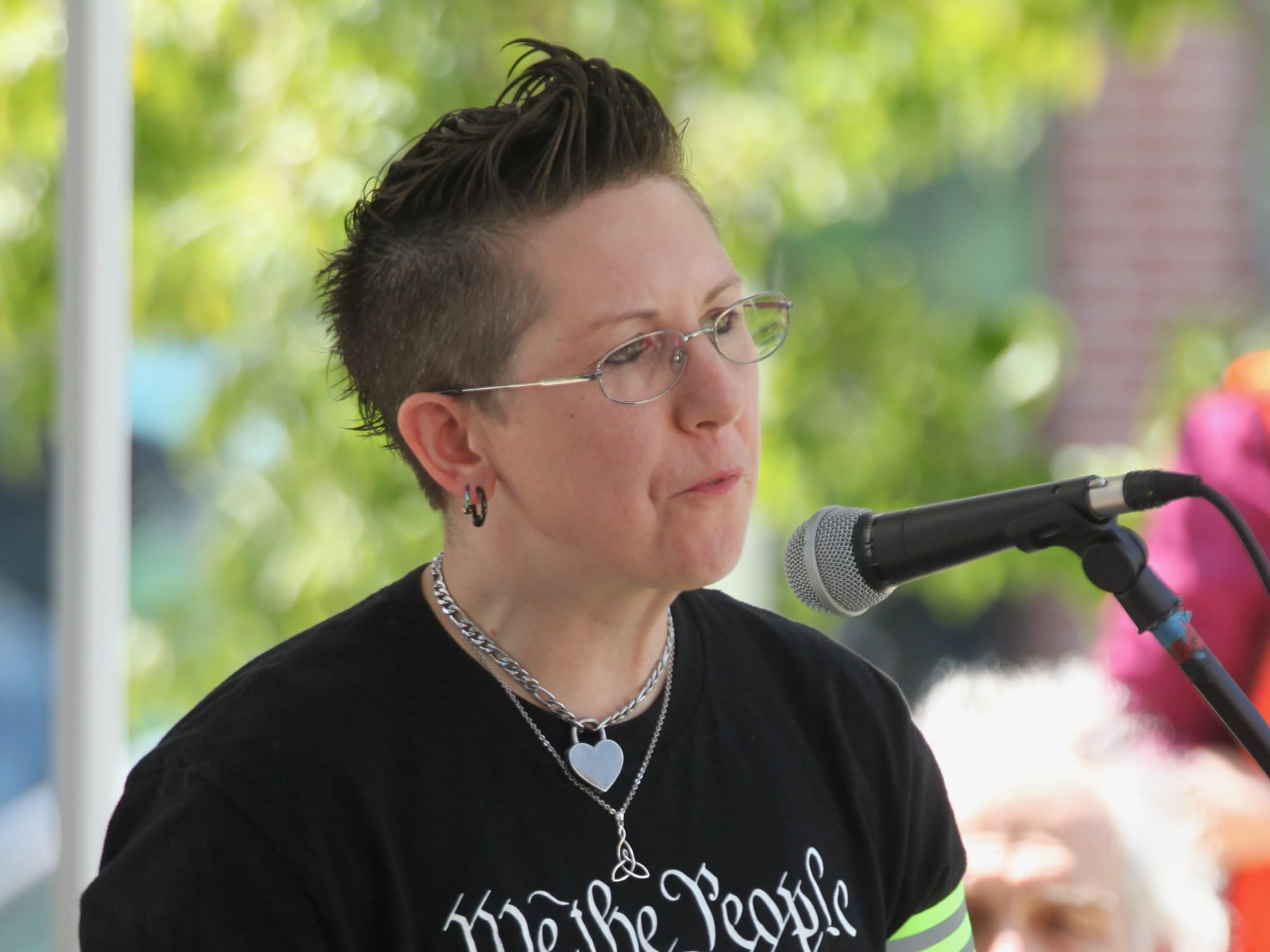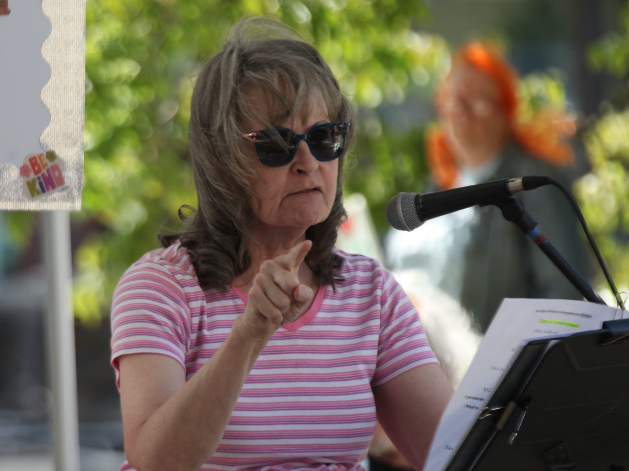 Julie Borum, described on the speaker list as a “grandmother activist” addressed the president in her remarks: “Donald, we the people, stand together to peacefully, passionately and powerfully resist this regime …” She continued, “We can do this by supporting reputable news sources. For me, that’s NPR. We need real journalism, not brainless puppets that simply tolerate lies.”