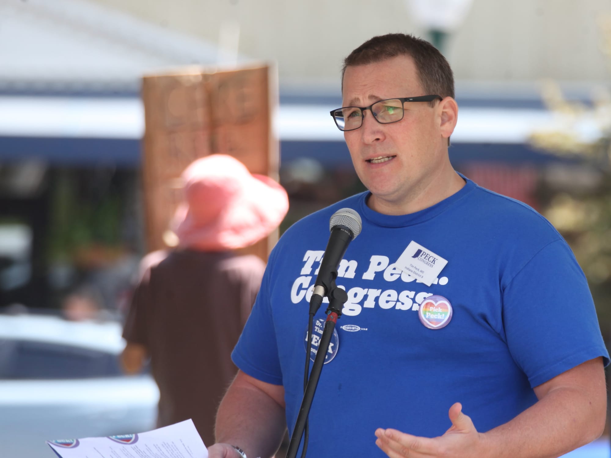 Tim Peck is an emergency room physician and Democratic Party primary candidate for the Indiana District 9th District congressional seat, who on Saturday talked about the nonpartisan nature of health care. Peck said, “I’ve never set a Republican broken bone. I’ve never set an independent broken bone. I’ve only treated mothers and fathers and daughters and sons and neighbors… Health care is a human right, and you have the right to help.” Peck urged the crowd to “vote like your life depends on it, because it literally does.”