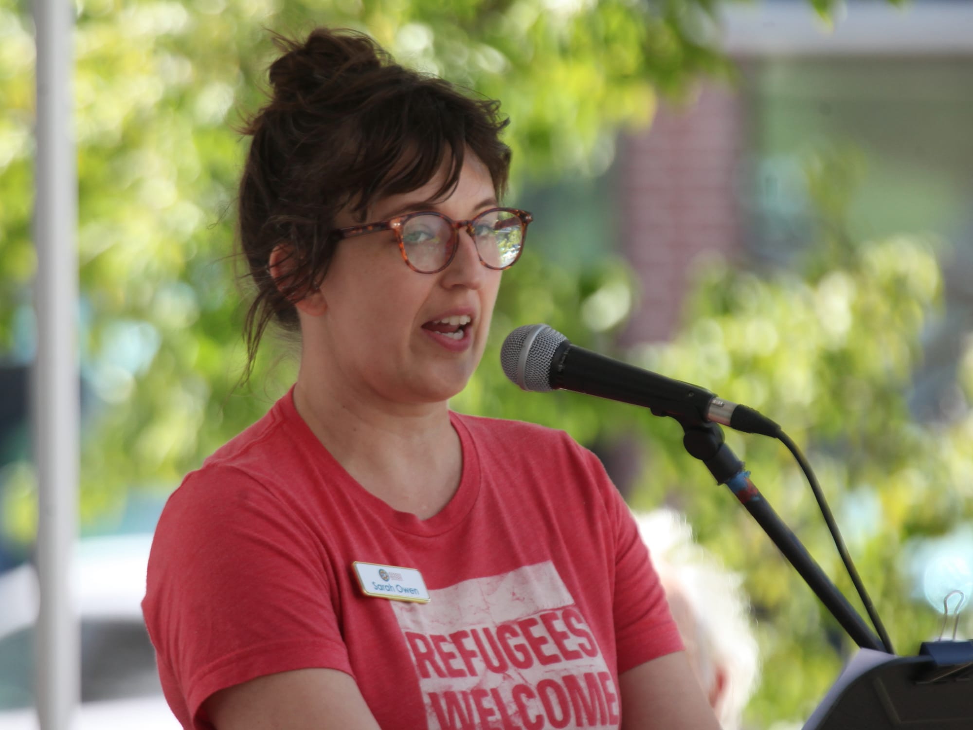 Sarah Owen, who is the community engagement coordinator for Exodus Refugee Immigration, spoke about the impact of federal policies on immigrants and refugees: “This President’s immigration policies are absolute moral catastrophes, and they try to justify their actions with lies, slander and prejudice against immigrants.” Owen highlighted efforts in the Bloomington area to protect vulnerable neighbors and called on the crowd to “use your vote against this injustice when the time comes, because the midterm elections will be here very soon …”